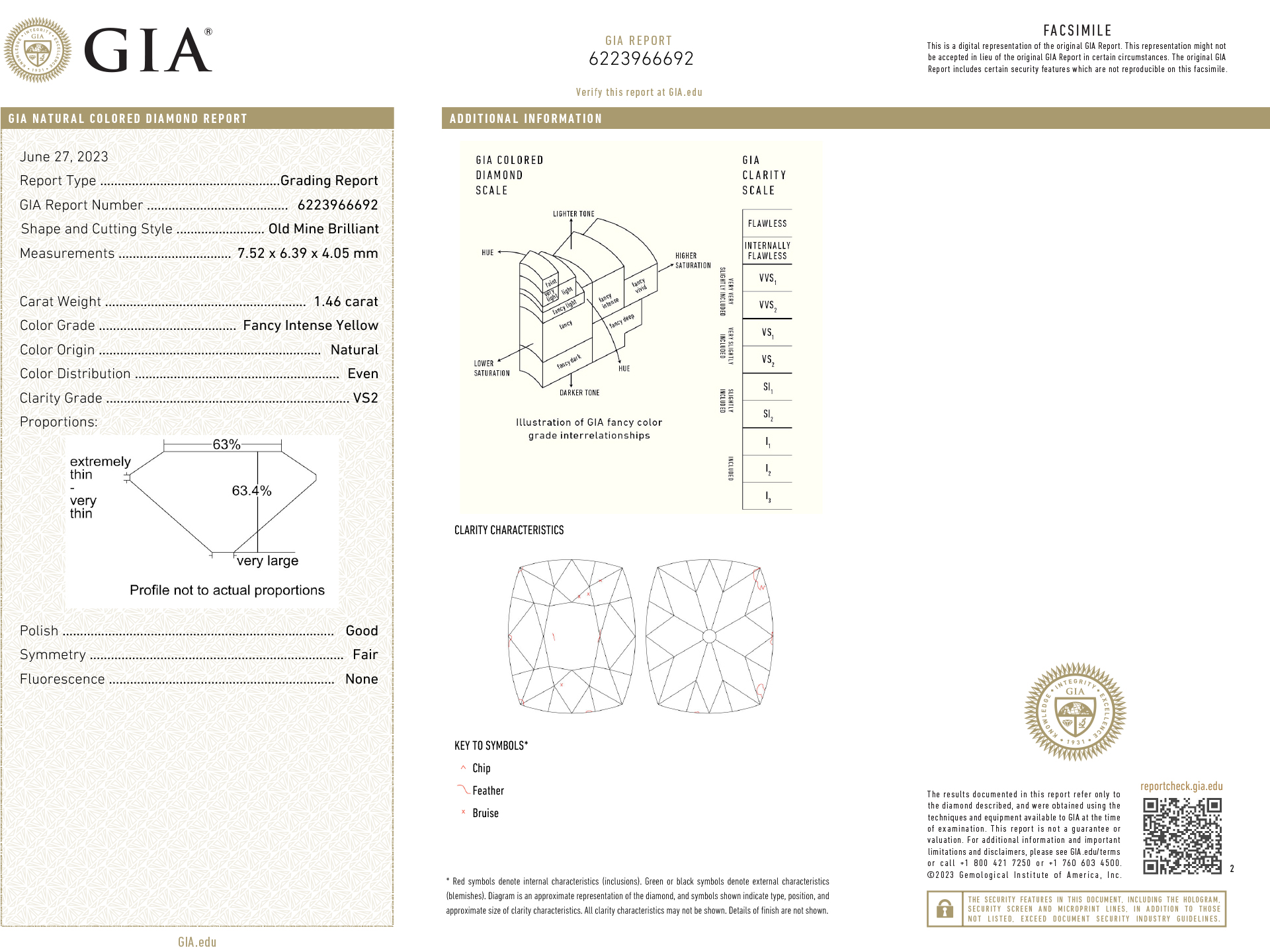 Fancy intense yellow diamond three stone ring. Set to centre with a cushion shape old mine natural fancy intense yellow diamond, VS2 clarity, with a weight of 1.46 carats in an open back claw setting, flanked by two cushion shape old mine diamonds in open back claw settings with a combined approximate weight of 1.10 carats. The total approximate diamond weight is 2.56 carats, to a graduating three stone design featuring split claws, an intricately pierced gallery and fancy shape open backholing, leading to raised shoulders and flowing through to a solid D-shape shank. Tested platinum, circa 1920, accompanied by Gemological Institute of America (GIA) report #6223966692.