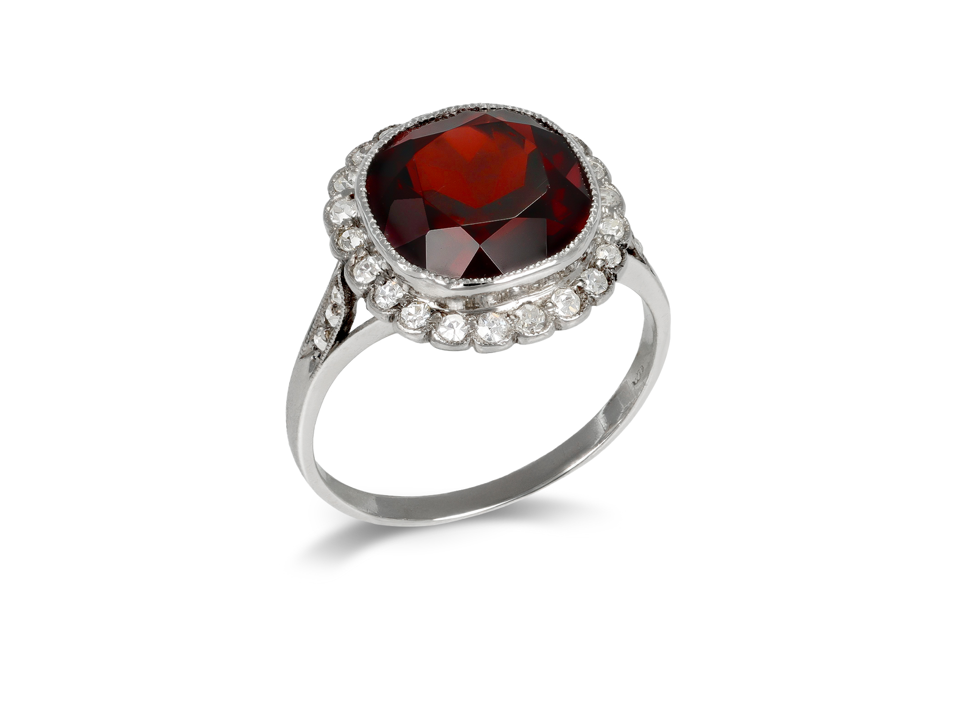 Garnet and diamond coronet cluster ring. Set to centre with a cushion shape old cut natural garnet in an open back rubover setting with an approximate weight of 4.50 carats, further set with twenty-eight round eight cut diamonds in open back grain and rubover settings with a combined approximate weight of 0.45 carats, to an elegant coronet cluster design featuring scalloped millegrain borders, a decoratively pierced gallery and fancy shape open backholing, leading to raised tri-split shoulders which flow through to a solid shank. Tested platinum, circa 1915.