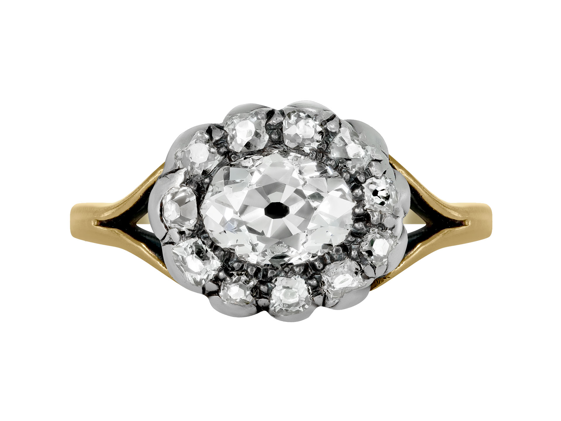 Georgian diamond cluster ring. Set to centre with a cushion shape old mine diamond in a closed back grain setting with an approximate weight of 0.80 carats, further set with eleven cushion shape old mine diamonds in closed back cut-down settings with a combined weight of 0.55 carats. The total approximate diamond weight is 1.35 carats to an elegant cluster design featuring scalloped edging, a ridged gallery and closed gadrooned back, leading to split shoulders which flow through to a solid shank. Tested yellow gold, settings tested silver, circa 1830.