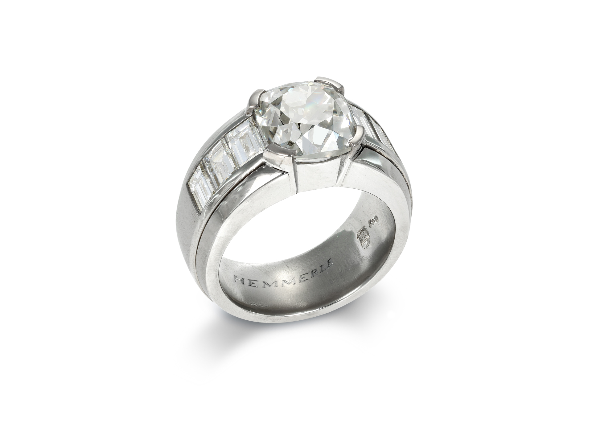 Hemmerle 5.27ct Diamond flanked solitaire ring, German.
