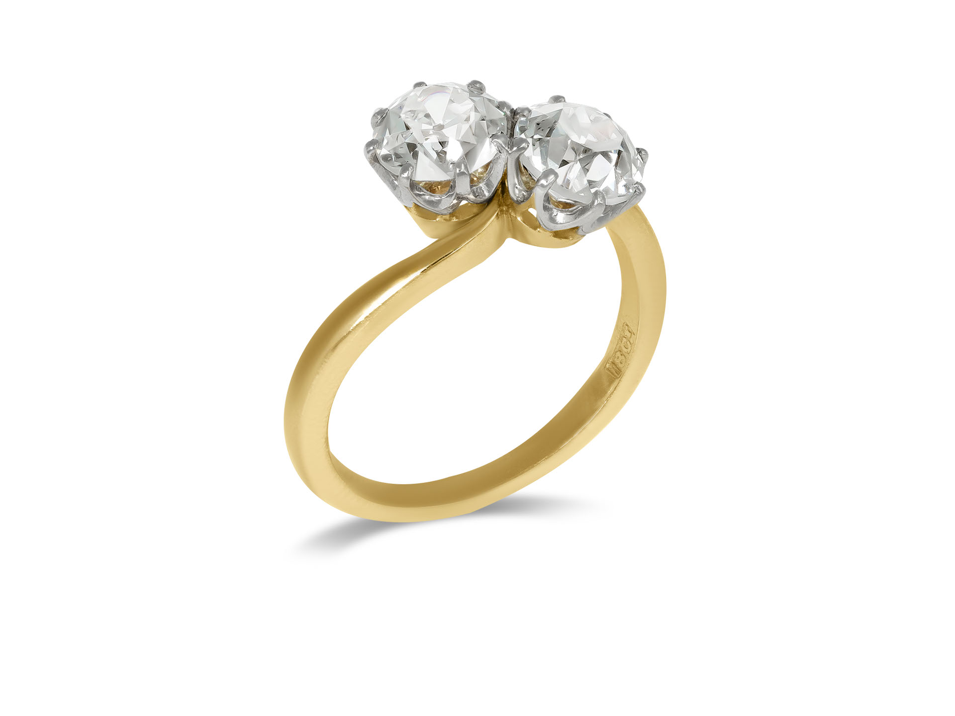 Old cut diamond crossover ring. Set with two round old cut diamonds, one J colour, SI2 clarity, with a weight of 1.12 carats, the other I colour, SI1 clarity, with a weight of 1.15 carat, both in open back claw settings with a combined weight of 2.27 carats, to an elegant crossover design featuring curving claws, a pierced gallery and open backholing, leading to inwardly tapering asymmetric shoulders, flowing through to a solid D-shape shank. Marked 18 carat yellow gold and platinum, circa 1910, English, accompanied by Gemological Institute of America (GIA) reports #6233487240 and #1232487965.