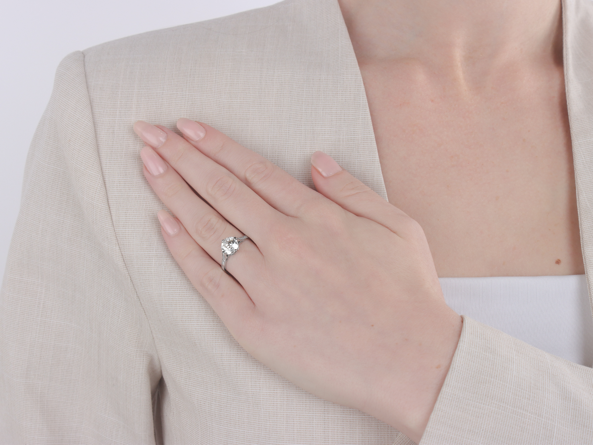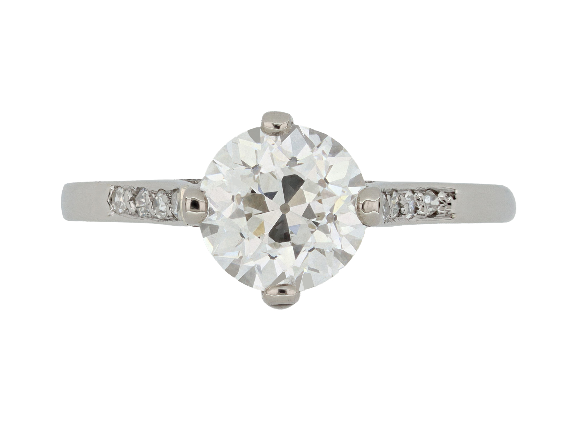 Old cut diamond flanked solitaire ring. Set centrally with a round old cut diamond, I colour, SI1 clarity, with a weight of 2.20 carats in an open back claw setting, further set with eight round old cut diamonds in open back grain settings with a combined approximate weight of 0.08 carats. The total approximate diamond weight is 2.28 carats, to an elegant solitaire design featuring curving claws, a finely pierced gallery and circular backholing, the gently inwardly tapering shoulders with chenier details flow through to a solid shank. Tested platinum, circa 1915, accompanied by Gemological Institute of America (GIA) report #2233780076.