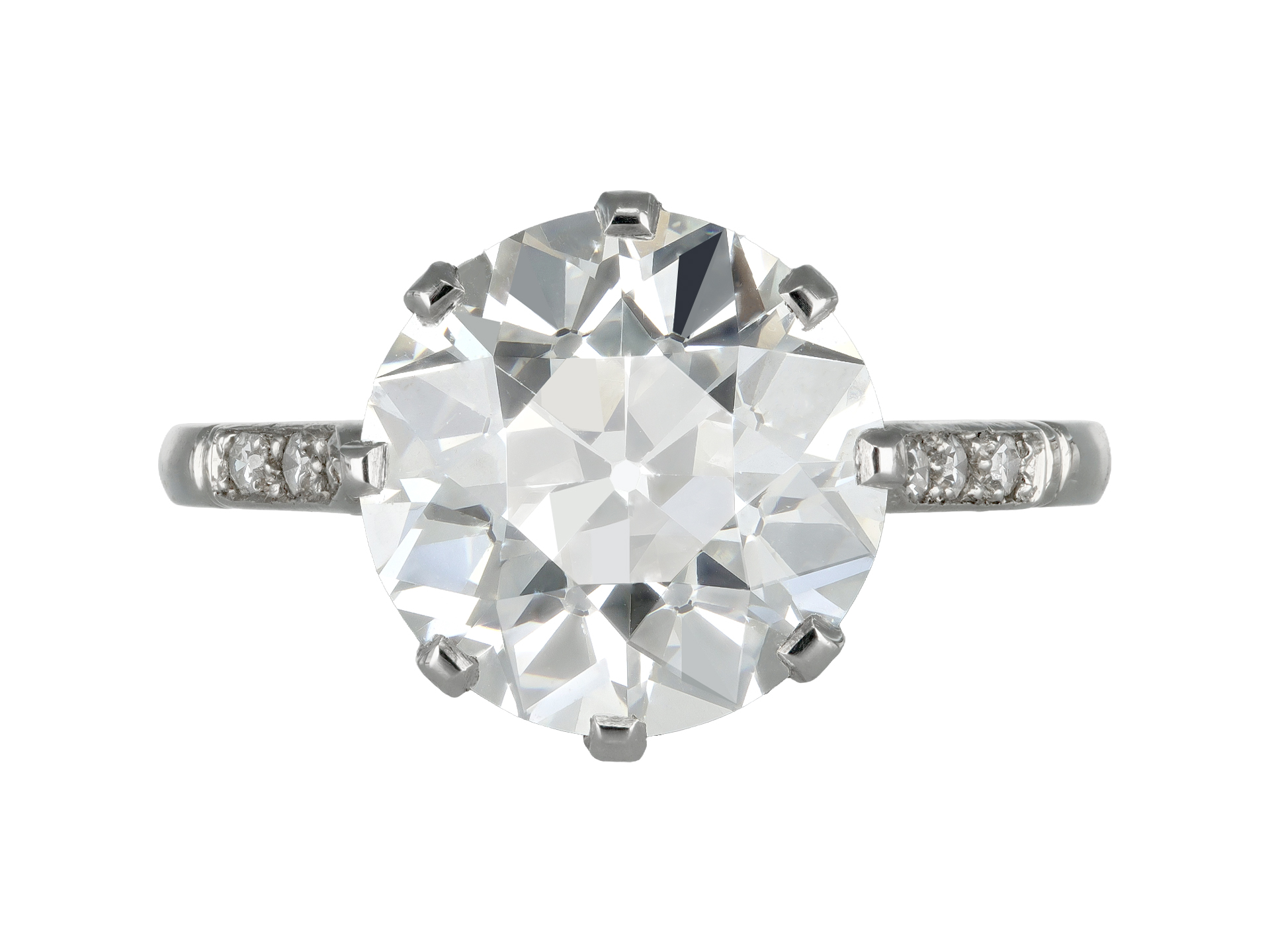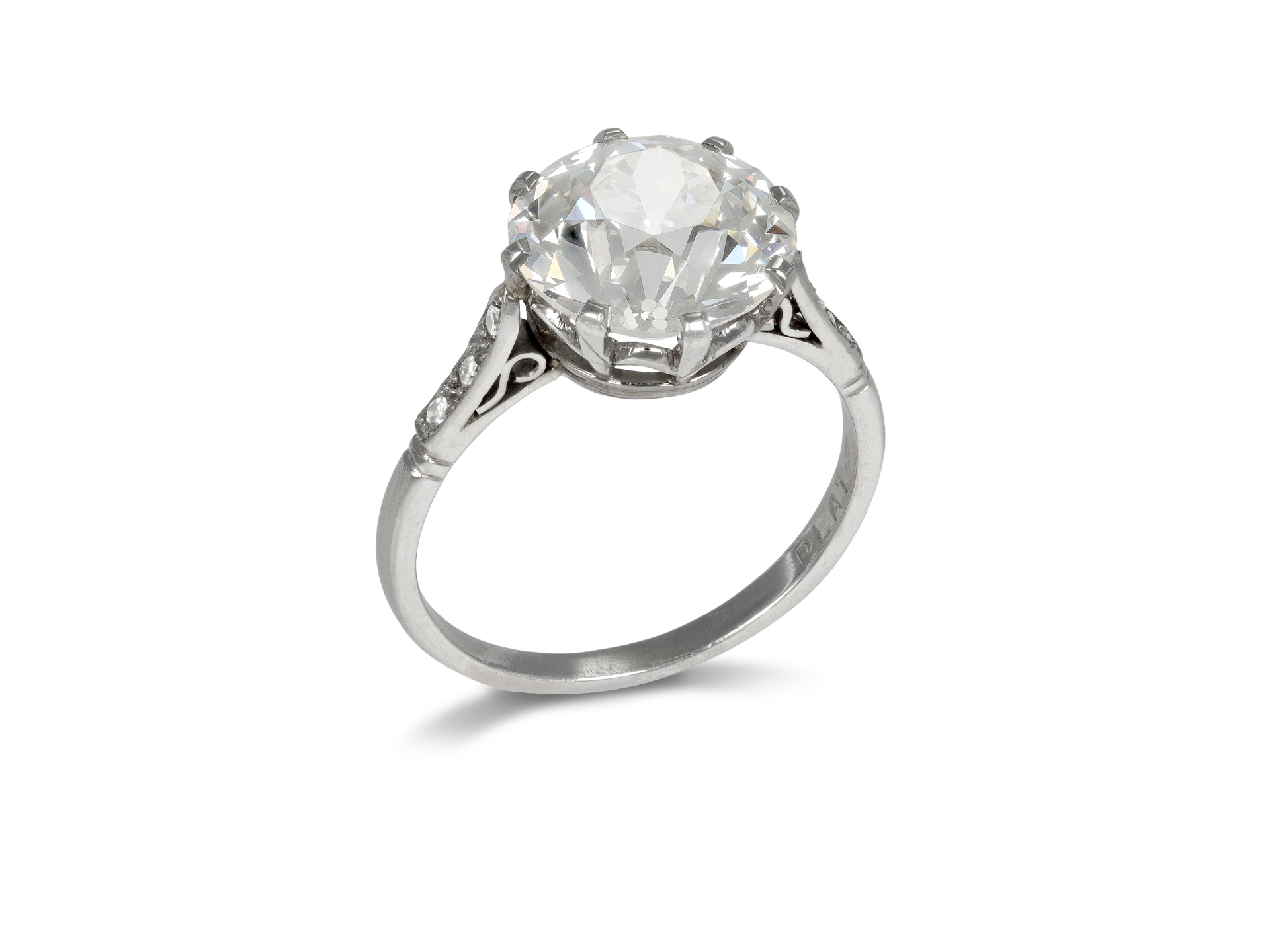 4.62 carat old cut diamond ring. Set centrally with a round old cut diamond, H colour, VS1 clarity, with an approximate weight of 4.62 carats in an open back claw setting, further set with six round single cut diamonds in open back grain settings with a combined weight of 0.06 carats. The total approximate diamond weight is 4.68 carats, to an elegant solitaire design featuring curving claws, a finely pierced gallery with scalloped detail and circular backholing, the gently sloping inwardly tapering shoulders with openwork curlicues flowing to a solid D-shape shank. Marked platinum, circa 1915, accompanied by Gemmological Certification Services report #5775-1965 and Gemological Institute of America report #5172205132.