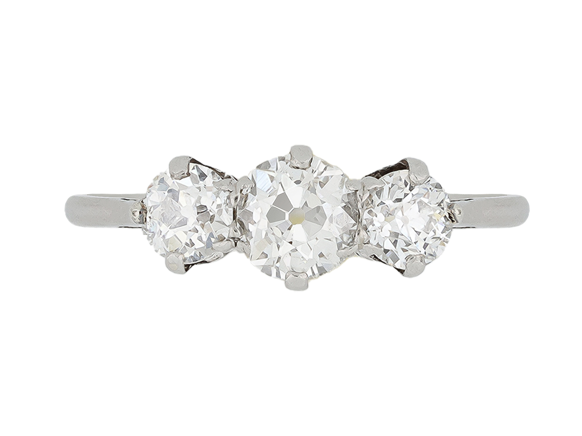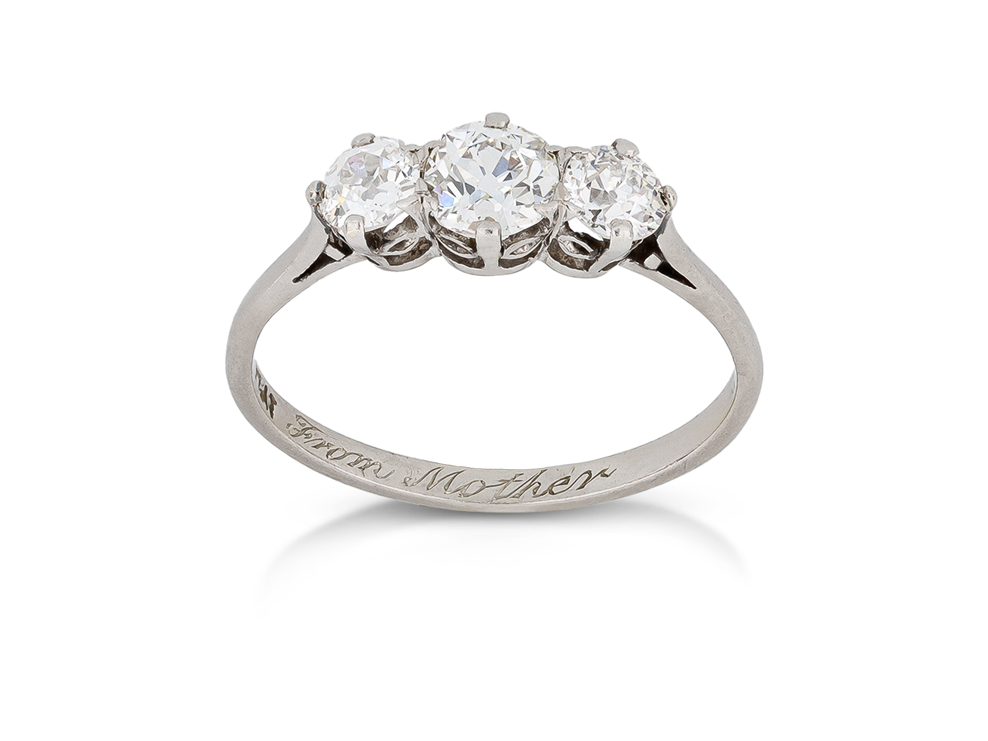 Old cut diamond three stone. Set to centre with a round old cut diamond in an open back claw setting with an approximate weight of 0.65 carats, flanked by two round old cut diamonds in open back claw settings with a combined weight of 0.60 carats. The total approximate diamond weight is 1.25 carats, to a graduating three stone design featuring curving claws, a decoratively pierced gallery and open circular backholing, leading to inwardly tapering raised shoulders which flow through to a solid D-shape shank. Marked platinum, engraved 'From Mother', circa 1915.