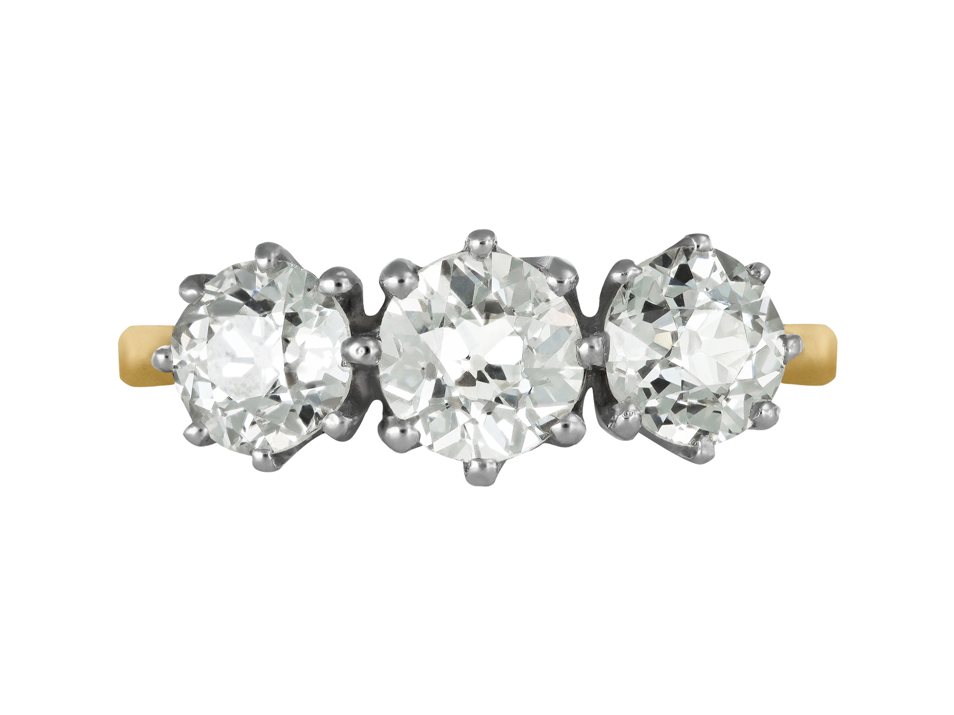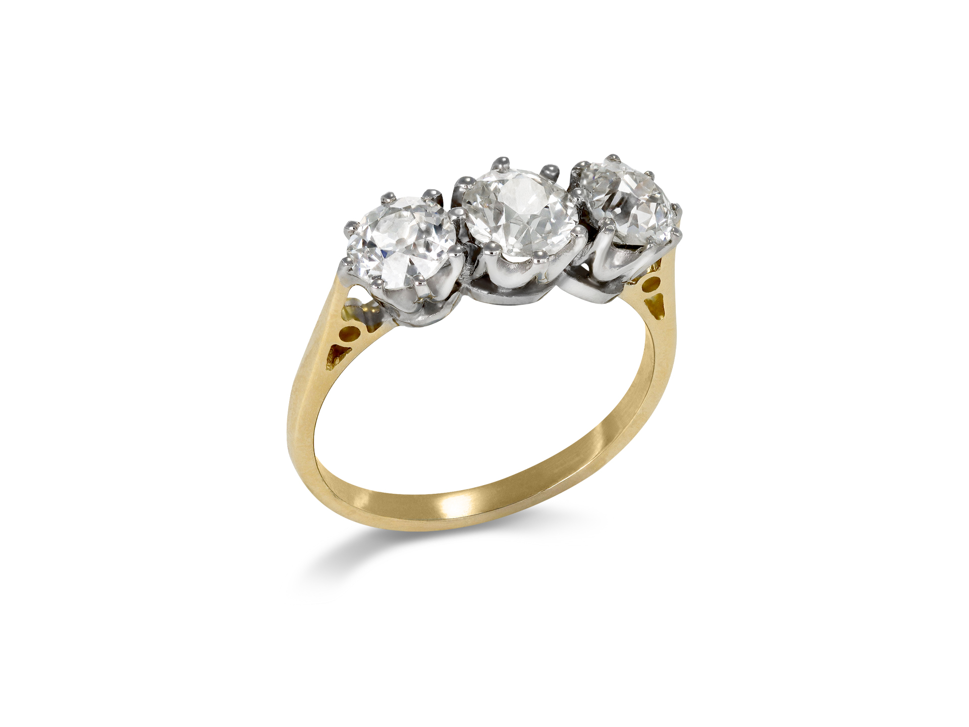 Old cut diamond three stone ring. Set to centre with a round old cut diamond in an open back claw setting with an approximate weight of 1.00 carats, flanked by two round old cut diamonds in open back claw settings with a combined weight of 1.75 carats. The total approximate weight is 2.75 carats, to an elegant three stone design featuring curving claws, an intricately pierced gallery and open circular backholing, leading to tapering raised shoulders with chenier details flowing through to a solid D-shape shank. Tested yellow gold and settings tested white gold, circa 1950.