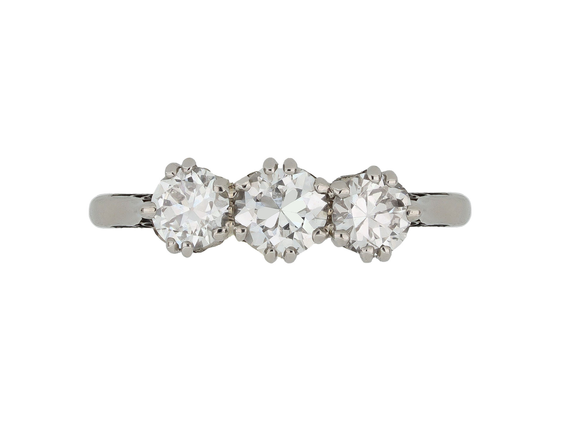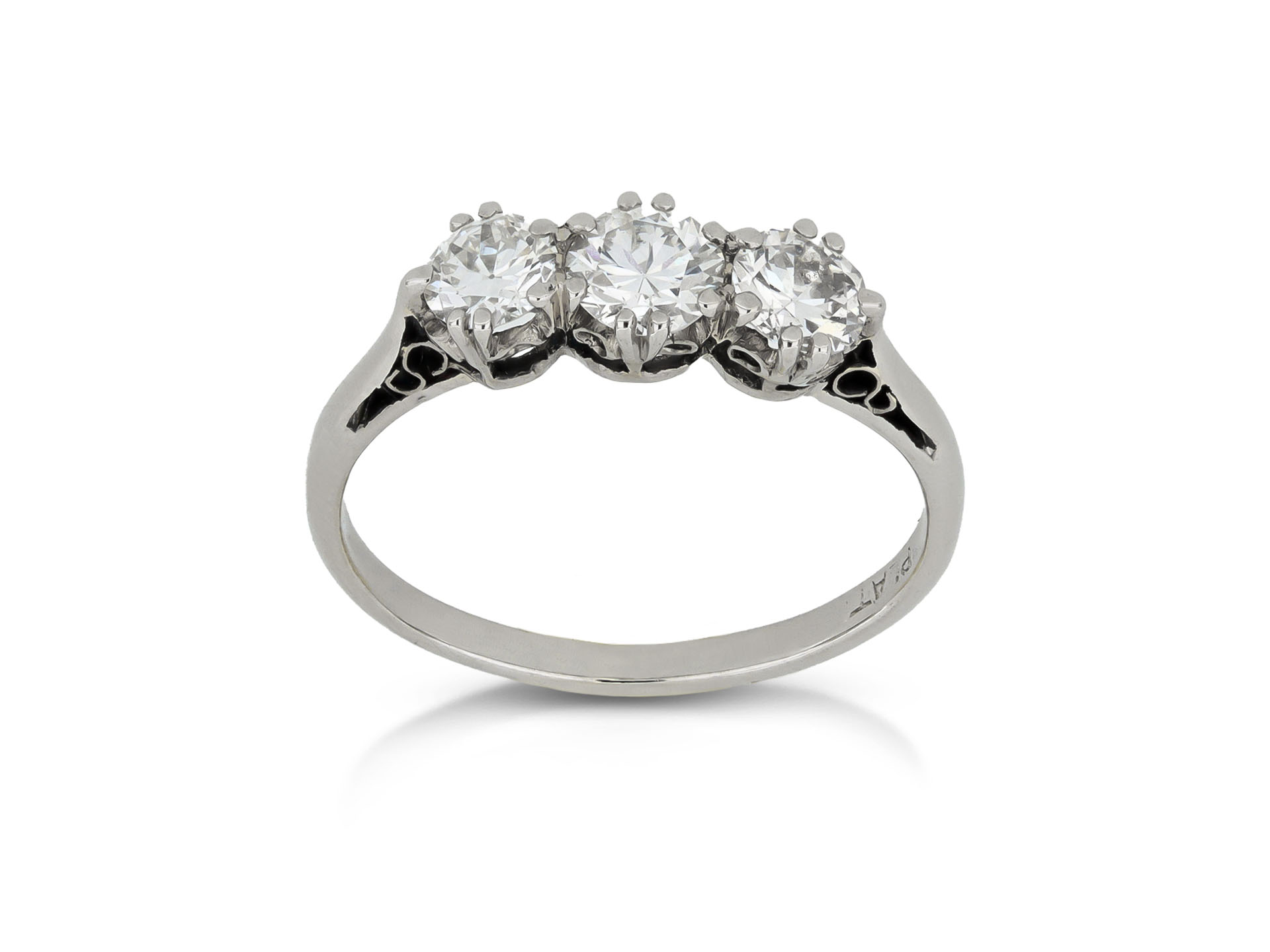 Old cut diamond three stone ring. Set with three round old cut diamonds in open back claw settings with a combined approximate weight of 0.90 carats, to an elegant three stone design featuring curving split claws, an intricately pierced gallery with chenier motifs and circular open backholing, leading to inwardly tapering shoulders with scrolling detail, and flowing through to a solid D-shape shank. Marked platinum, circa 1910.