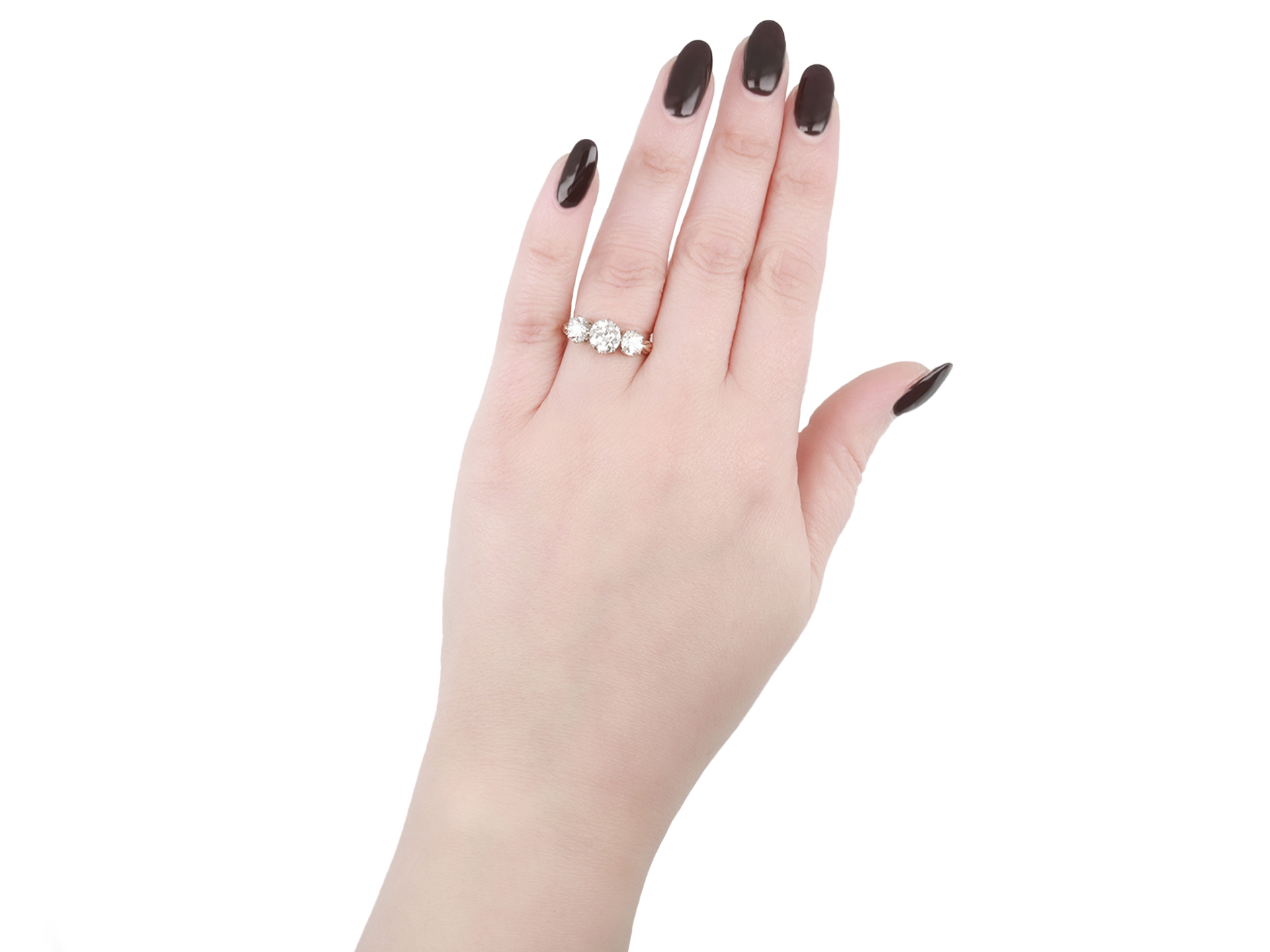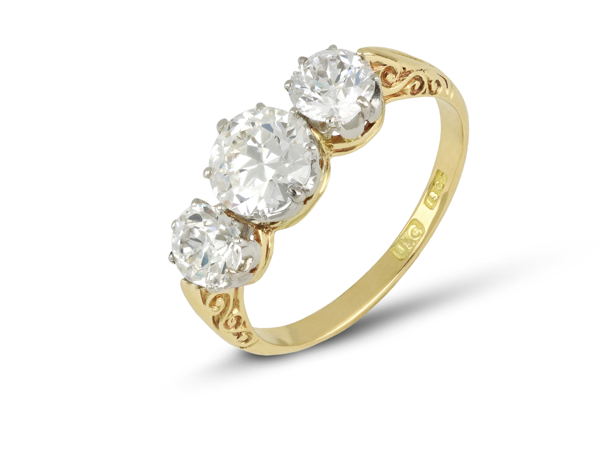 Old cut diamond three stone ring. Set to centre with a round old cut diamond in an open back claw setting with an approximate weight of 1.10 carats, flanked by two round old cut diamonds in open back claw settings with a combined weight of 1.05 carats. The total approximate diamond weight is 2.15 carats, all to an impressive graduated three stone design featuring curving claws, an intricately pierced gallery and fancy open backholing the ornately carved shoulders with scrolling motifs flowing through to a solid D-shape shank. Marked 18 carat gold, maker's mark 'U&C', circa 1905.