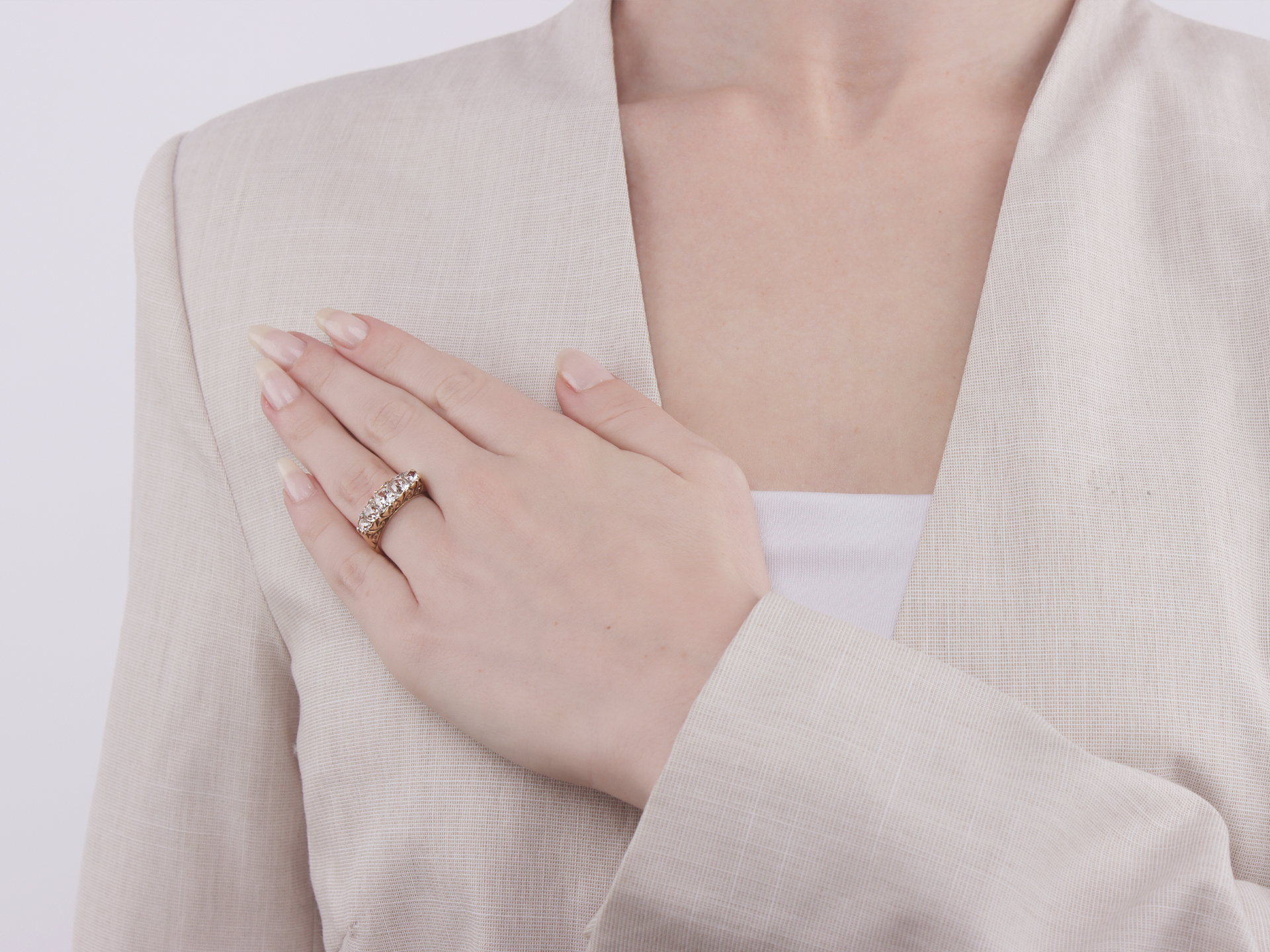 Old mine diamond five stone ring. Set horizontally with five oval old mine diamonds in open back claw settings with a combined approximate weight of 2.10 carats, adorned further with eight round rose cut diamonds in closed back grain and rubover settings with a combined weight of 0.05 carats. The total approximate diamond weight is 2.15 carats, to an impressive five stone design featuring stylised claws, an ornately carved gallery with scrolling motifs and square open backholing, leading to carved shoulders and flowing through to a solid D-shape shank. Tested yellow gold and silver, English, circa 1900.