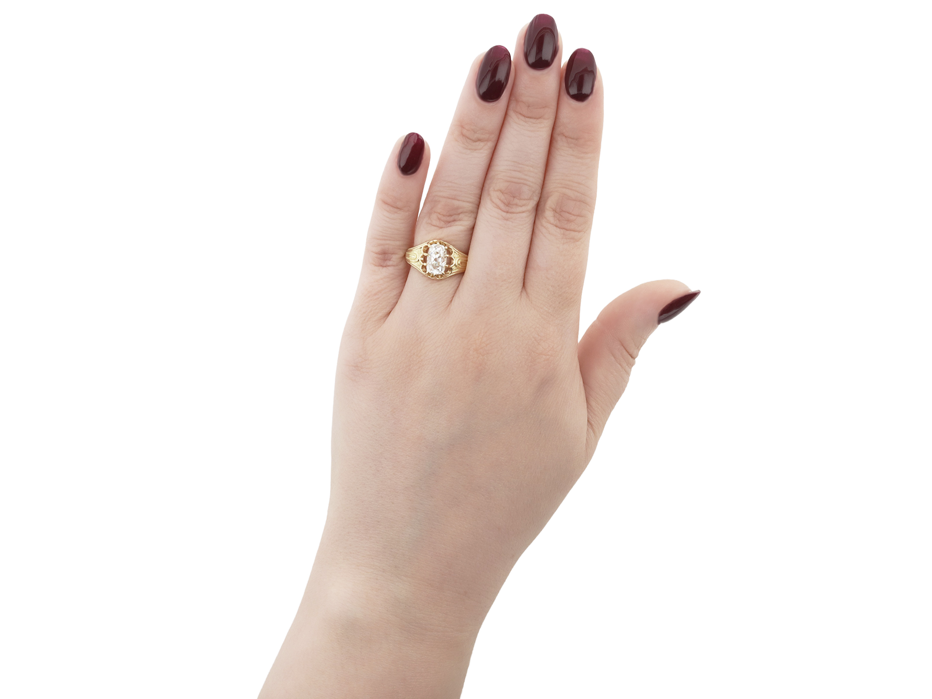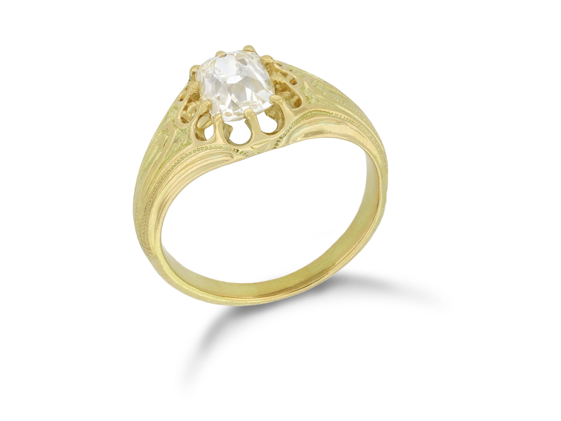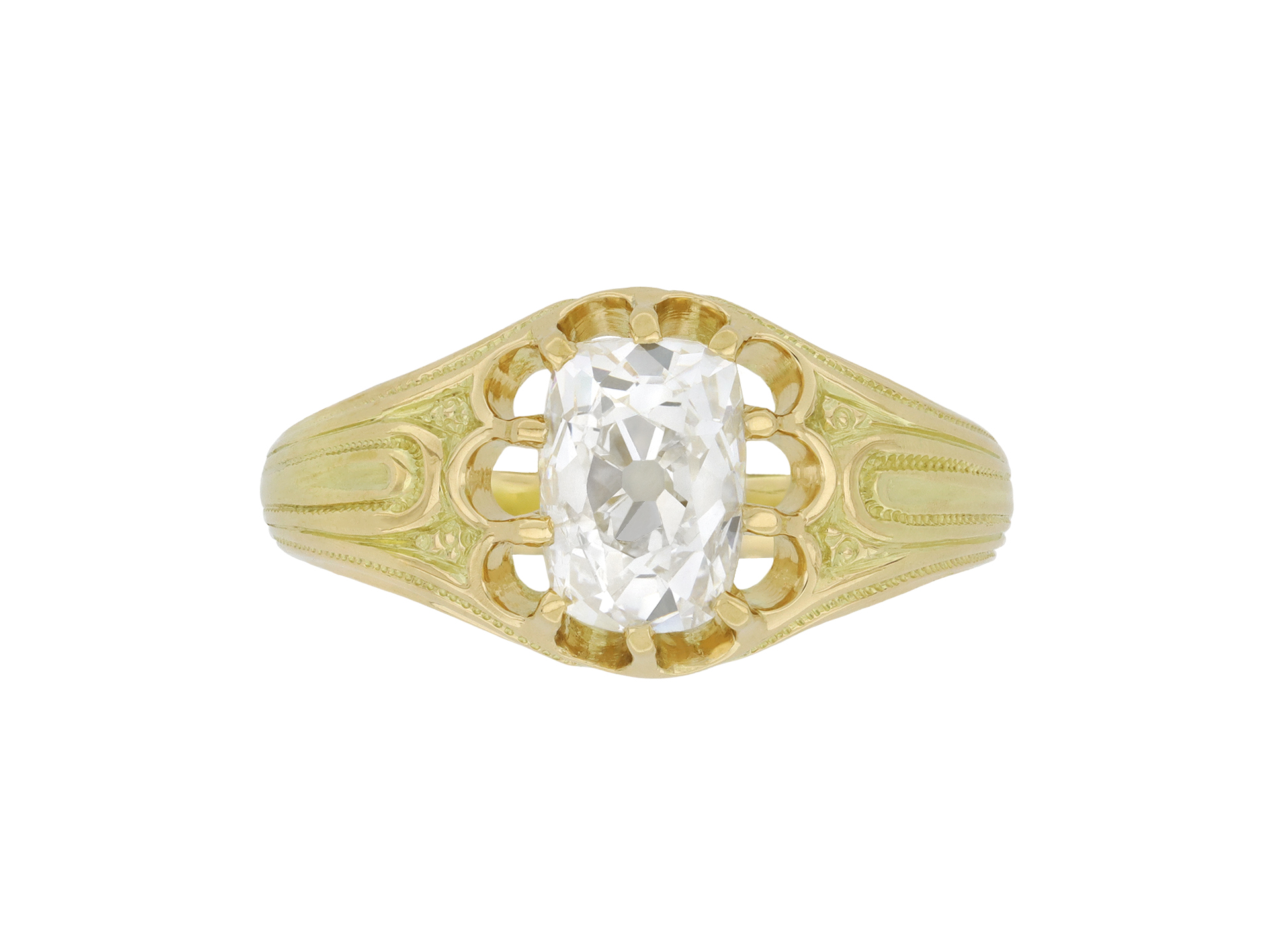 Old mine diamond solitaire ring. Set to center with a cushion shape old mine diamond with an approximate weight of 1.55 carats in an open back claw setting, to an impressive solitaire design featuring stylised claws, a openwork gallery and fancy open backholing, the trumpeting shoulders feature decorative carved details which flow down to a solid D-shape shank. Tested yellow gold, circa 1890.