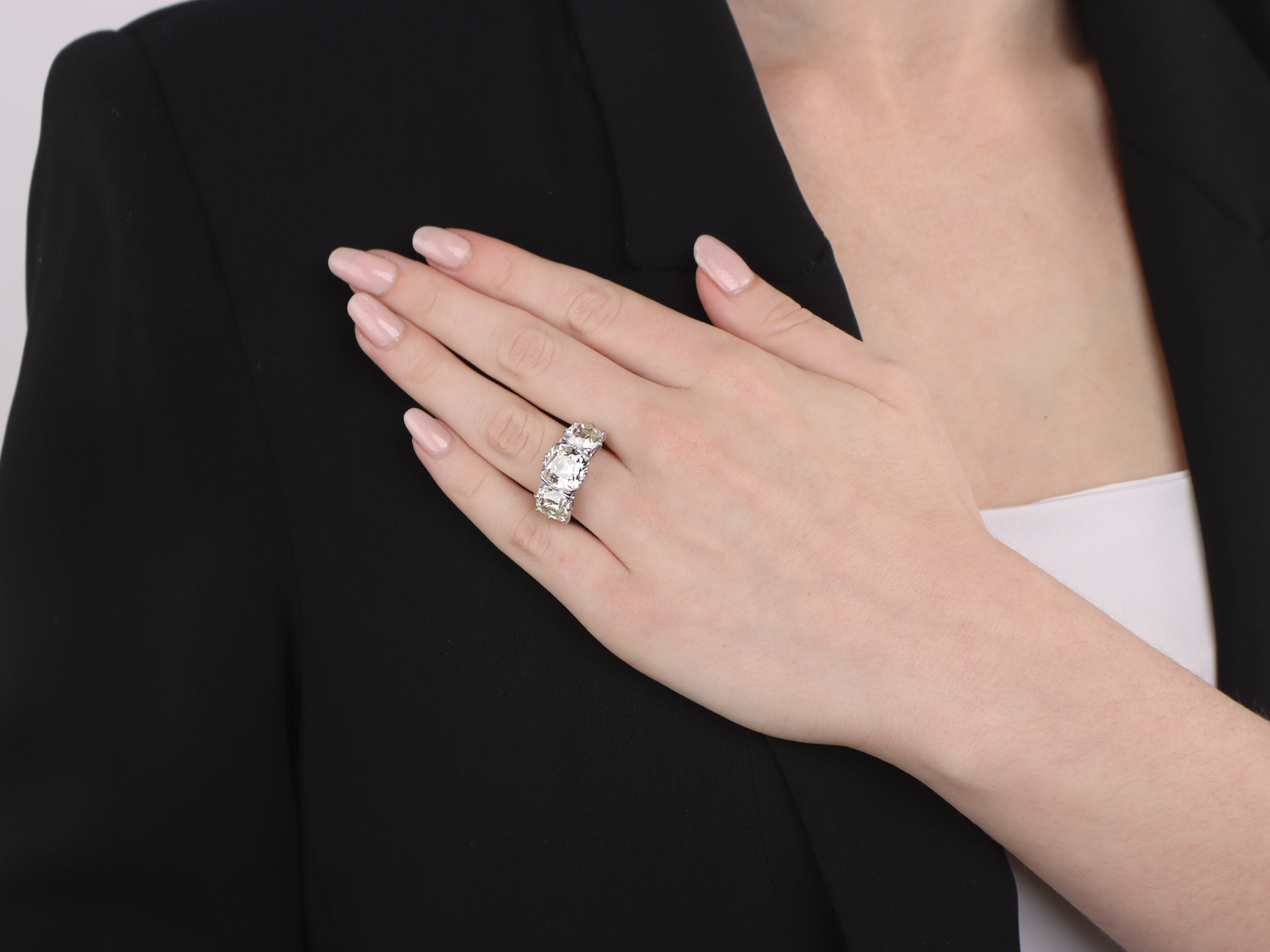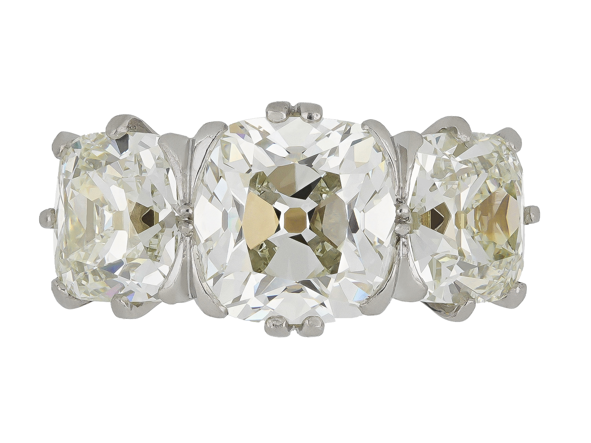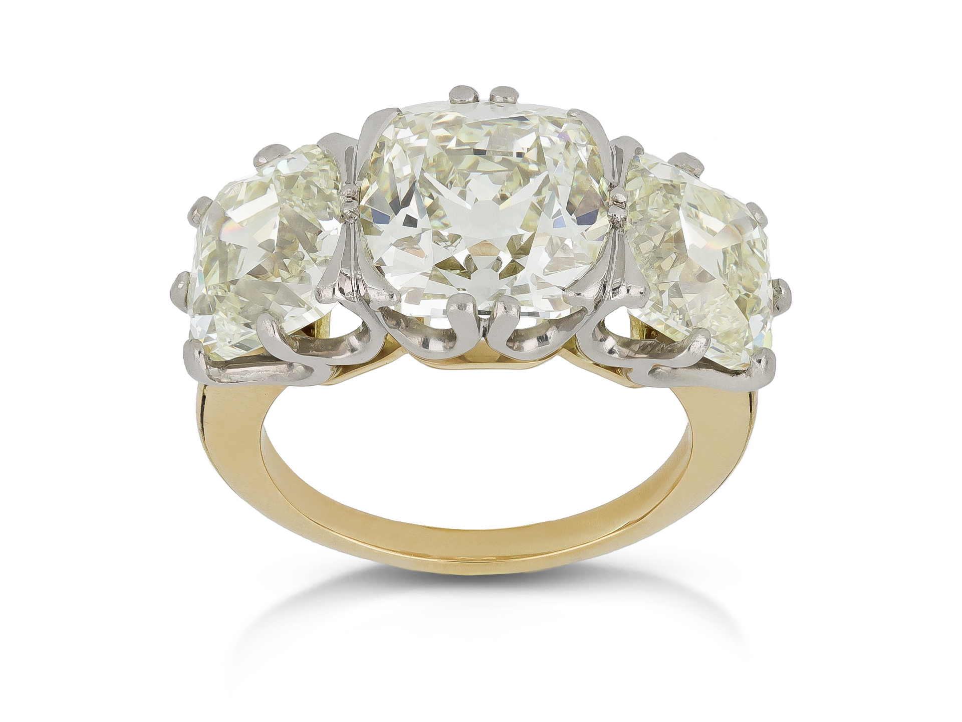 Old mine diamond three stone ring. Set to centre with a cushion shape old mine diamond, N colour, VS2 clarity with a weight of 5.08 carats, flanked by two cushion shape old mine diamonds, one Q-R colour, VS1 clarity, with a weight of 3.05 carats, the other S-T colour, VVS2 clarity with a weight of 3.02 carats, all in open back claw settings. The total diamond weight is 11.15 carats, to an impressive three stone design featuring double claws, a pierced gallery and open backholing, leading to chamfered shoulders which flow through to a solid D-shape shank. Tested 18 carat yellow gold and platinum, English, accompanied by Gemological Institute of America (GIA) reports #7528956434, #1528957148 and #5526957134.