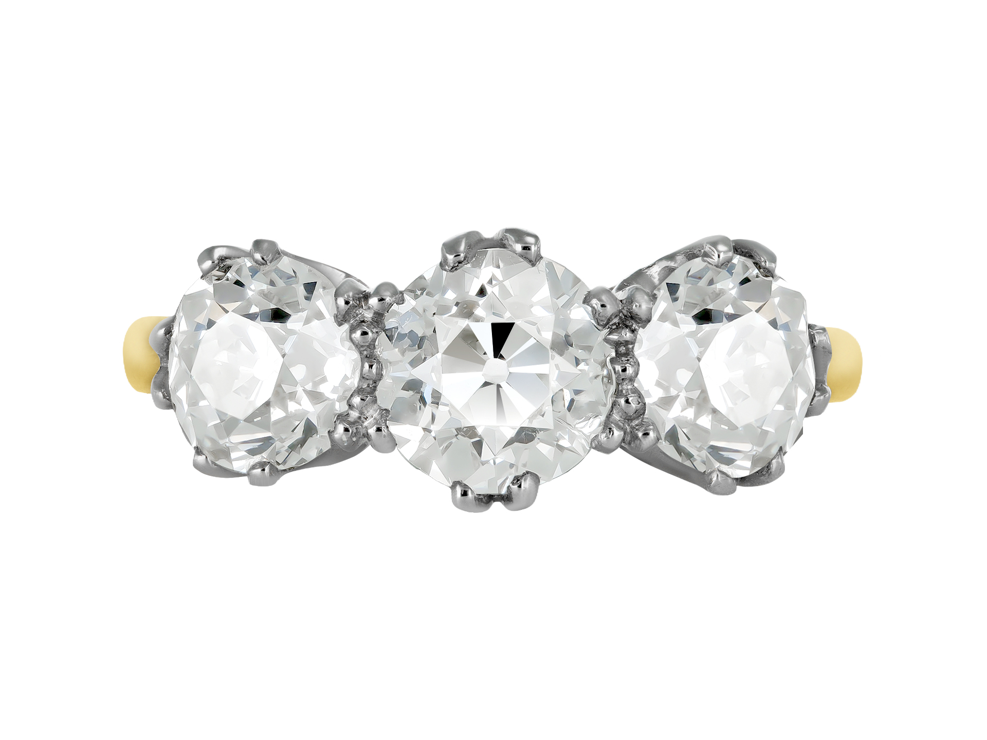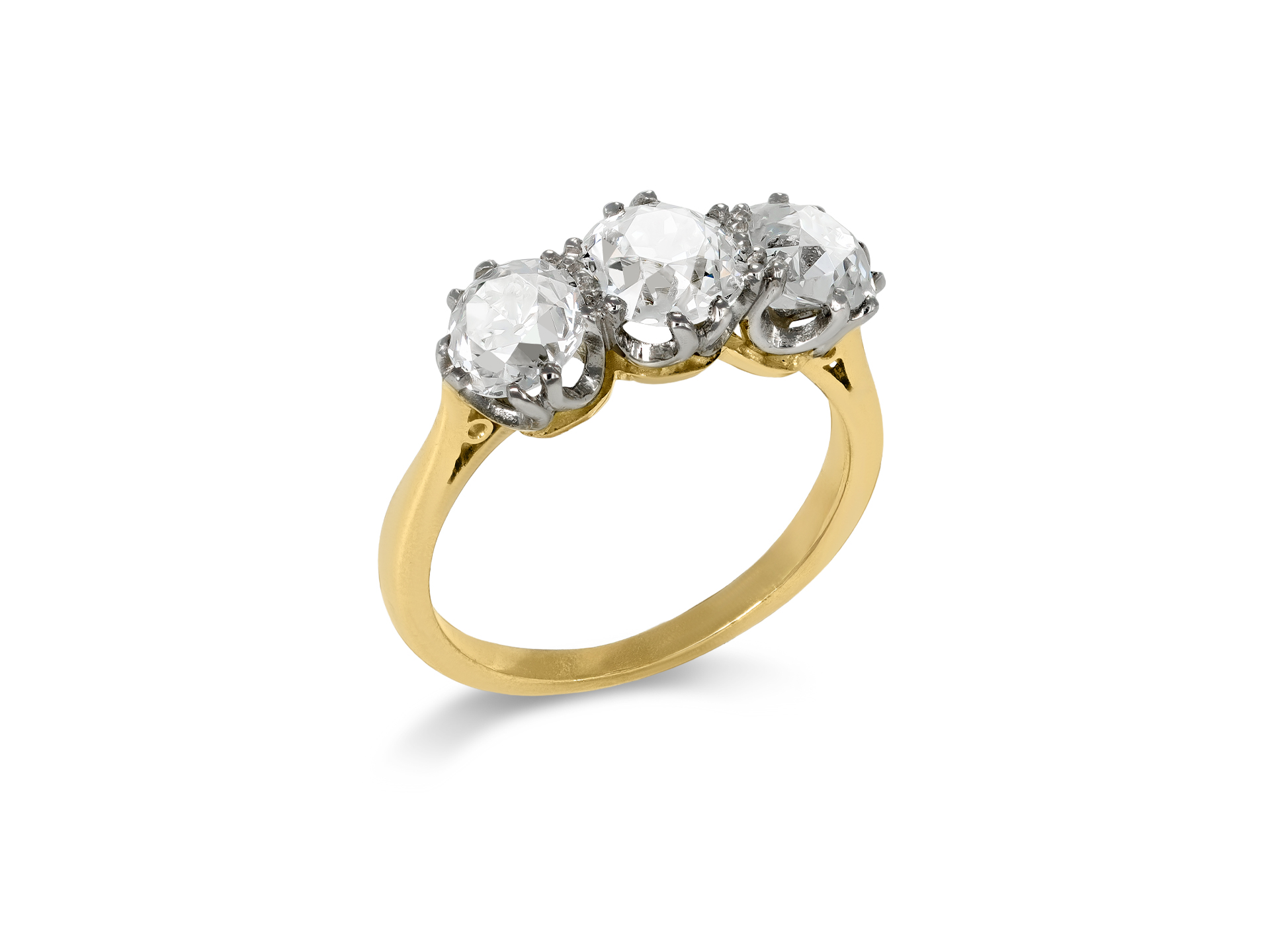 Old mine diamond three stone ring. Set to centre with a cushion shape old mine diamond, J colour, VS2 clarity with a weight of 1.14 carats in an open back claw setting, flanked by two cushion shape old mine diamonds in open back claw settings with a combined approximate weight of 1.30 carats. The total approximate diamond weight is 2.44 carats, to an elegant three stone design featuring split claws, a decorative gallery with scrolling motifs, and circular open backholing, leading to inwardly tapering raised shoulders with cheniers which flow through to a solid D-shape shank. Marked 18 carat yellow gold and platinum, circa 1910, accompanied by Gemological Institute of America (GIA) report #1232549014.