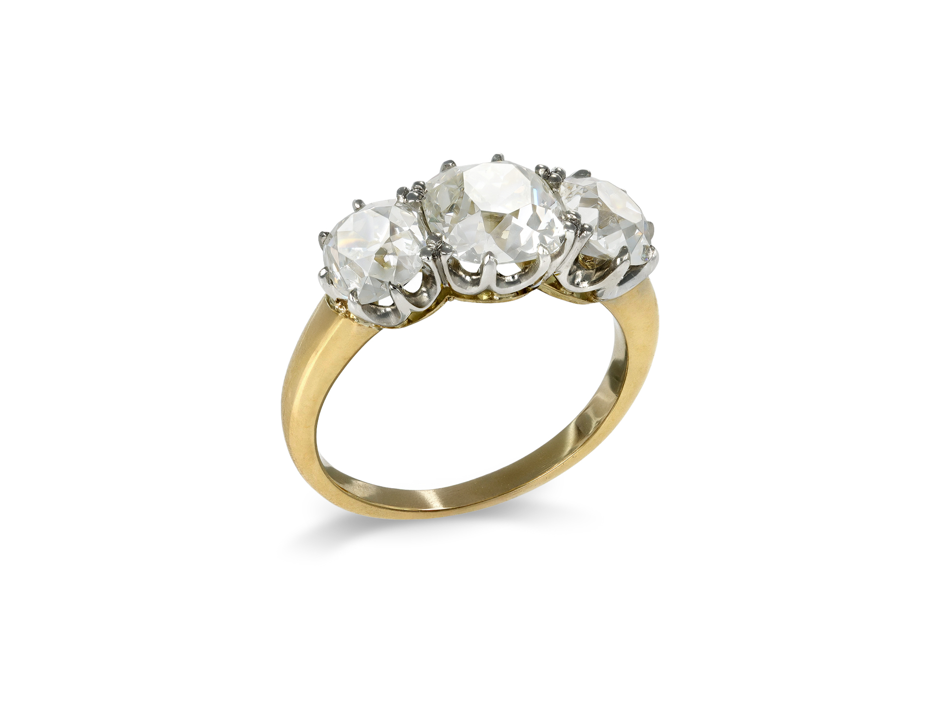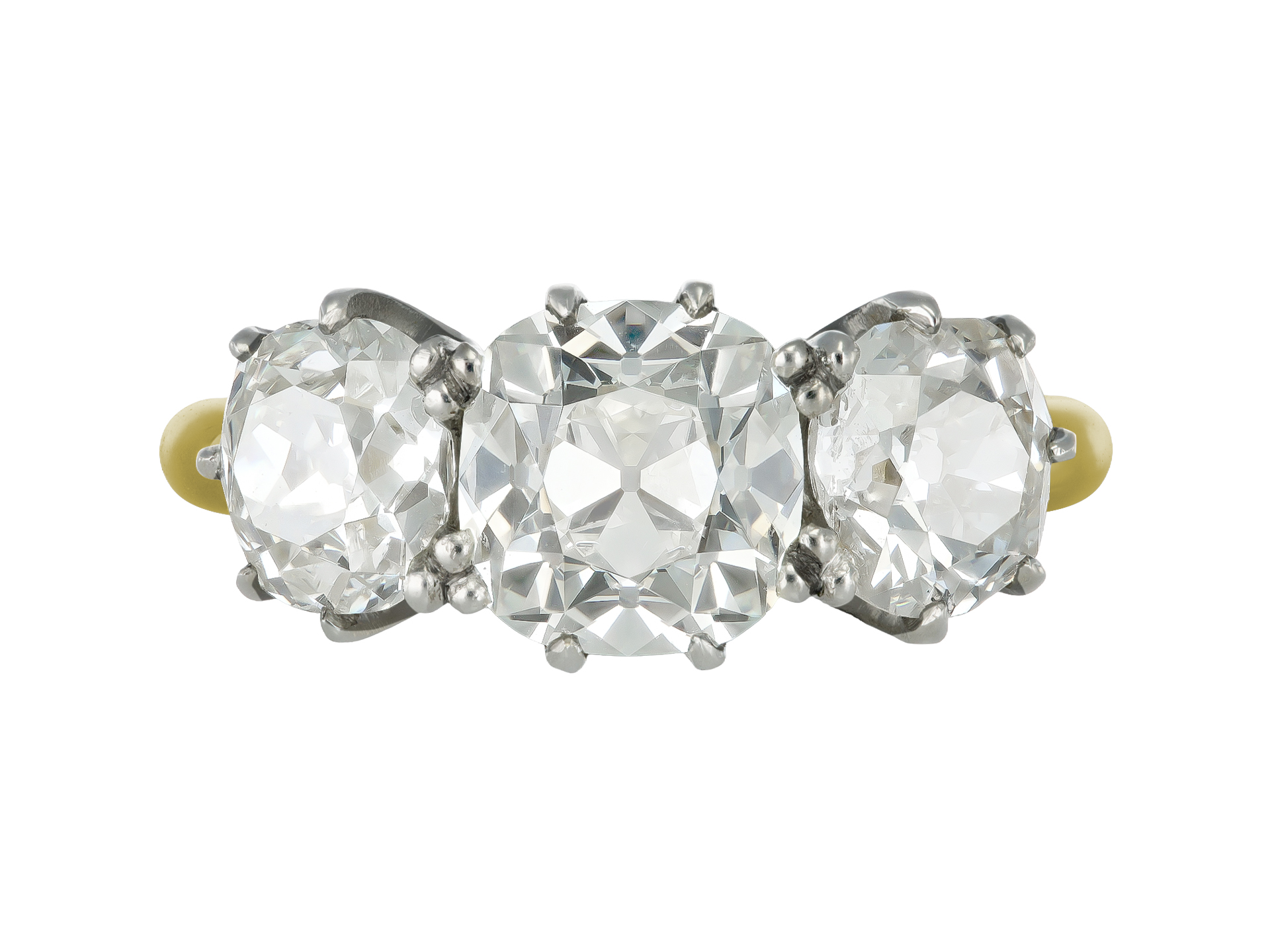 Old mine diamond three stone ring. Set to centre with a cushion shape old mine diamond, L colour, VS1 clarity, with a weight of 1.70 carats in an open back claw setting, further set with two cushion shape old mine diamonds in open back claw settings with a combined approximate weight of 1.75 carats. The total approximate diamond weight is 3.45 carats, to an impressive graduated three stone design featuring curving claws, a pierced gallery and and open backholing, leading to conforming shoulders which flow through to a solid D-shape shank. Tested yellow gold with platinum settings, circa 1910, accompanied by Gemological Institute of America report #2235705963.