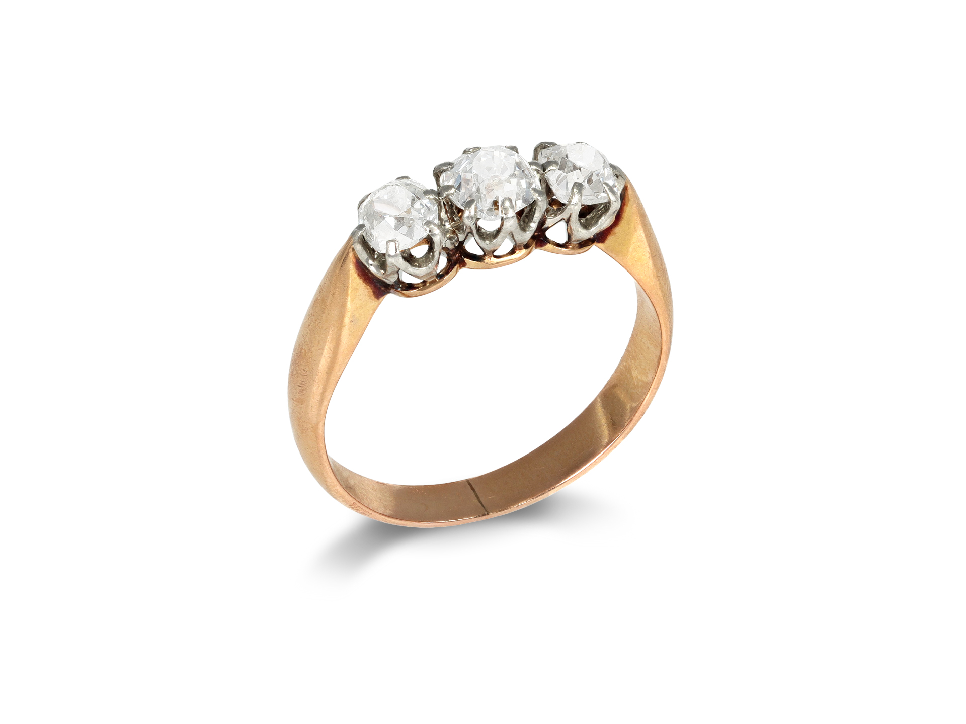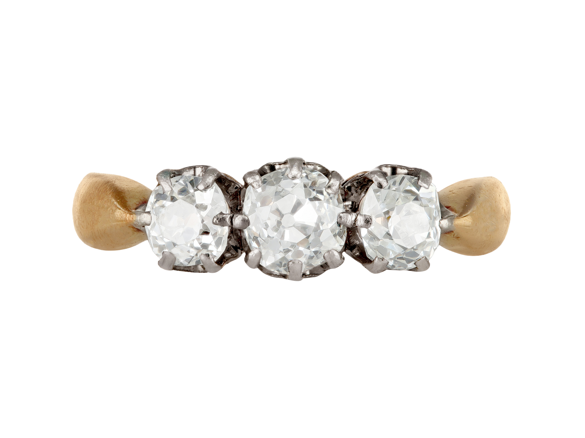 This three stone ring, dates to the early twentieth century and is set with old mine diamonds which hail from the historic diamond reserves of India or Brazil. With a beautiful scintillation of light, these stones would have been cut and faceted by hand, making each one an individual treasure.