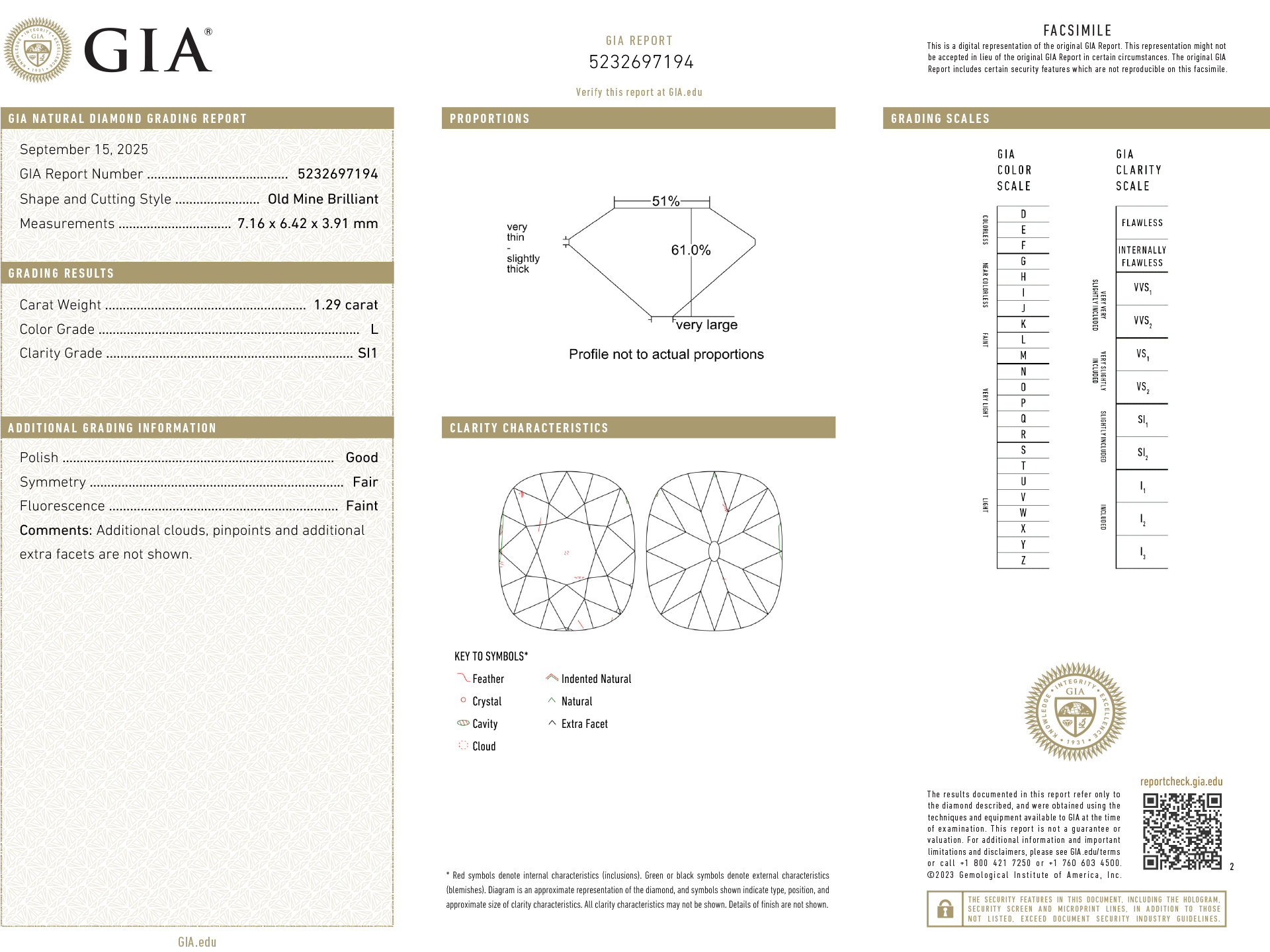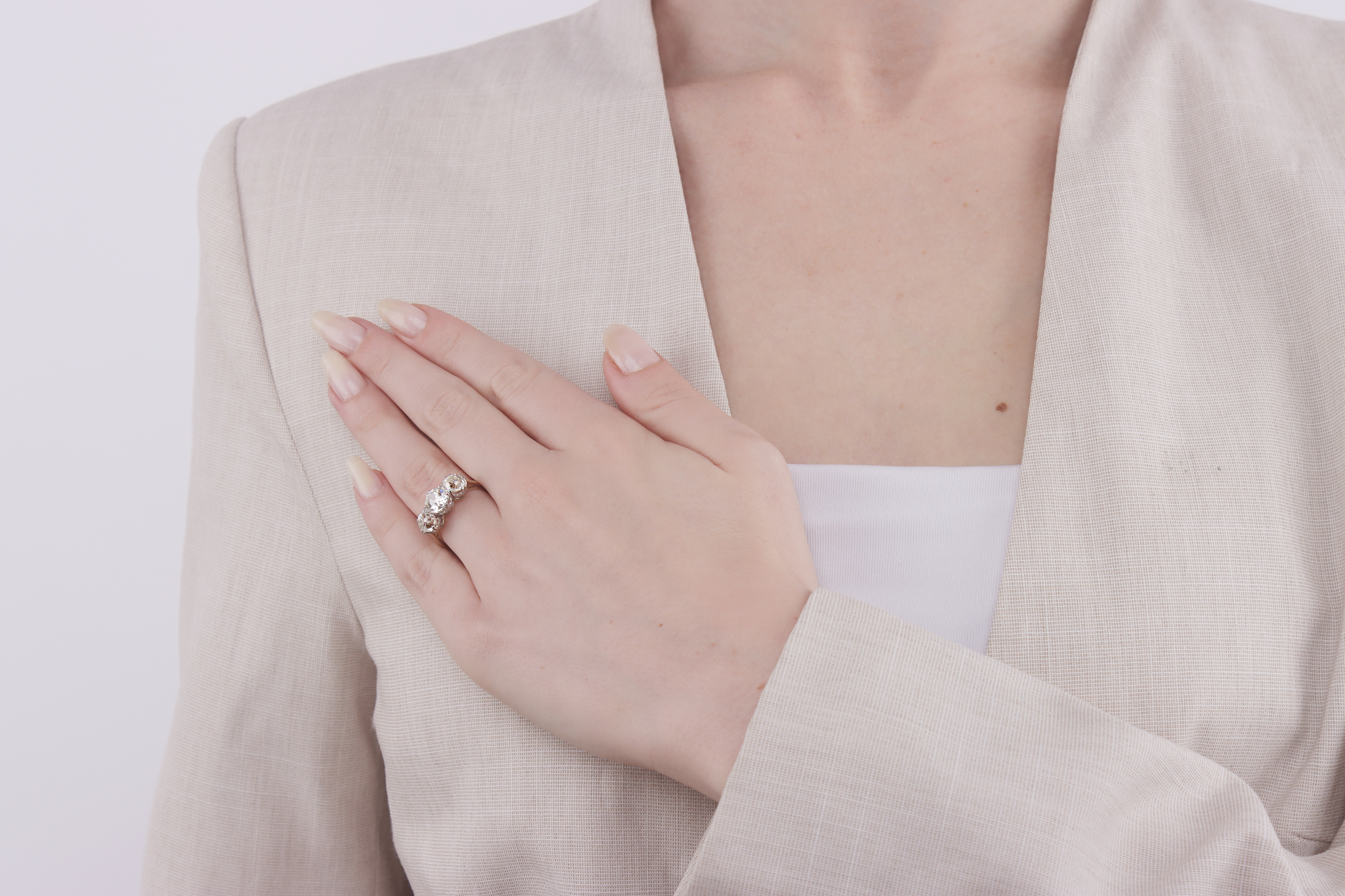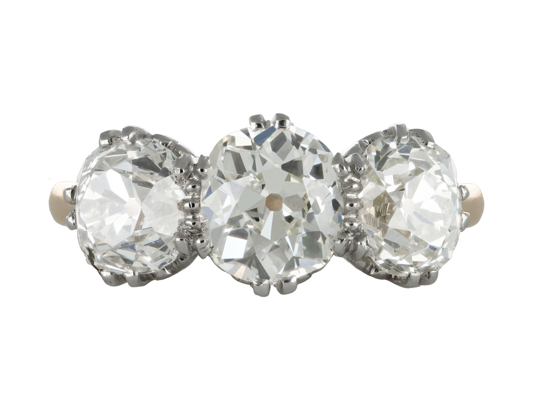 Old mine diamond three stone ring. Set to centre with a cushion shape old mine diamond, L colour, SI1 clarity with a weight of 1.29 carats in an open back claw setting, flanked by two cushion shape old mine diamonds in open back claw settings with a combined approximate weight of 2.40 carats. The total approximate diamond weight is 3.69 carats, to an elegant three stone design featuring split claws, a decorative gallery with scrolling motifs, and circular open backholing, leading to inwardly tapering raised shoulders with cheniers which flow through to a solid D-shape shank. Marked 18 carat yellow gold and platinum, circa 1910, accompanied by Gemological Institute of America (GIA) report #5232697194.