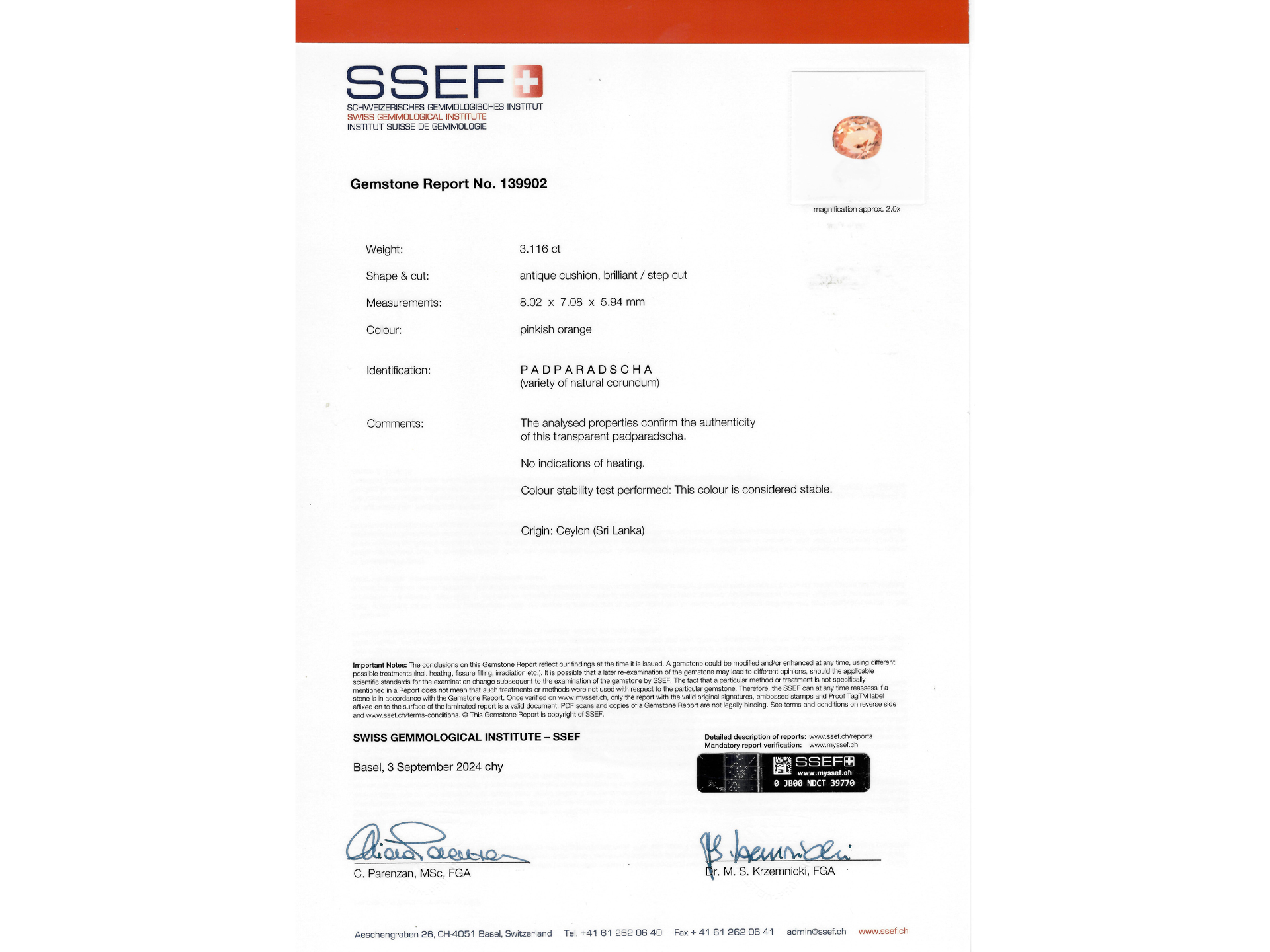 Padparadscha Ceylon sapphire and diamond three stone ring. Set to centre with a cushion shape mixed cut natural no heat padparadscha Ceylon sapphire in an open back claw setting with a weight of 3.11 carats, flanked by two old mine diamonds in open back claw settings with a combined approximate weight of 1.40 carats, to an elegant graduating three stone design featuring stylised claws, a pierced gallery with millegrain detail and circular open backholing, leading to raised shoulders which flow through to a solid D-shape shank. Tested rose gold and platinum, accompanied by SSEF report #139902.