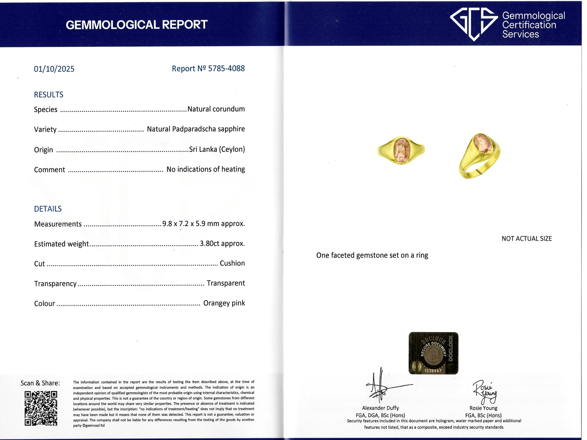 Padparadscha Ceylon sapphire ring. Set to centre with an oval old cut natural no heat padparadscha Ceylon sapphire in an open back rubover setting with an approximate weight of 3.80 carats, to an impressive gypsy design featuring polished edges and open backholing, leading to broad integrated shoulders which flow through to a solid shank. Tested 18 carat yellow gold, accompanied by Gemmological Certification Services report #5785-4088.