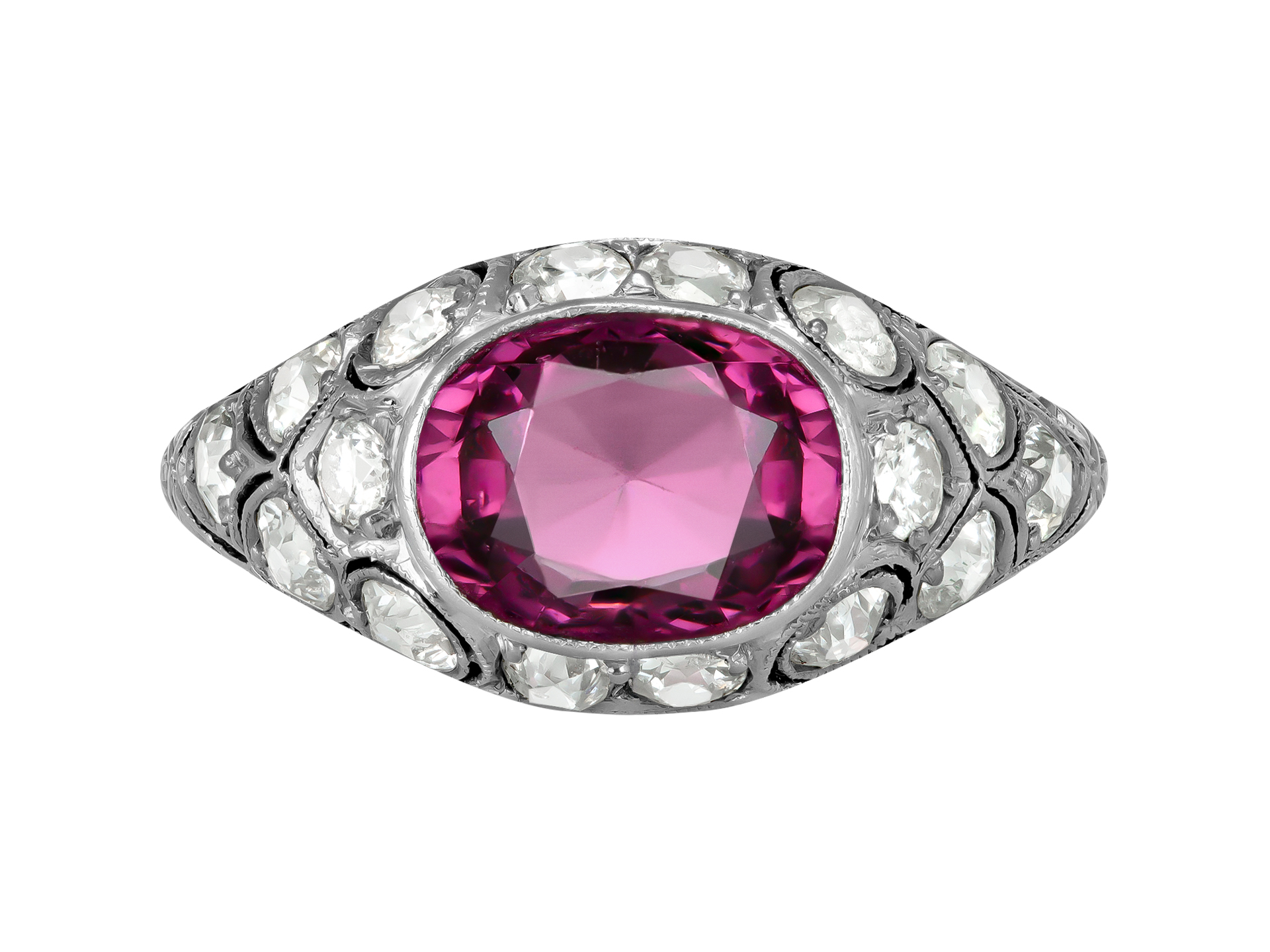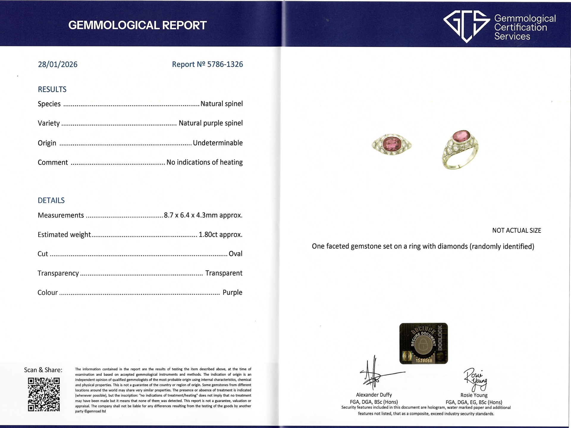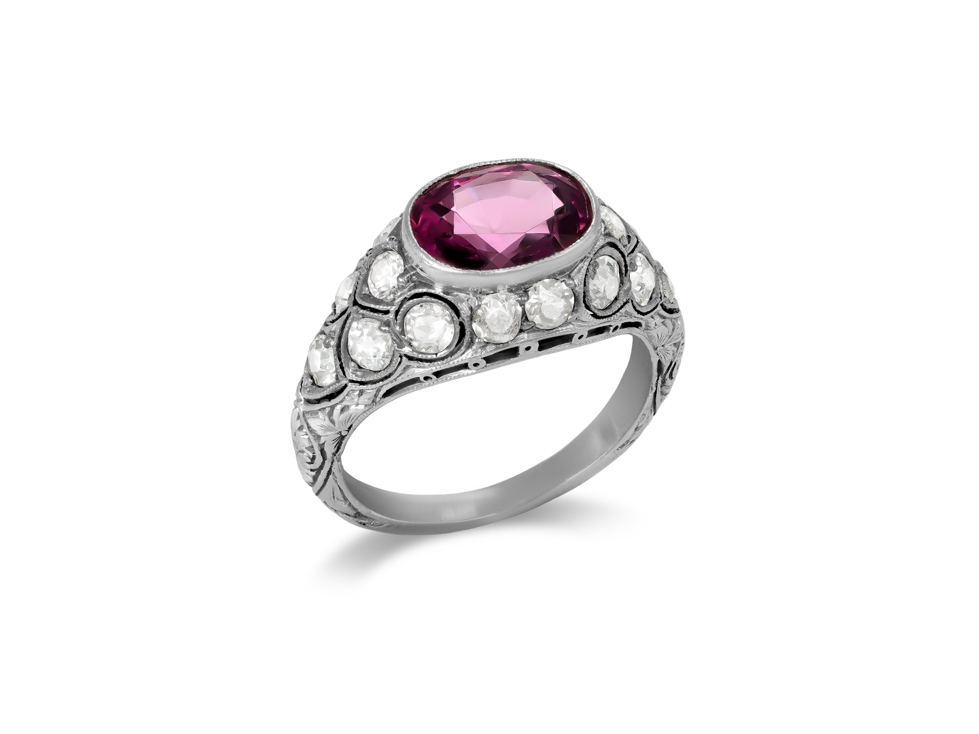 Purple spinel and diamond cluster ring. Set centrally with an oval old cut natural no heat purple spinel in an open back rubover setting with an approximate weight of 1.80 carats, further enhanced by sixteen cushion shape old mine diamonds in open back grain settings with an approximate combined weight of 1.00 carats, to an elegant bombé form featuring intricate openwork with millegrain borders, a finely pierced gallery with chenier motifs, and fancy shape open backholing, leading to engraved shoulders that flow through to a solid D-shape shank. Tested platinum, circa 1920, accompanied by Gemmological Certification Services report #5786-1326.