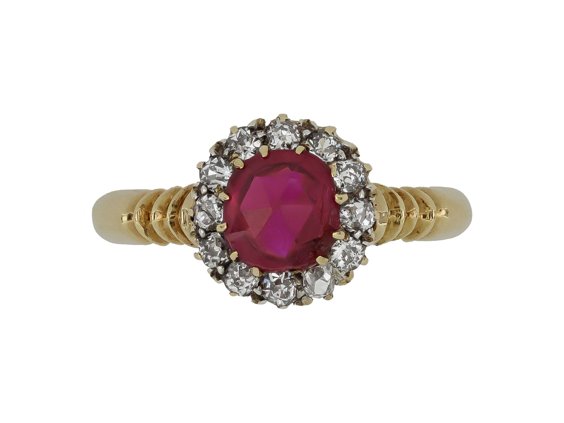 Ruby and diamond coronet cluster ring. Set to centre with a cushion shape rose cut natural no heat ruby in an open back claw setting with an approximate weight of 1.00 carats, surrounded by twelve cushion shape old mine diamonds in open back claw settings with an approximate weight of 0.20 carats, to a coronet cluster design featuring curving claws, an intricately pierced gallery and open backholing, leading to shoulders carved with ridged detail which flow through to a solid D-shape shank. Marked 18 carat yellow gold, circa 1900.