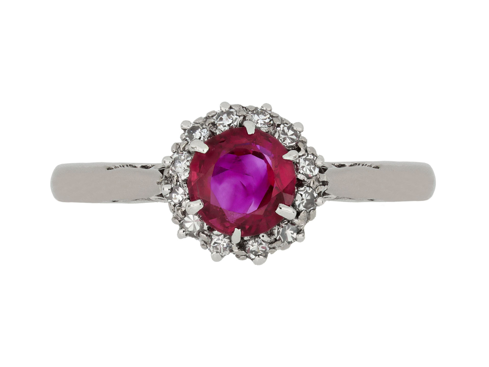 Ruby and diamond coronet cluster ring. Set to centre with a round old cut natural no heat ruby in an open back claw setting with an approximate weight of 0.70 carats, encircled by twelve round eight cut diamonds in open back claw settings with a combined approximate weight of 0.30 carats, to an elegant cluster featuring curving claws, a pierced gallery and fancy shape open backholing, leading to raised inwardly tapering shoulders with chenier detail and flowing through to a solid D-shape shank. Marked 18 carat white gold and platinum, circa 1940.