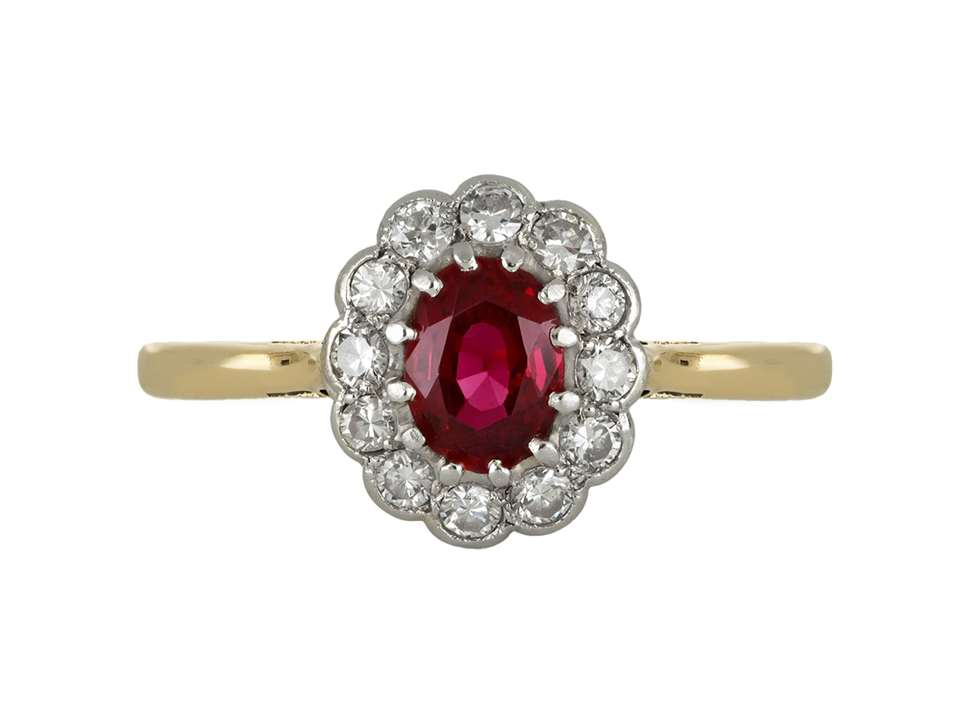 Ruby and diamond coronet cluster ring. Set to centre with an oval old cut natural no heat ruby in an open back claw setting with an approximate weight of 0.75 carats, encircled by twelve round brilliant cut diamonds in open back rubover and grain settings with a combined approximate weight of 0.45 carats, to an elegant coronet cluster design featuring scalloped edges with faint millegrain detail, an intricately pierced gallery with petal motifs and oval open backholing, leading to inwardly tapering shoulders with cheniers that flow through to a solid D-shape shank. Marked 18 carat yellow gold and platinum, circa 1960, accompanied by The Gem & Pearl Laboratory report #25710.