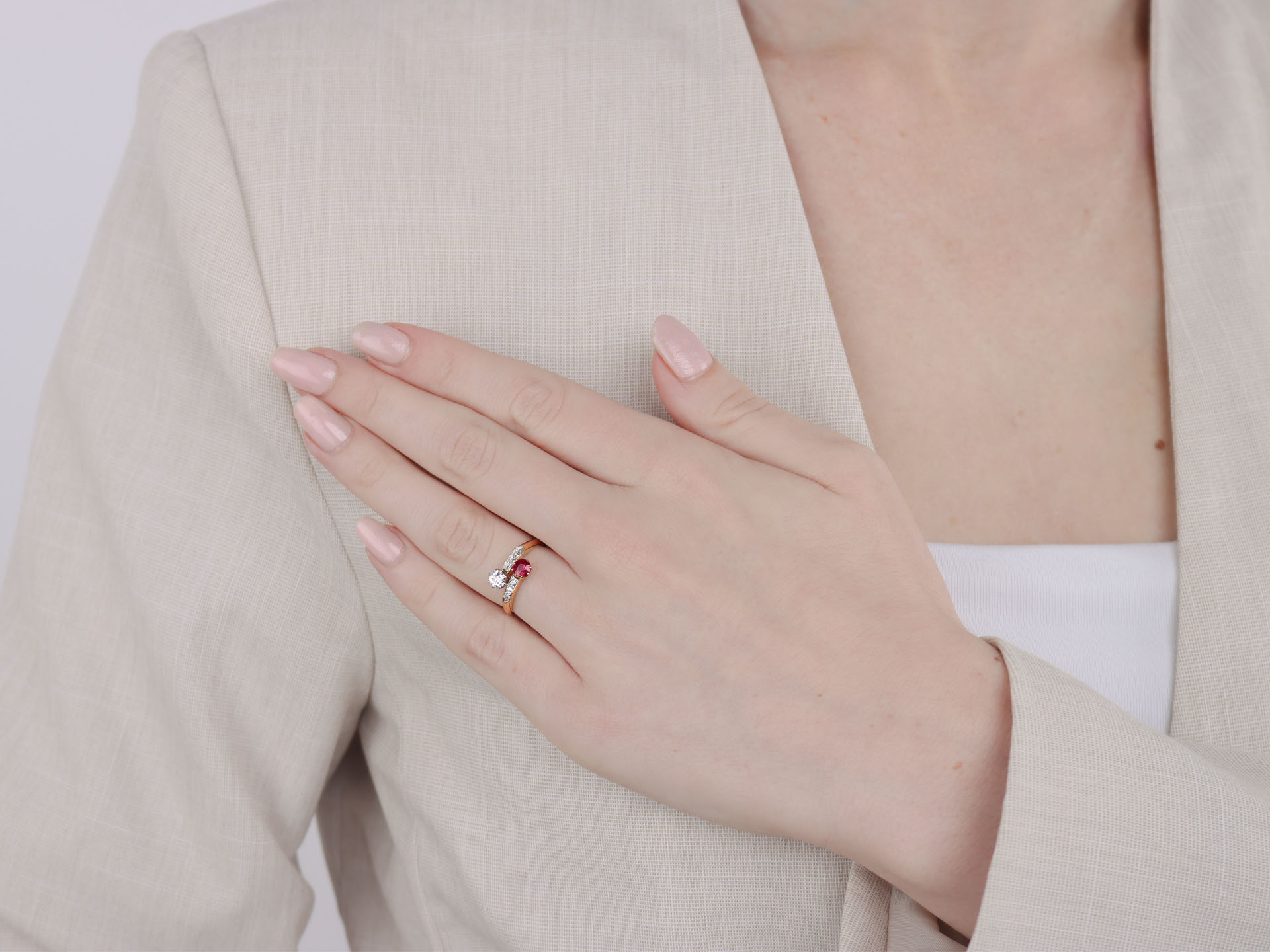 Ruby and diamond crossover ring. Set with a round old cut natural no heat ruby in an open back claw setting with an approximate weight of 0.35 carats, further set with a round old cut diamond in an open back claw setting with an approximate weight of 0.25 carats, decorated with six round old cut diamonds in open back grain settings with a combined weight of 0.15 carats. The total approximate diamond weight is 0.40 carats, to an elegant crossover design featuring polished edges, pierced galleries and fancy shape open backholing, leading to asymmetric chamfered shoulders which flow through to a solid D-shape shank. Tested yellow gold and platinum, circa 1905.