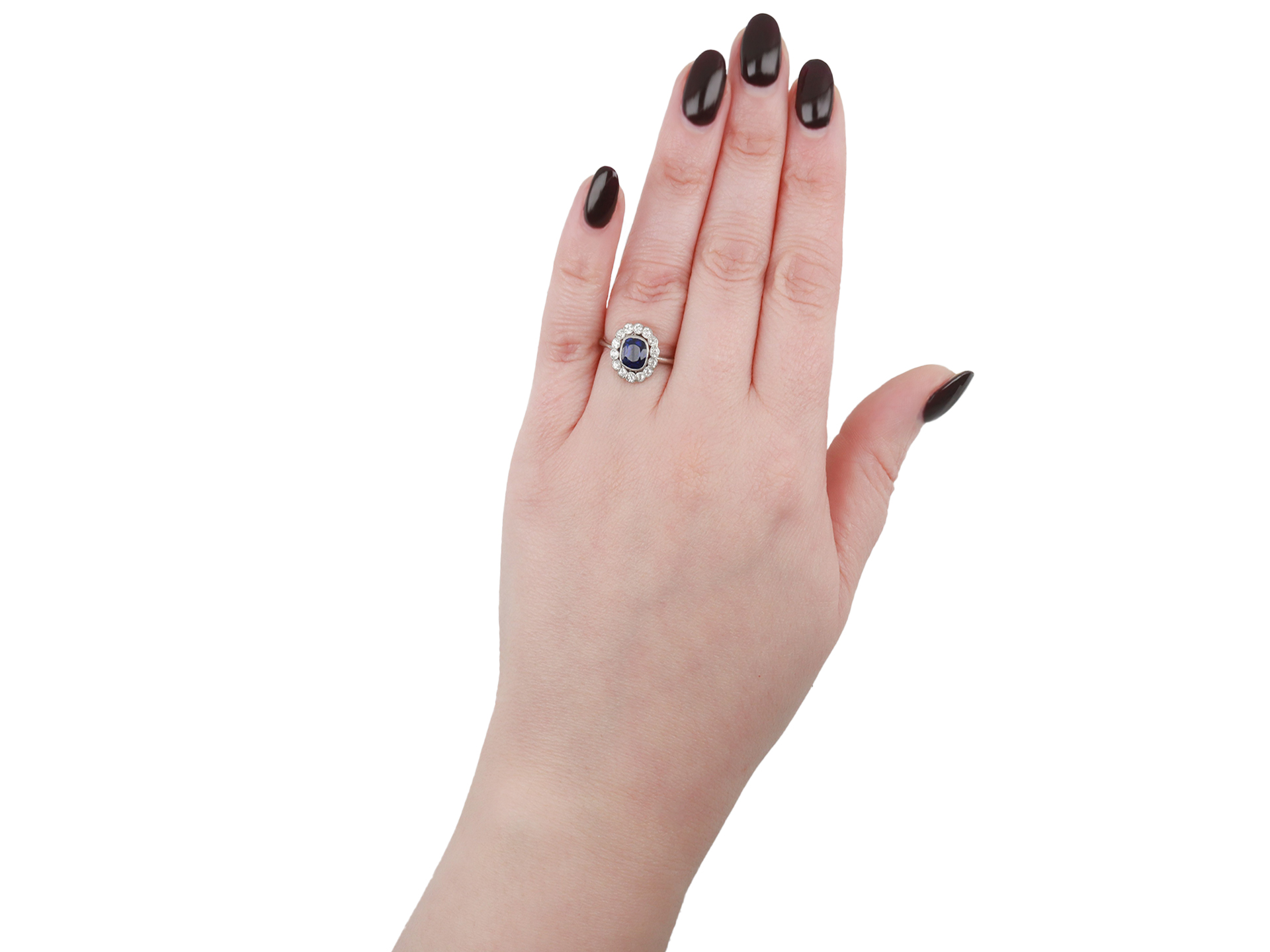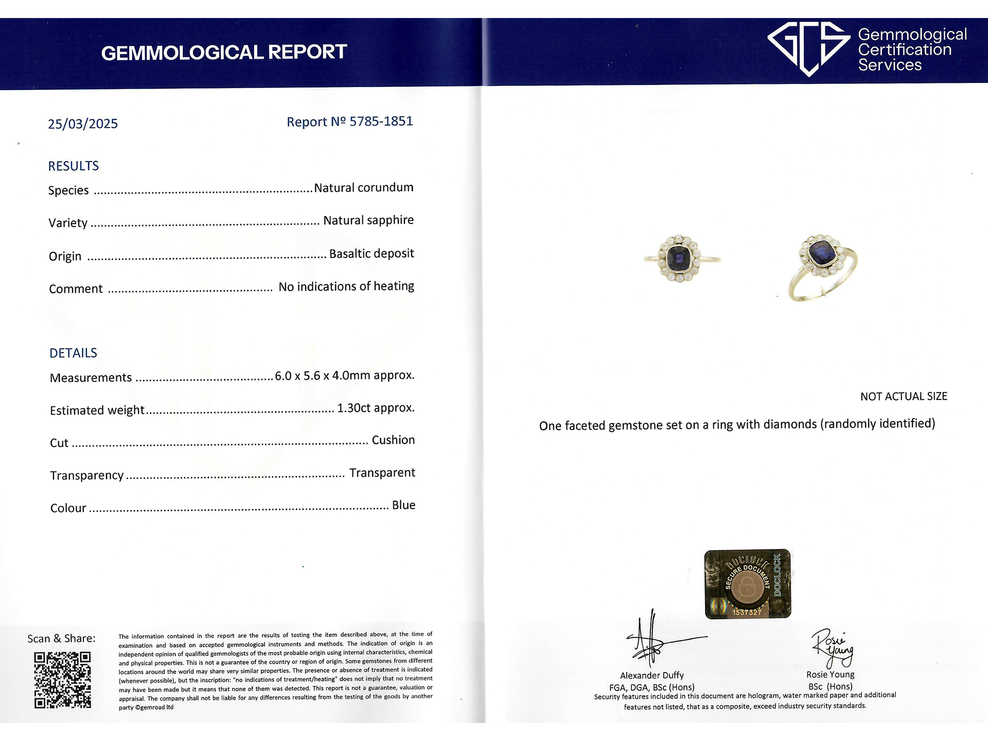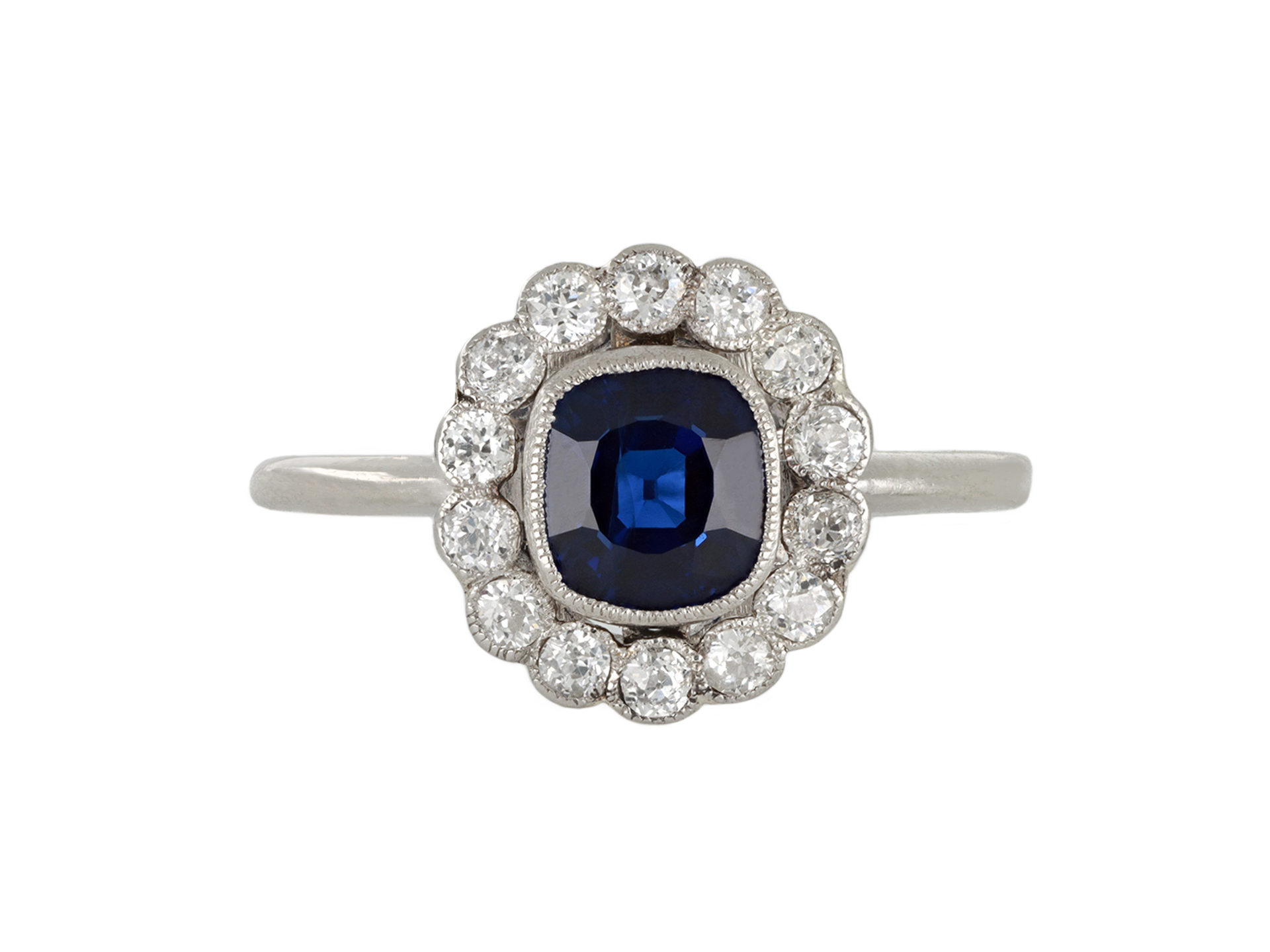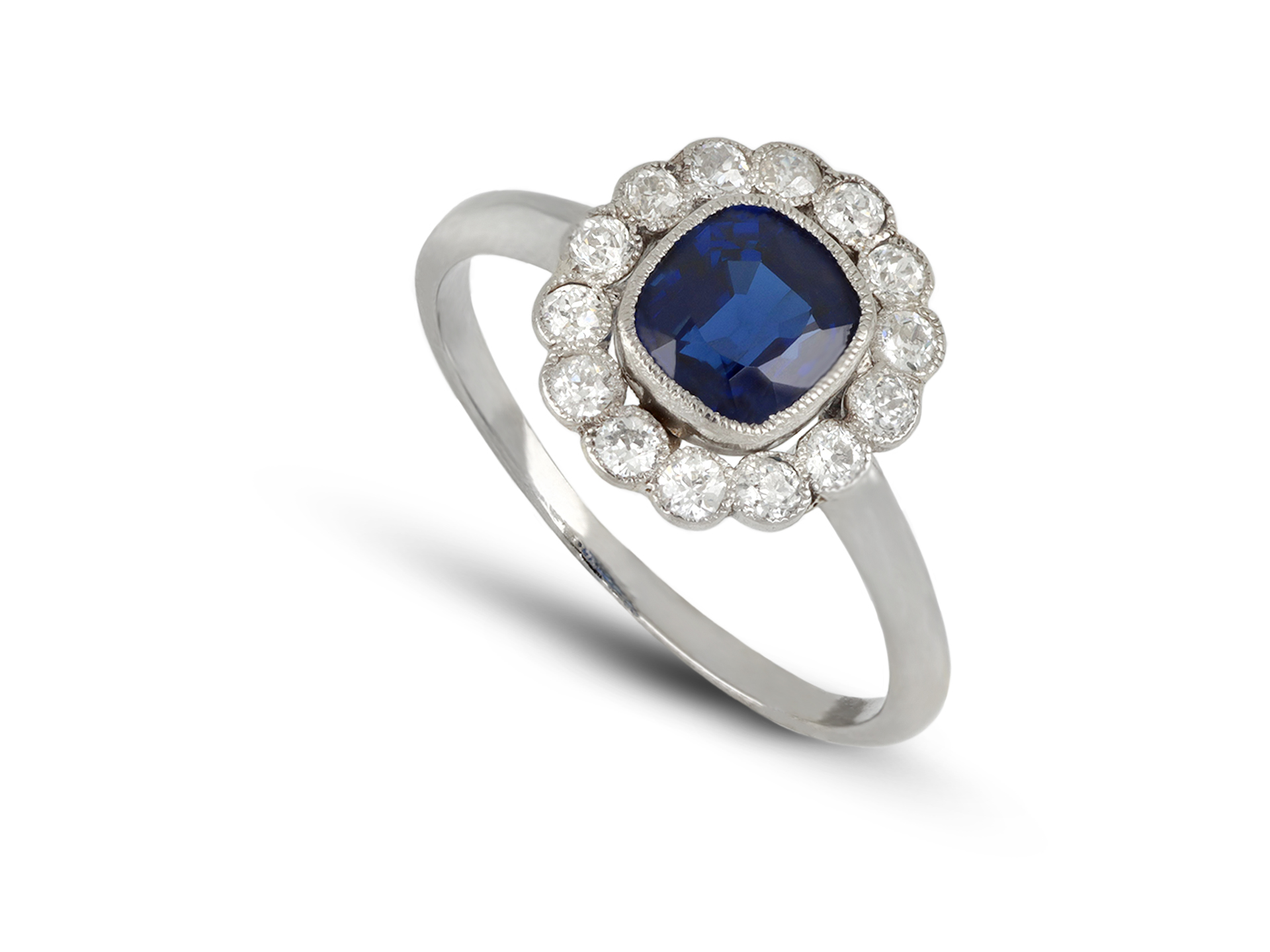 Sapphire and diamond coronet cluster ring. Set with a cushion shape old cut natural unenhanced sapphire in an open back rubover setting with an approximate weight of 1.30 carat, further set with fourteen round old cut diamonds in open back rubover and grain settings with a combined approximate weight of 0.40 carat, to an elegant cluster design featuring scalloped millegrain edging, a decorative gallery with intricate piercing and fancy shape open backholing, leading to inwardly tapering shoulders and flowing through to a solid shank. Tested platinum, circa 1920, accompanied by Gemmological Certification Services report #5785-1851.