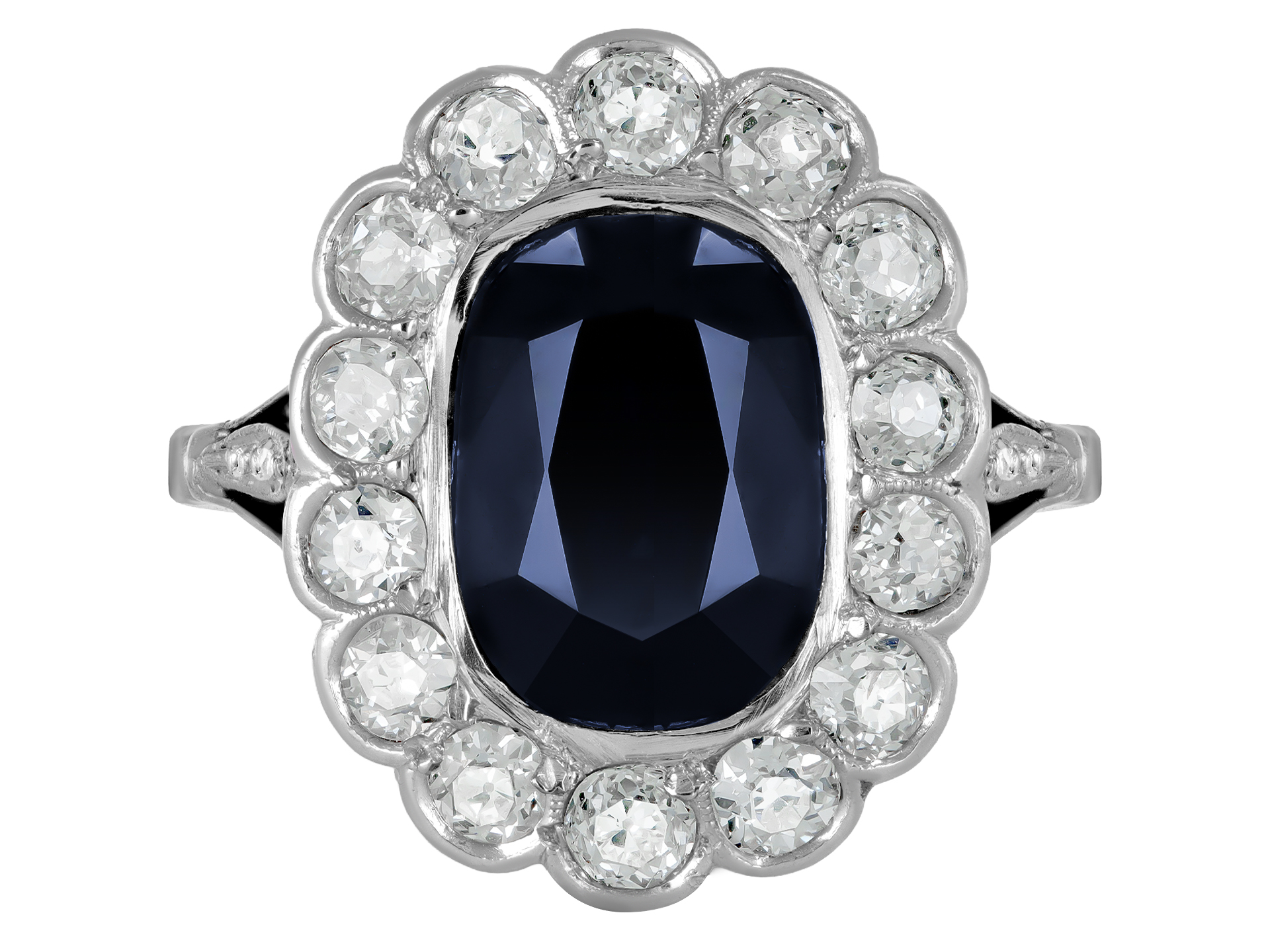 Sapphire and diamond coronet cluster ring. Set with an oval old cut natural no heat sapphire with an approximate weight of 3.60 carats in an open back rubover setting, encircled by fourteen cushion shape old mine diamonds in open back rubover and grain settings with an approximate combined weight of 1.15 carats, and decorated with two round rose cut diamonds in open back grain settings with a combined weight of 0.02 carats. The total approximate diamond weight is 1.17 carats to an elegant elongated cluster, featuring scalloped millegrain edging, with a decorative pierced gallery and open backholing, flanked by tri-split shoulders which flow through to a solid D-shape shank. Marked platinum, french import marks, circa 19215.