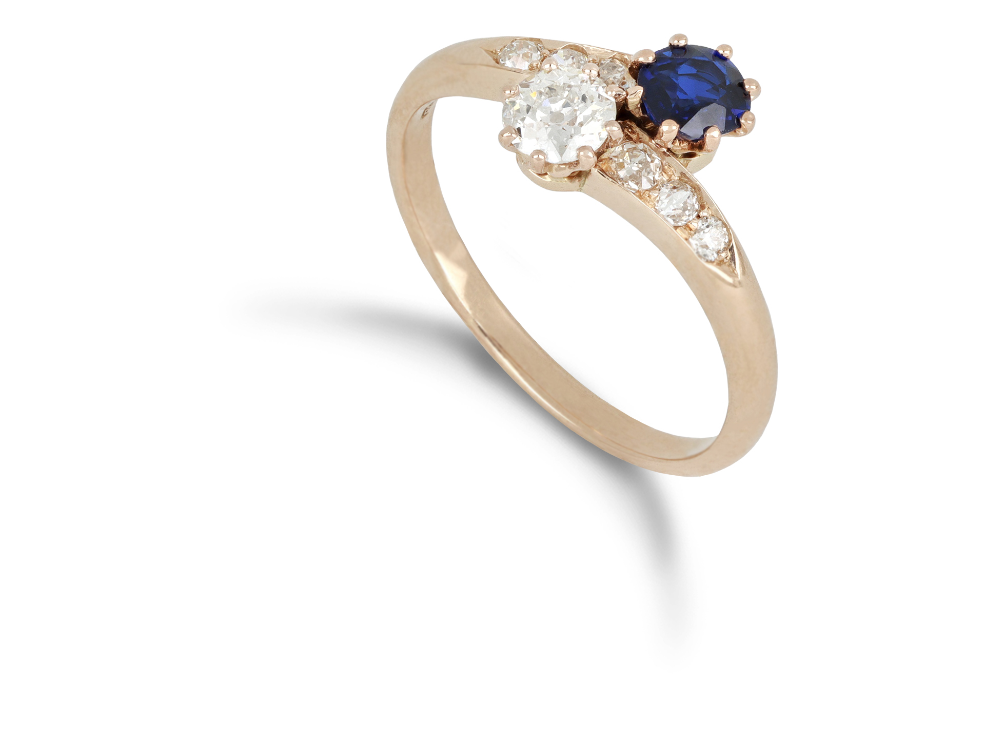 Sapphire and diamond crossover ring. Set with a cushion shape old cut natural unenhanced sapphire in an open back claw setting with an approximate weight of 0.40 carats, further set with a round old cut diamond in an open back claw setting with an approximate weight of 0.35 carats, and decorated with six round old cut diamonds in open back claw settings with a combined weight of 0.20 carats. The total approximate diamond weight is 0.55 carats, to an elegant crossover design featuring curving claws, a pierced gallery and fancy shape open backholing, leading to a-symmetric shoulders which flow through to a solid D-shape shank. Marked 14 carat rose gold, partial maker's mark 'E/F?G', assay mark for Vienna, Austro-Hungarian, circa 1910.