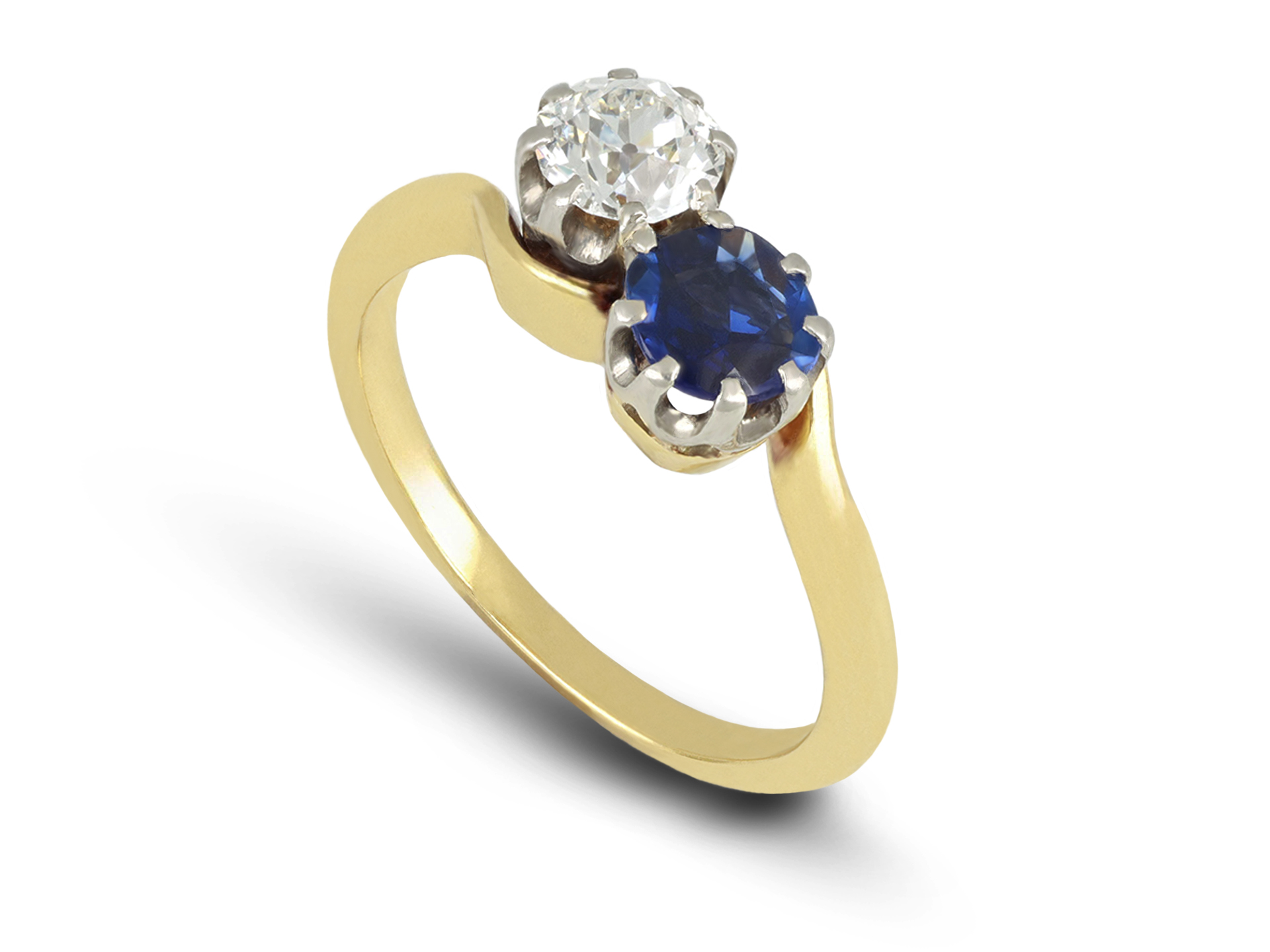 Sapphire and diamond crossover ring. Set with a cushion shape old cut natural unenhanced sapphire in an open back claw setting with an approximate weight of 0.55 carats, further set with a round old cut diamond in an open back claw setting with an approximate weight of 0.65 carats, to an elegant crossover design featuring curving claws, a pierced gallery and open backholing, leading to asymmetric shoulders and flowing through to a solid D-shape shank. Tested yellow gold with palladium settings, circa 1940.