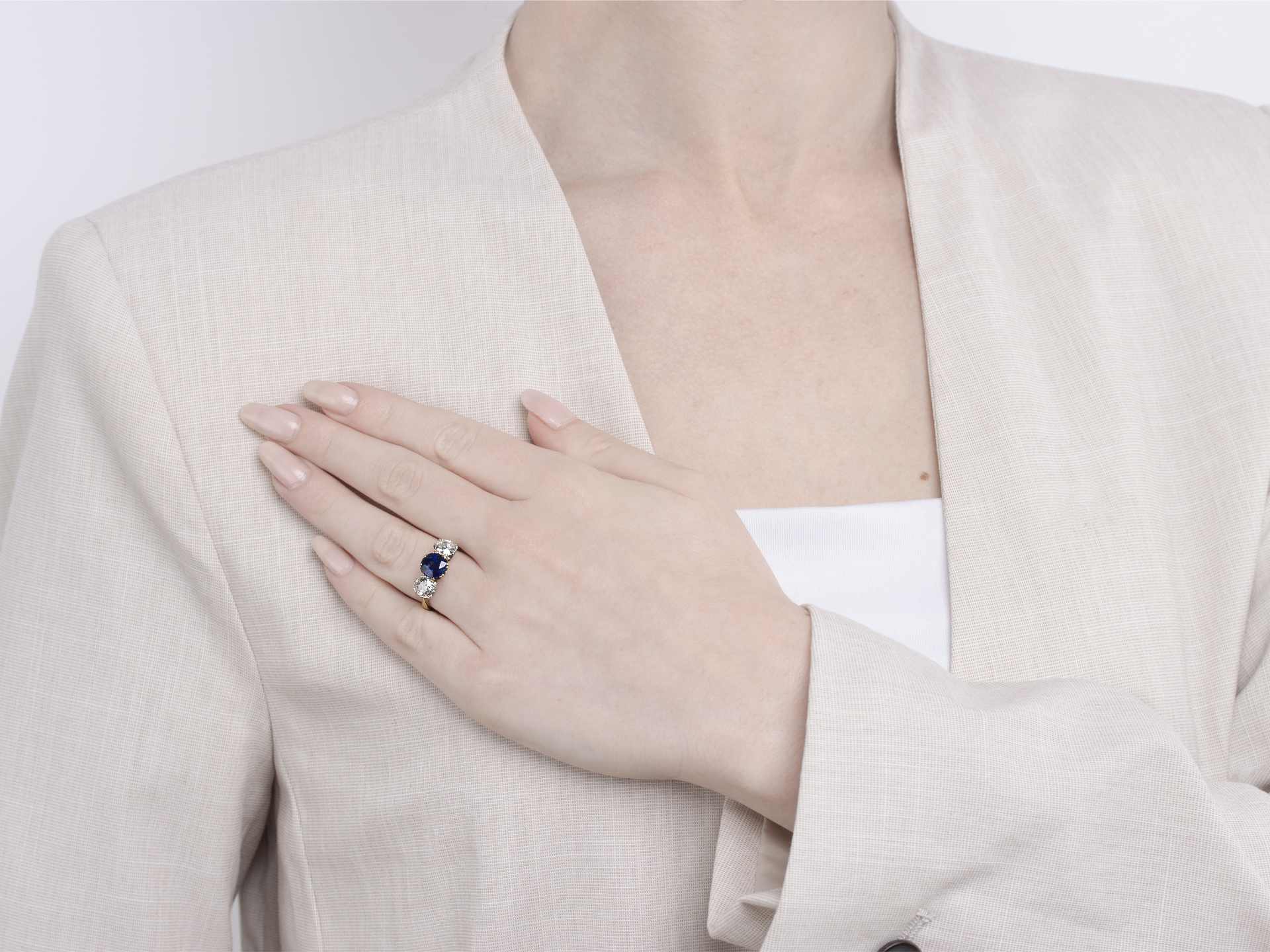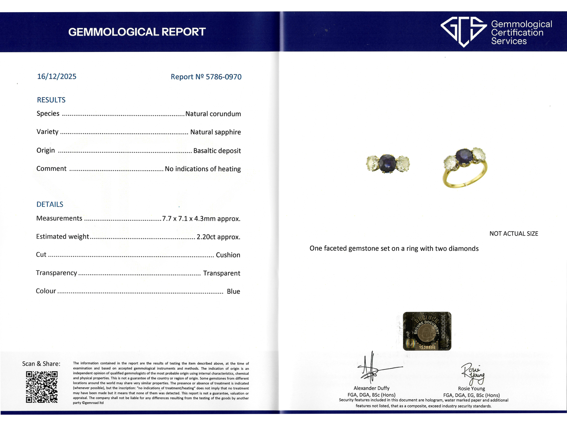 Sapphire and diamond three stone ring. Set to centre with a cushion shape old cut natural unenhanced sapphire in an open back claw setting with an approximate weight of 2.20 carats, flanked by two cushion shape old mine diamonds in open back claw settings with a combined approximate weight of 1.50 carats, to an elegant three stone design featuring curving split claws, an intricately pierced gallery and fancy shape open backholing, the raised inwardly tapering shoulders with chenier motifs flow through to a solid D-shape shank. Marked 18 carat yellow gold and platinum, English, circa 1910, accompanied by Gemmological Certification Services report #5786-0970.