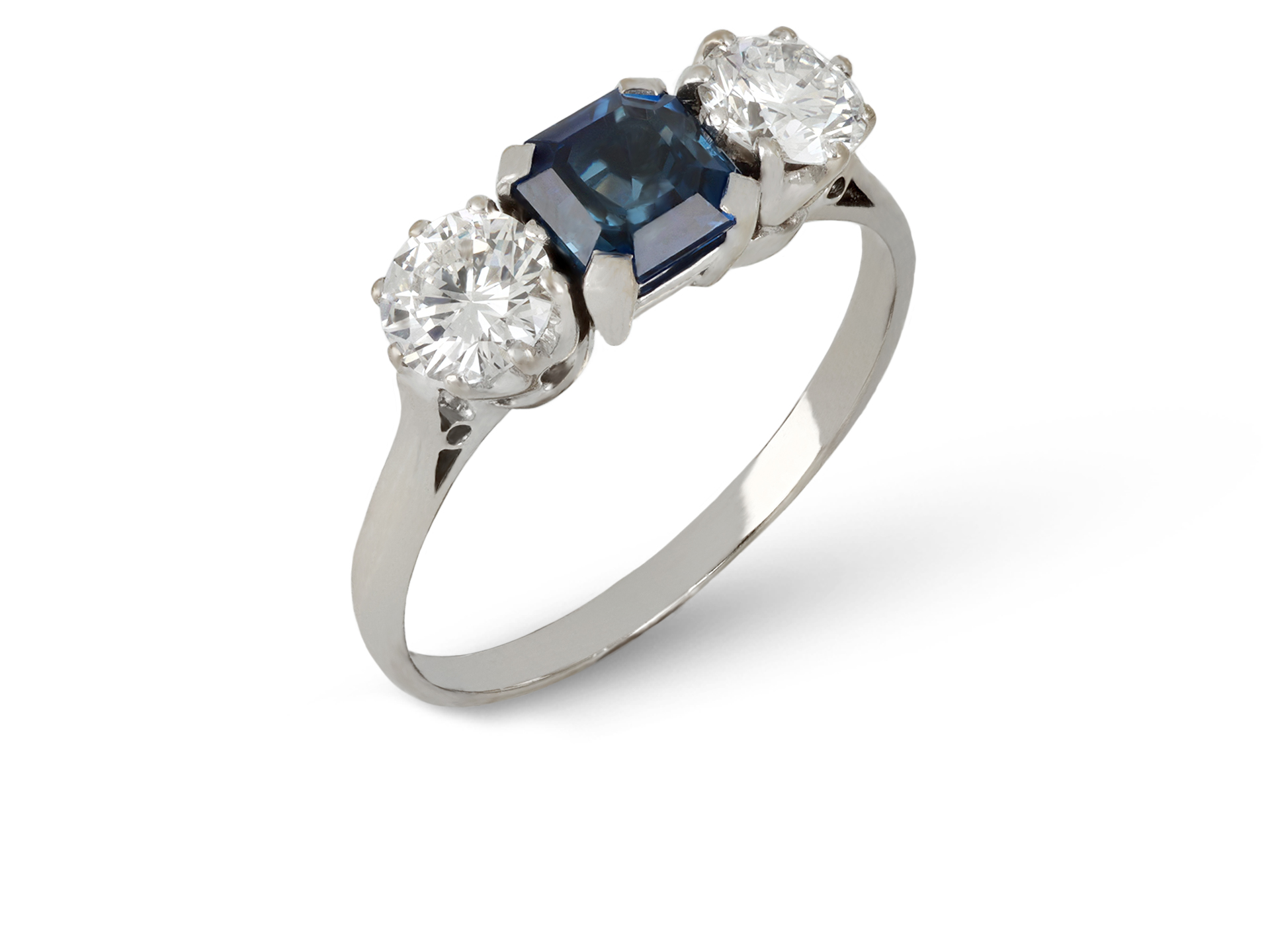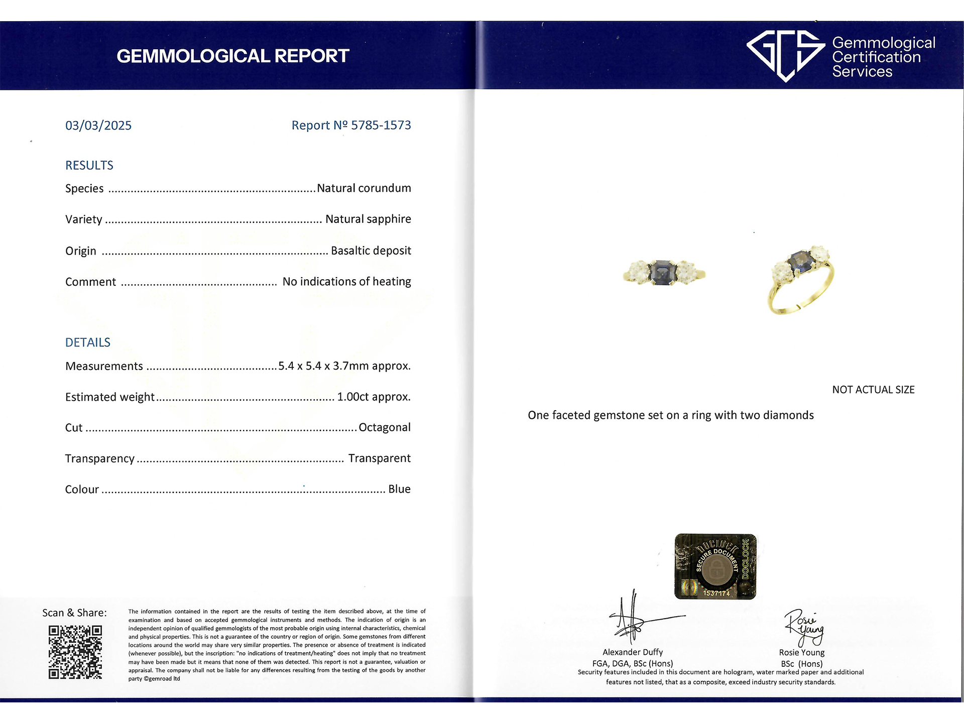 Sapphire and diamond three stone ring. Centrally set with an octagonal step-cut cut natural unenhanced sapphire with an approximate weight of 1.00 carats in an open back claw setting, flanked by two round transitional cut diamonds in open back claw settings with an approximate combined weight of 0.90 carats, to an elegant three stone design featuring curving claws, a pierced gallery and open backholing, the tapering shoulders with chenier details flowing through to a solid D-shape shank. Tested 18 carat white gold, circa 1940, accompanied by Gemmological Certification Services report #5785-1573.