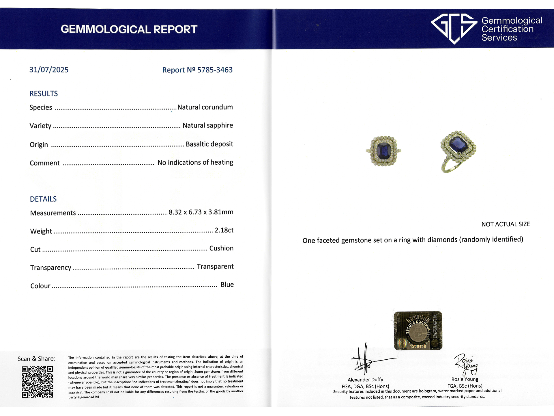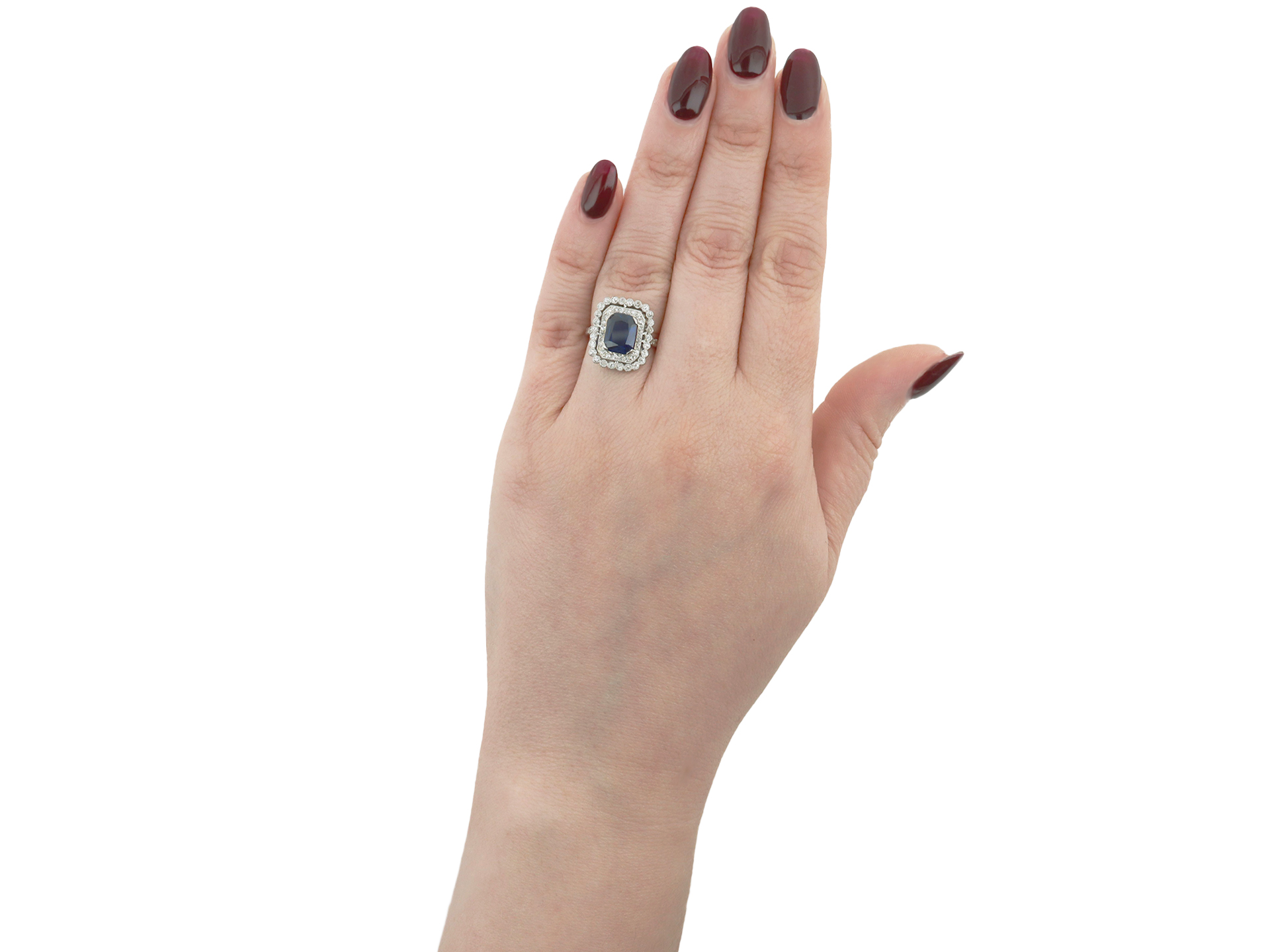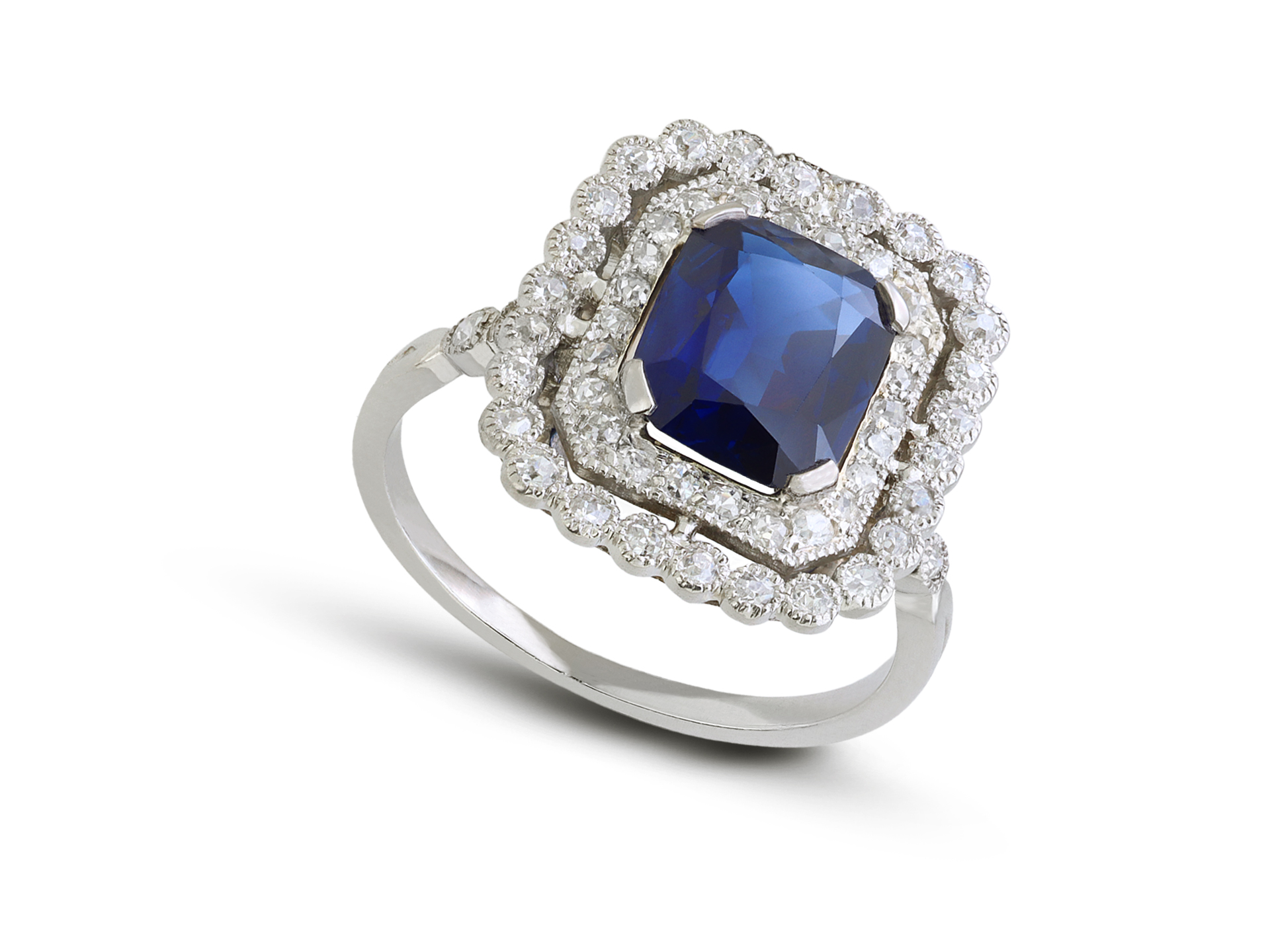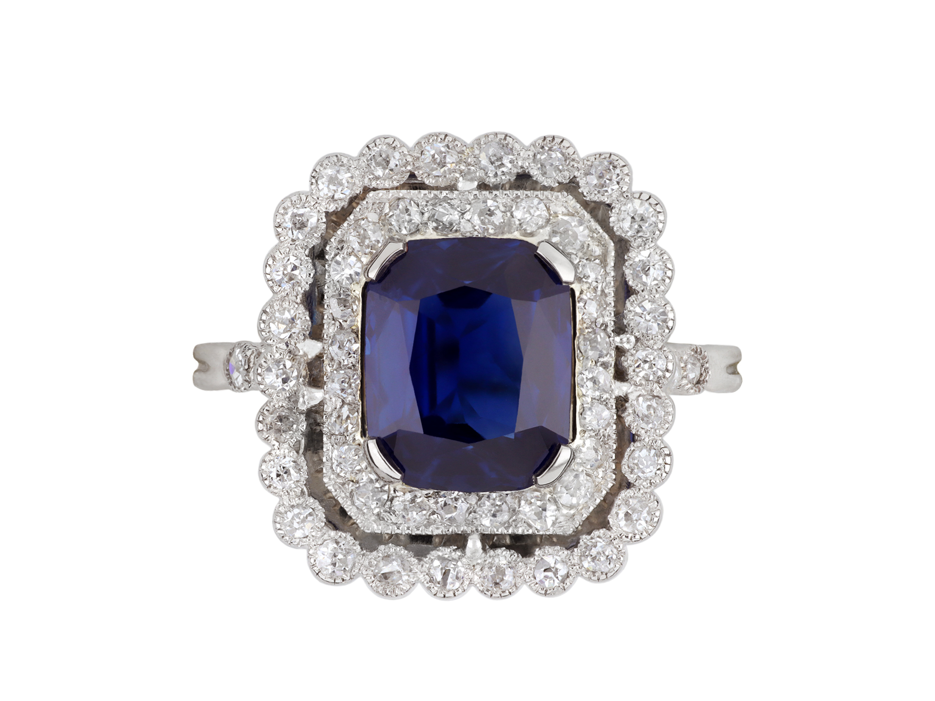 Sapphire and diamond cluster ring. Set to centre with a cushion shape old cut natural no heat sapphire in an open back claw setting with a weight of 2.18 carats, encircled by forty-nine round eight cut diamonds in open back grain and rubover settings with a combined approximate weight of 0.49 carats and decorated to the shoulders with four round eight cut diamonds in open back rubover settings with a combined weight of 0.04 carats. The total approximate diamond weight is 0.53 carats, to an elegant cluster design featuring scalloped edging with millegrain detail, a pierced gallery and fancy shape open backholing, leading to raised shoulders which flow through to a solid partially grooved shank. Tested platinum, maker's mark 'SB', French, circa 1915, accompanied by Gemmological Certification Services report #5785-3463.