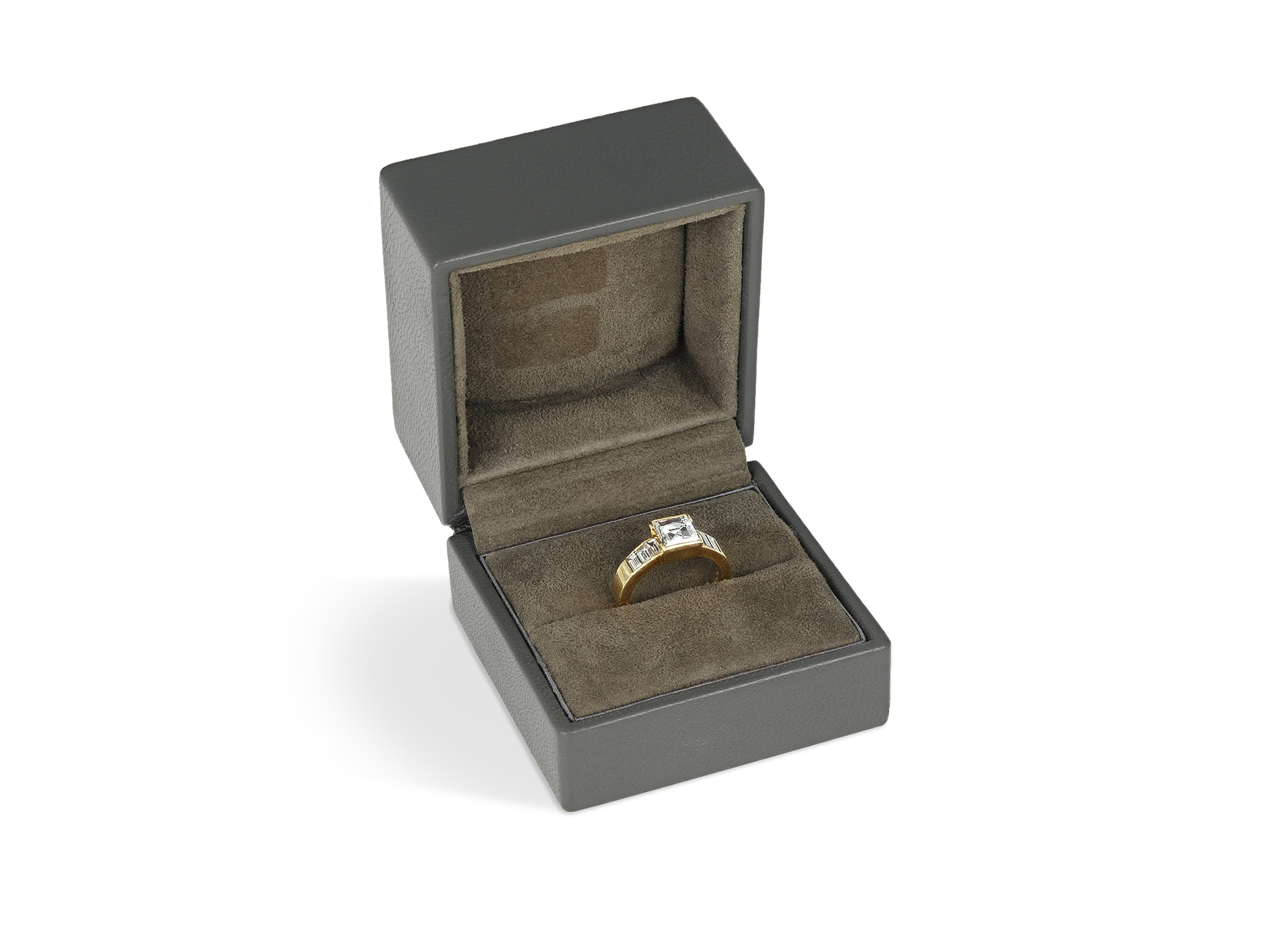 Square step cut flanked solitaire diamond ring. Centrally set with a square step-cut diamond with an approximate weight of 1.30 carats in an open back half rubover setting, flanked by six tapered baguette cut diamonds in open back half rubover and channel settings with a combined weight of 0.66 carats. The total approximate diamond weight is 1.96 carats, to an elegant flanked solitaire design with polished edges, a solid gallery and geometric open backholing, leading to slightly raised shoulders and flowing through to a solid flat shank. Marked 18 carat yellow gold, maker's mark 'AJLd' for Adler Jewellers, accompanied by original box, English, 1987.