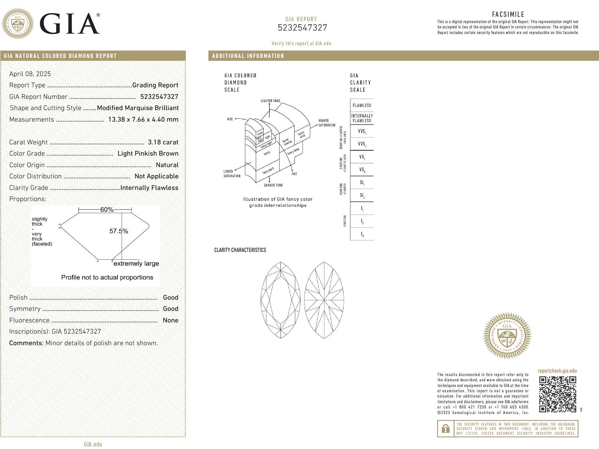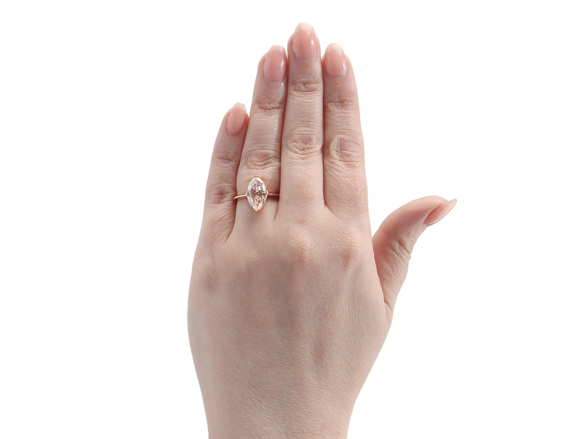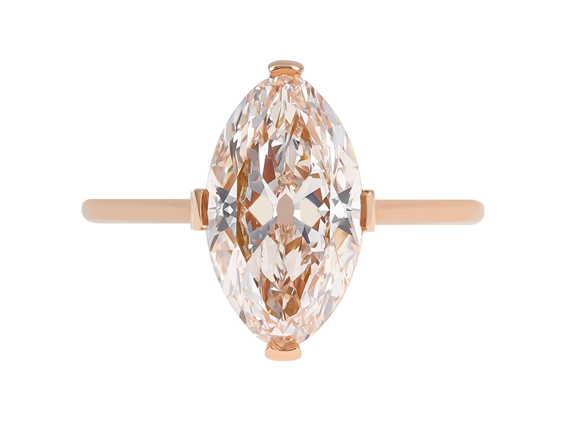 Type IIa light pinkish brown diamond solitaire ring. Set to centre with a type IIa marquise shape old cut diamond, natural light pinkish brown colour, IF clarity, with a weight of 3.18 carats, in an open back claw setting, to an elegant solitaire design featuring curving claws, polished edged and closed backholing, leading to inwardly tapering shoulders and flowing through to a solid D-shape shank. Tested rose gold, accompanied by Gemological Institute of America (GIA) report #5232547327 and GIA diamond classification report.