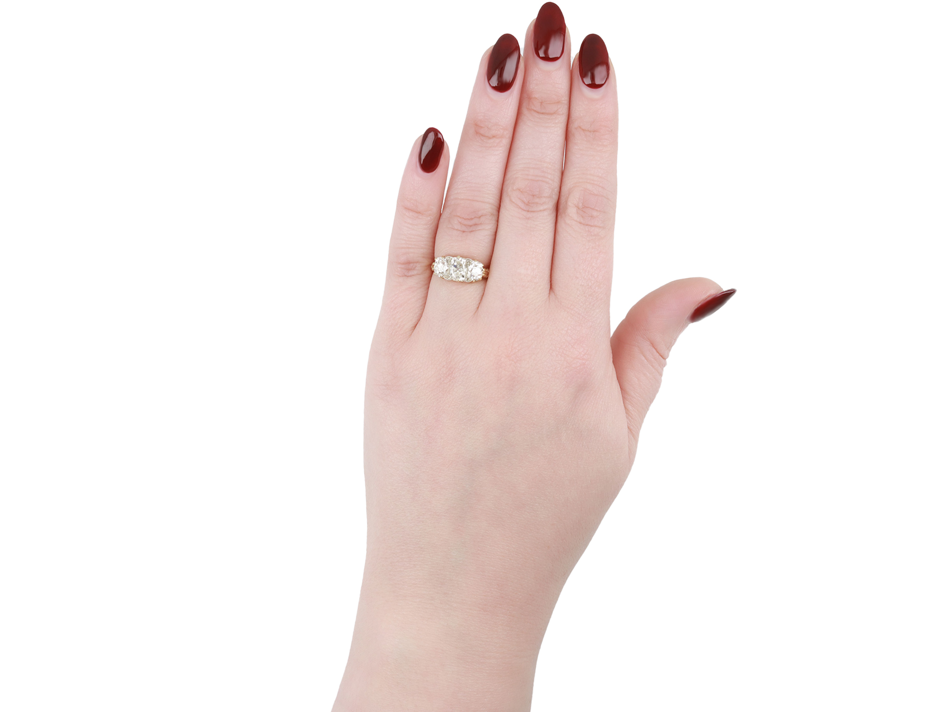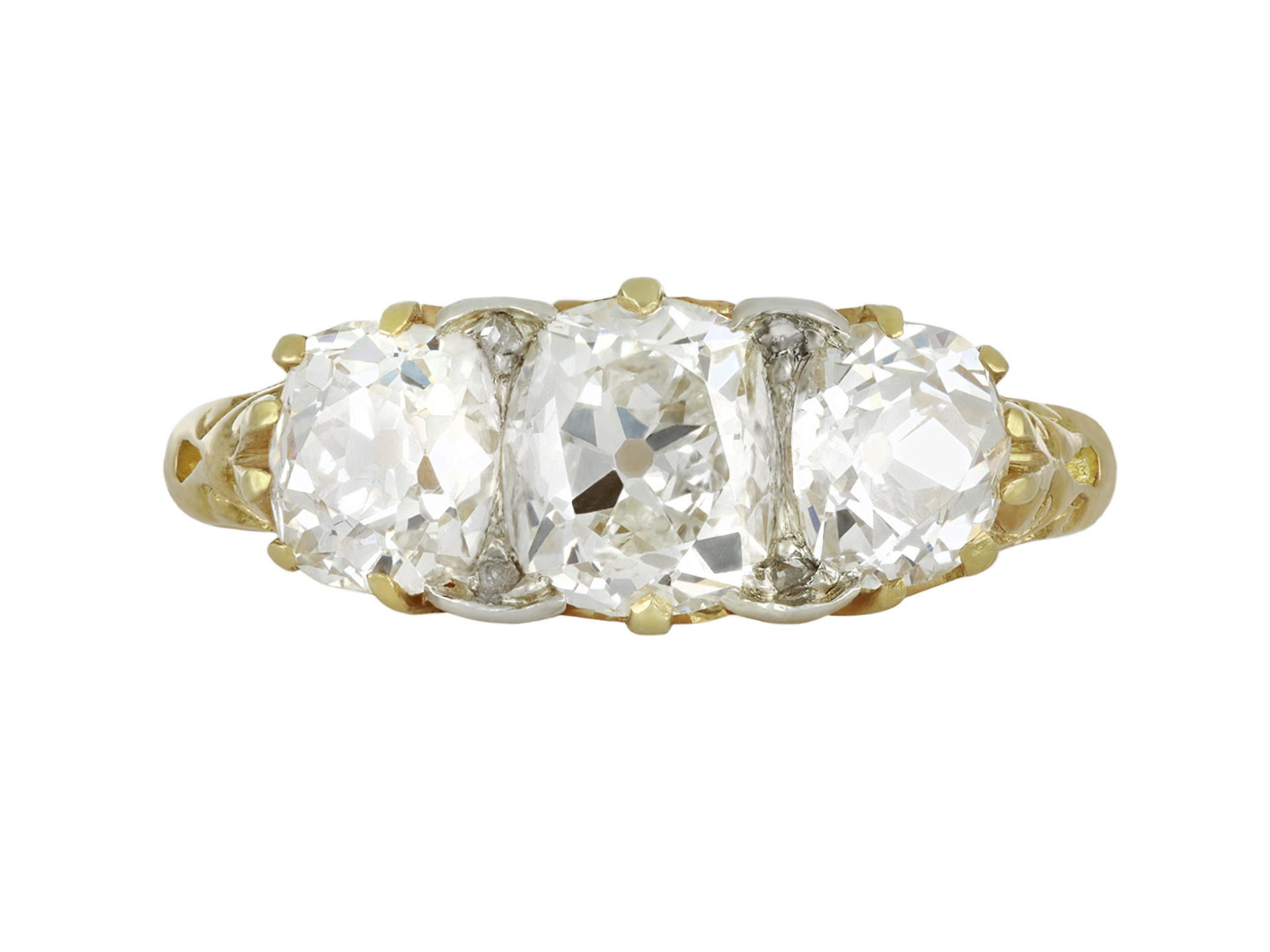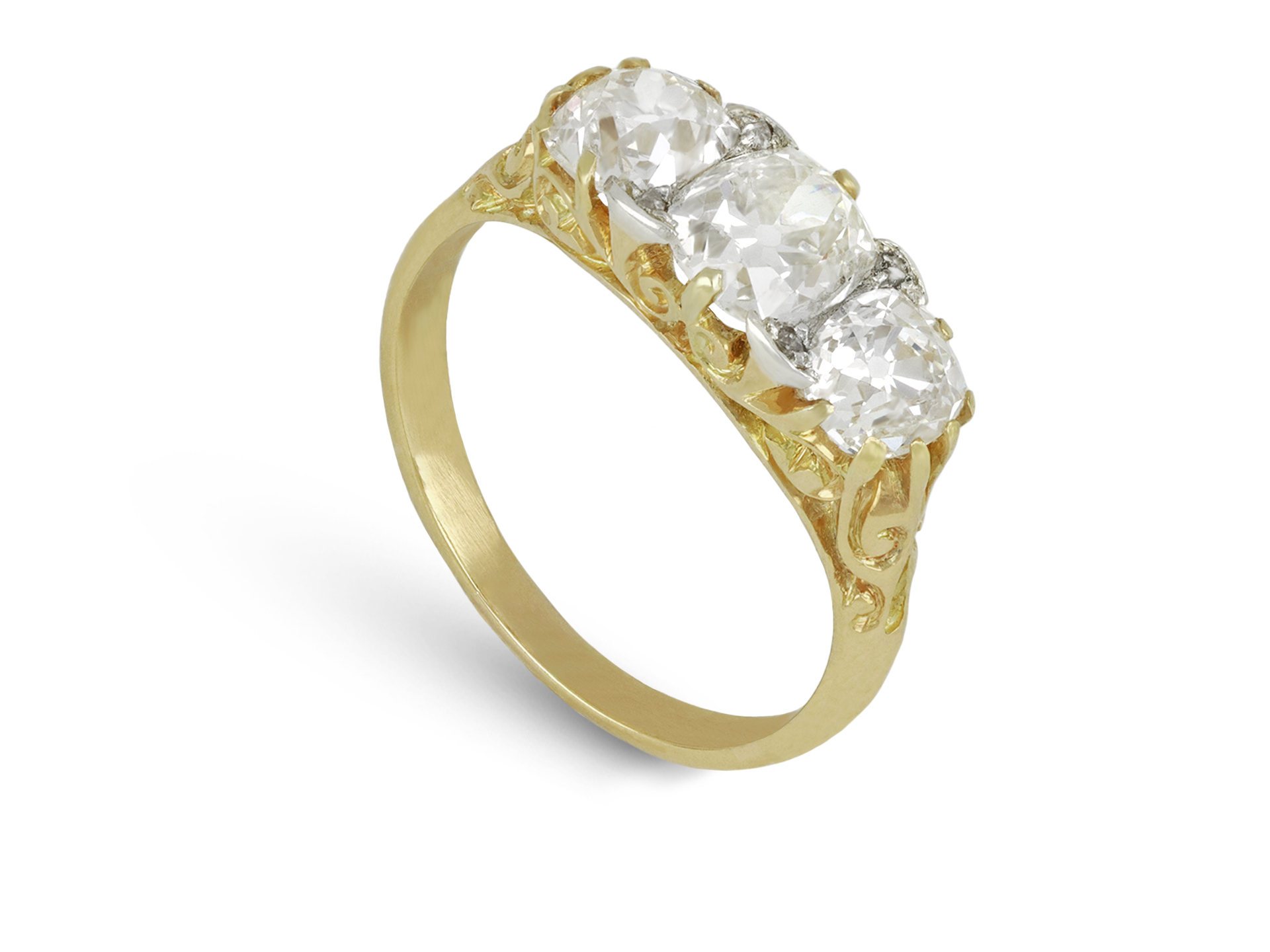 Victorian diamond three stone ring. Set centrally with a cushion shape old mine diamond in an open back claw and grain setting with an approximate weight of 0.80 carats, flanked by two cushion shape old mine diamonds in open back claw and grain settings with a combined weight of 1.25 carats and decorated with four round rose cut diamonds in closed back grain settings with a combined weight of 0.04 carats. The total approximate diamond weight is 2.09 carats, to an ornate carved design with curving claws, scrolling motifs and fancy shape open backholing, leading to carved shoulders which flow through to a solid D-shape shank. Tested yellow gold with silver settings, circa 1890.