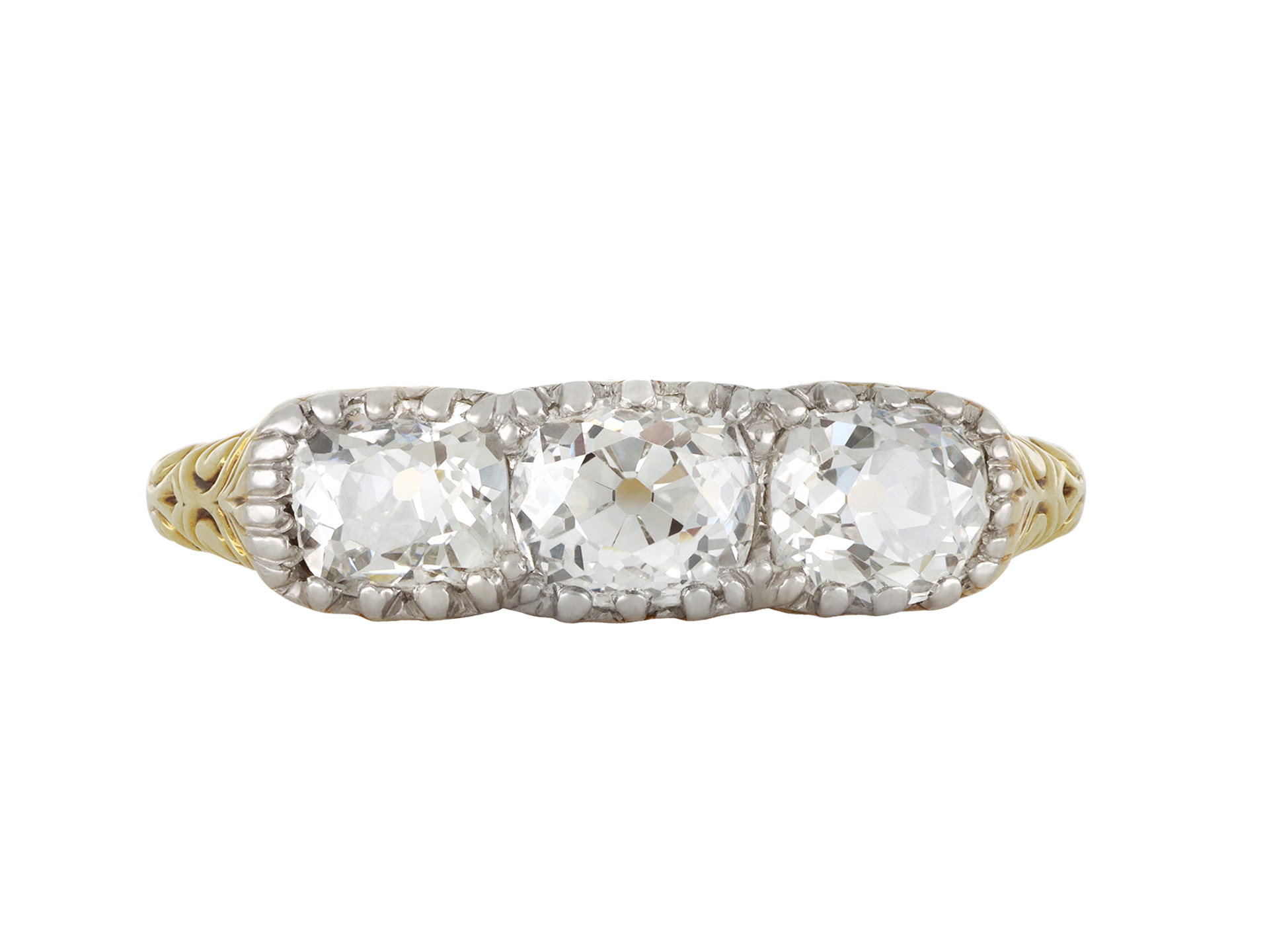 Old mine diamond three stone ring. Set to centre with a cushion shape old mine diamond in an open back claw and grain setting with an approximate weight of 0.65 carats, flanked by two cushion shape old mine diamonds in open back claw and grain settings with a combined weight of 0.90 carats. The total approximate diamond weight is 1.55 carats, all to an impressive three stone design featuring curving claws, an intricately pierced gallery and fancy open backholing, leading to trumpeting carved shoulders with scrolling motifs and flowing through to a solid D-shape shank. Stamped '585' for 14 carat gold and settings tested silver and platinum, features a maker's mark 'KM', European, circa 1900.