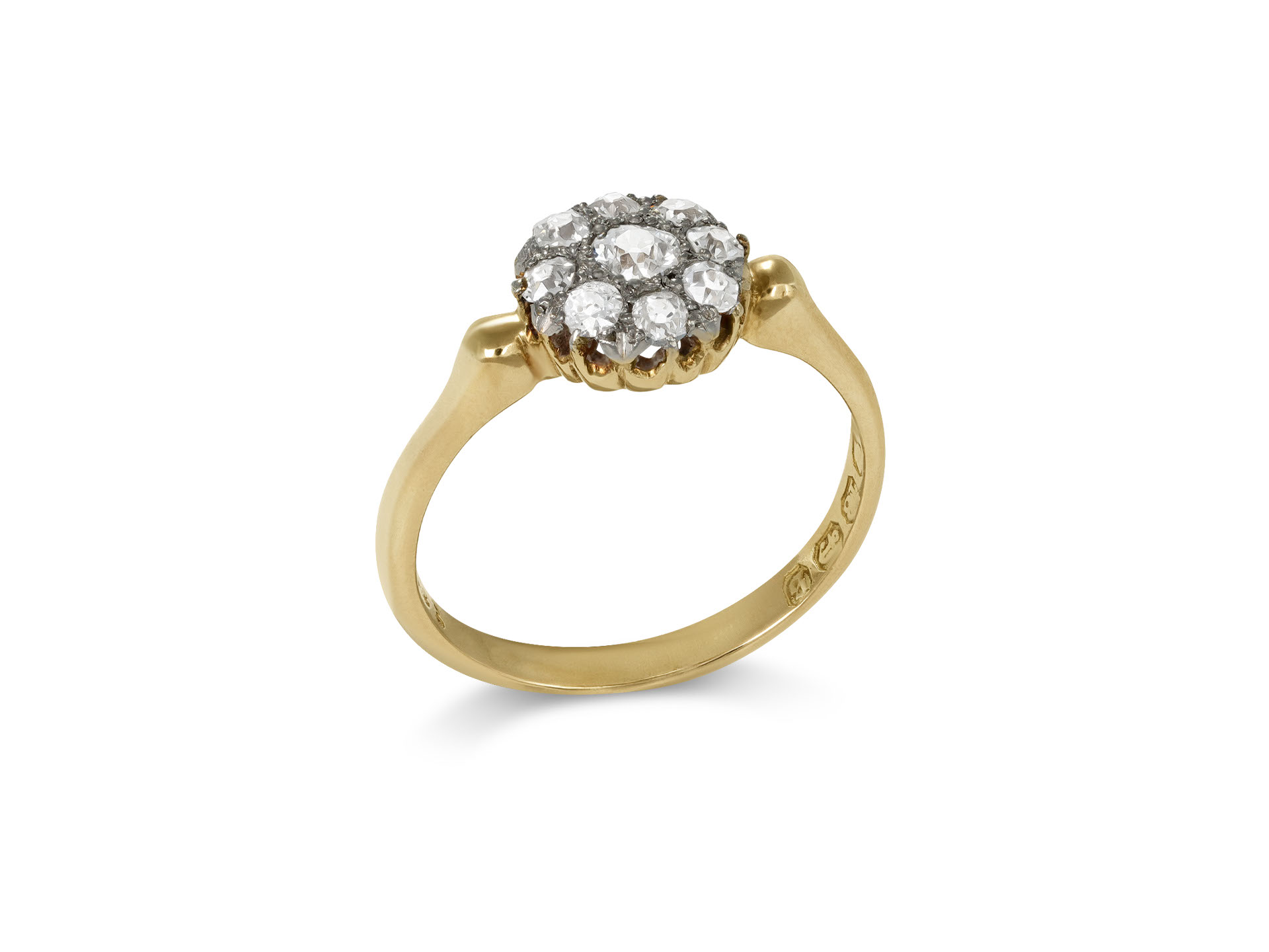 Victorian diamond coronet cluster ring. Set to centre with a cushion shape old mine diamond in an open back grain setting with an approximate weight of 0.20 carats, surrounded by eight cushion shape old mine diamonds in open back claw and grain settings, with a combined weight of 0.40 carats. The total approximate diamond weight is 0.60 carats, to an elegant coronet cluster design, featuring curving claws, a pierced gallery and open backholing, the stylised shoulders flowing through to a solid D-shaped shank. Marked 18 carat yellow gold, settings tested platinum, numbered '2585', full hallmarks for Birmingham, English, 1892.