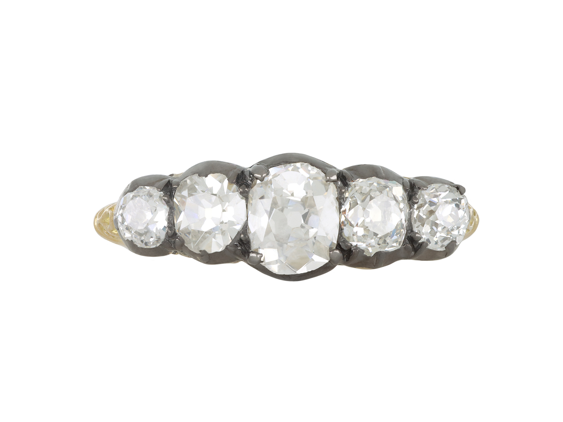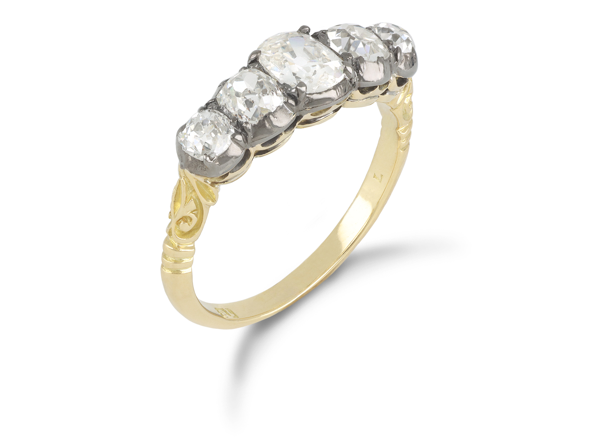 Victorian diamond five stone ring. Horizontally set with five cushion shape old mine diamonds in open back cut-down settings with a combined approximate weight of 1.75 carats, to an impressive five stone design featuring curving claws, an ornately pierced gallery and fancy open backholing, the intricately carved shoulders flow through to a solid D-shape shank. Tested yellow gold and silver, English, circa 1880.