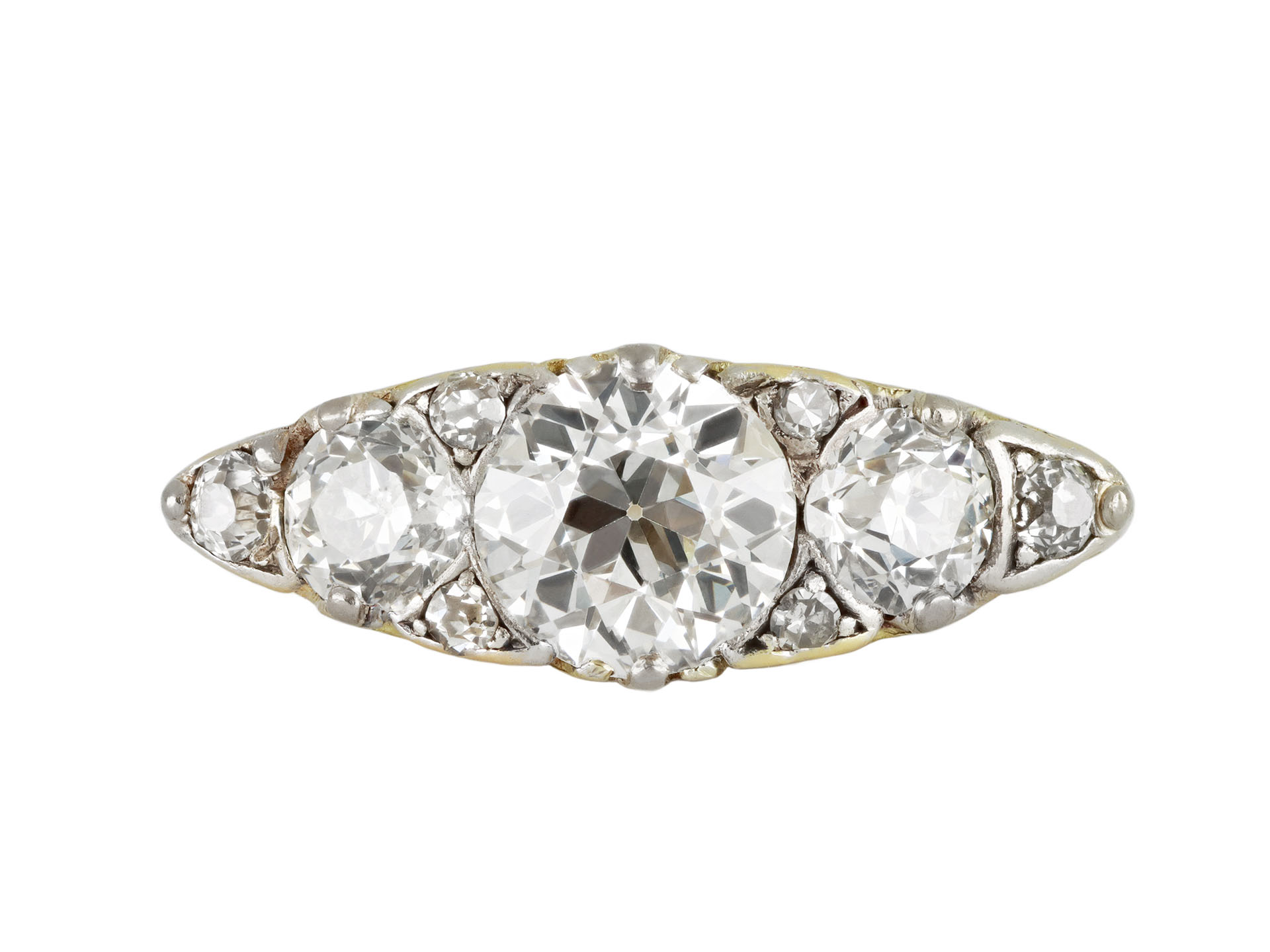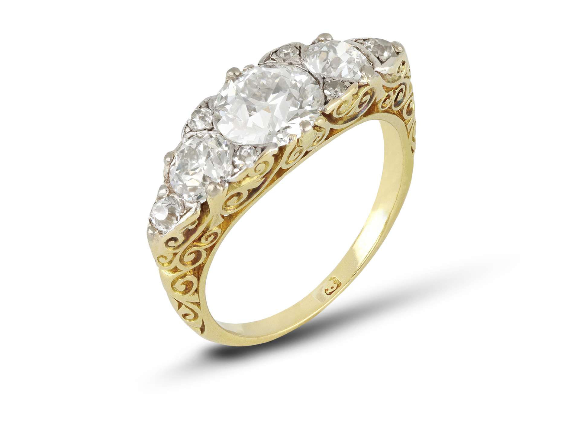 Victorian diamond five stone ring. Set to centre with a round old cut diamond in open back claw and grain settings with an approximate weight of 1.45 carats, further set with four round old cut diamonds in open back claw and grain settings with a combined weight of 0.85 carats, further decorated with four round eight-cut diamonds in closed back grain and rubover settings with a combined weight of 0.05 carats. The total approximate diamond weight is 2.35 carats, to an exceptional graduated five stone carved ring featuring stylised claws, an ornate gallery with scrolling motifs and open and closed backholing, leading to carved shoulders which flow through to a solid D-shape shank. Partial mark for 18 carat yellow gold and settings tested silver, numbered '3158', circa 1890.