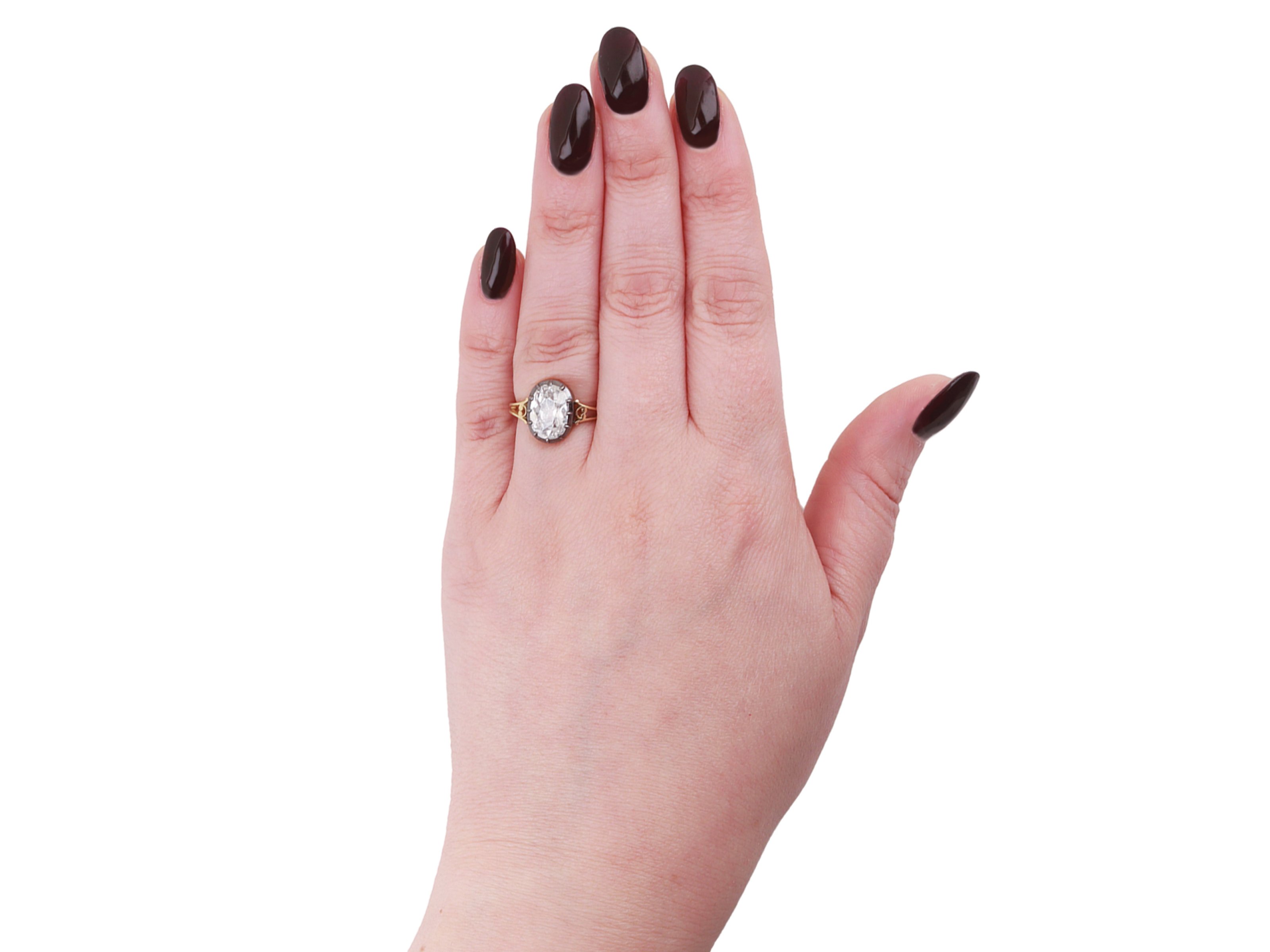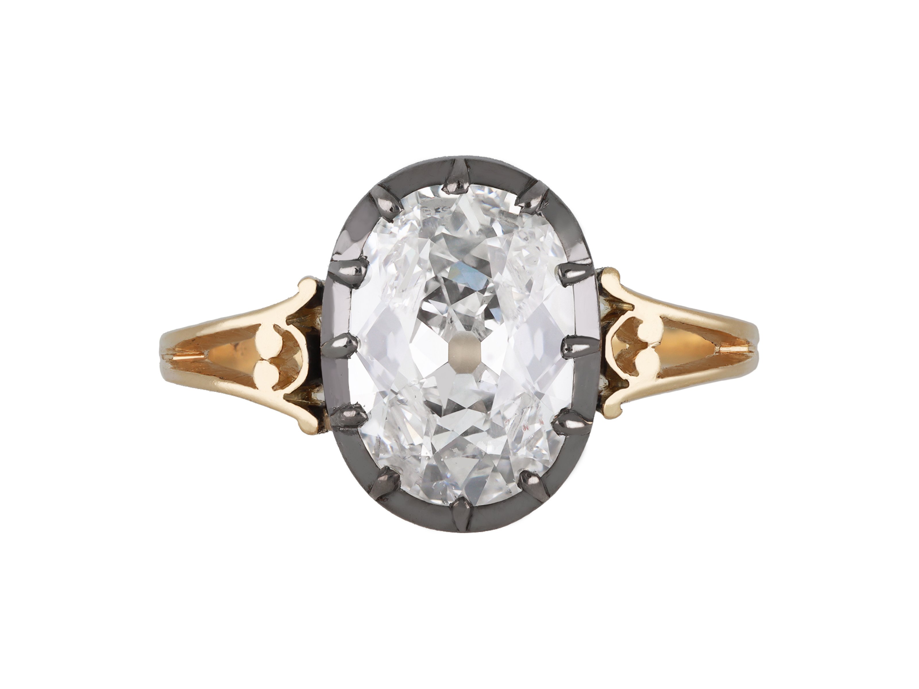 Victorian diamond solitaire ring. Set with a single oval old mine diamond in an open back cut-down setting with an approximate weight of 2.15 carats, to a solitaire design featuring curving claws, a polished gallery and open backholing, leading to split shoulders with a scrolling motif and flowing through to a solid D-shape shank. Marked 18 carat yellow gold and tested silver, circa 1880.