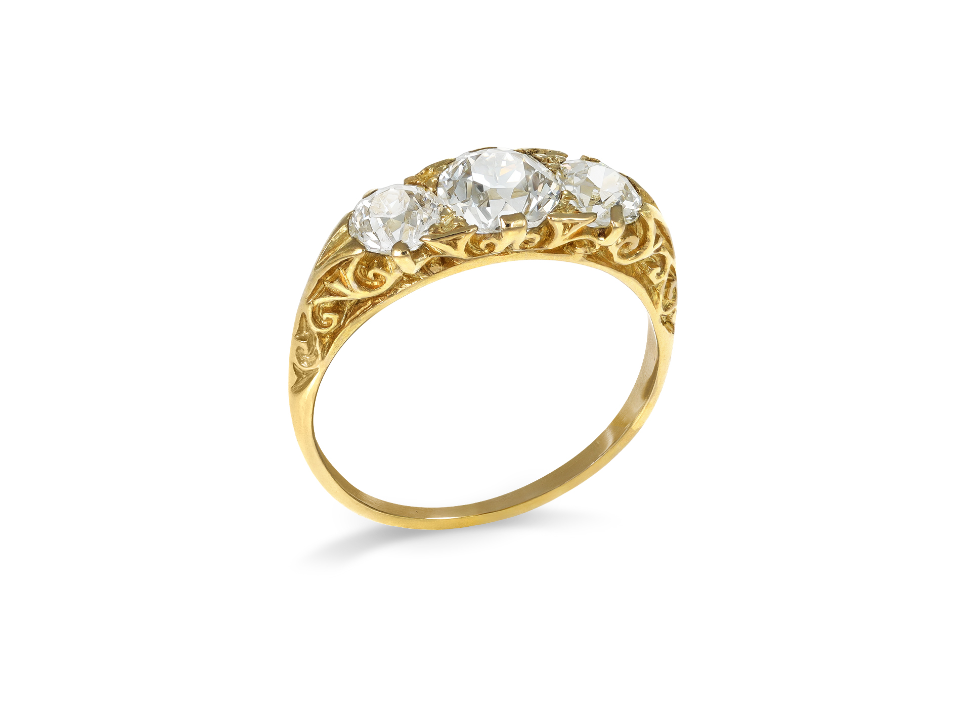 Victorian diamond three stone ring. Set centrally with a cushion shape old mine diamond in an open back claw and grain setting with an approximate weight of 0.95 carats, flanked by two cushion shape old mine diamonds in open back claw and grain settings with a combined weight of 0.80 carats. The total approximate diamond weight is 1.75 carats, to an ornate carved design with curving claws, scrolling motifs and fancy shape open backholing, leading to carved shoulders which flow through to a solid D-shape shank. Tested yellow gold, English, circa 1890.