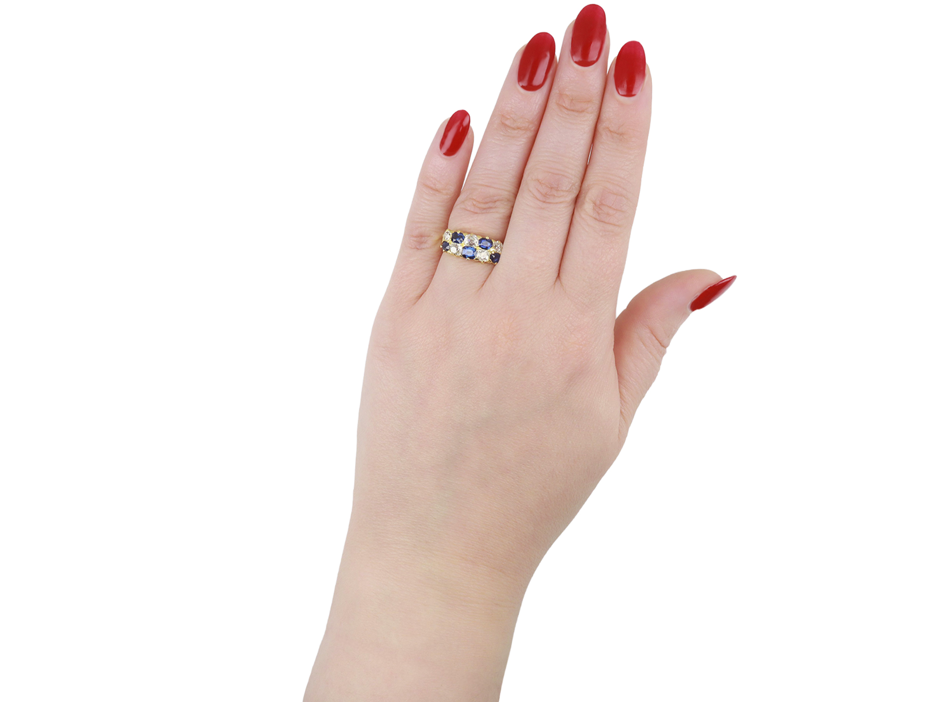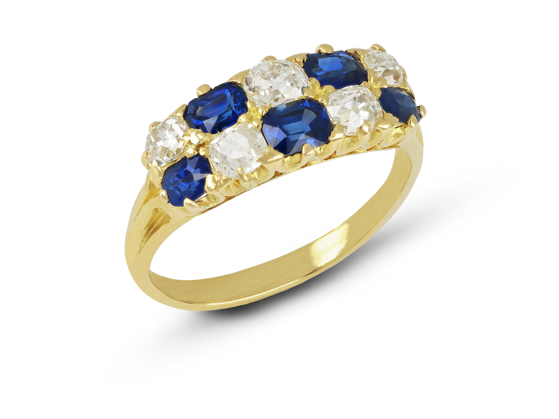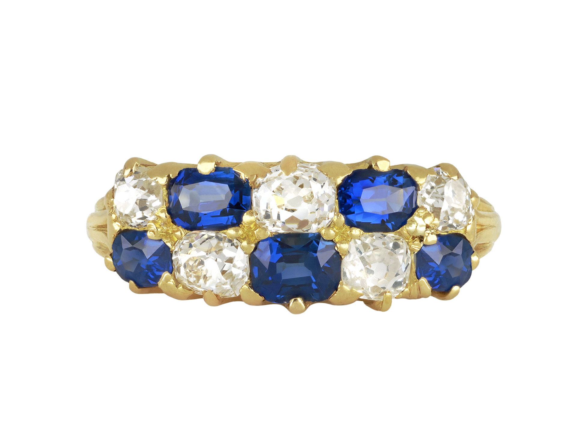 Victorian sapphire and diamond ring. Set with five cushion shape old cut natural unenhanced sapphires in open back grain and claw settings with an approximate combined weight of 1.35 carats, alternated by five cushion shape old mine diamonds in open back grain and claw settings with an approximate combined weight of 1.10 carats, to an impressive double row cluster design, with a pierced gallery and fancy open backholing, leading to trumpeting shoulders with ridged detail flowing through to a solid D-shape shank. Tested yellow gold, circa 1890.