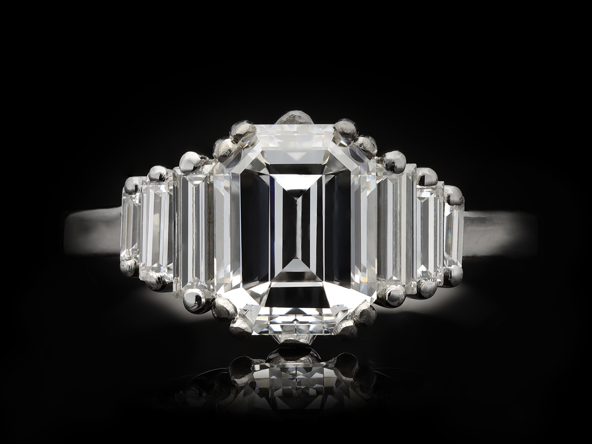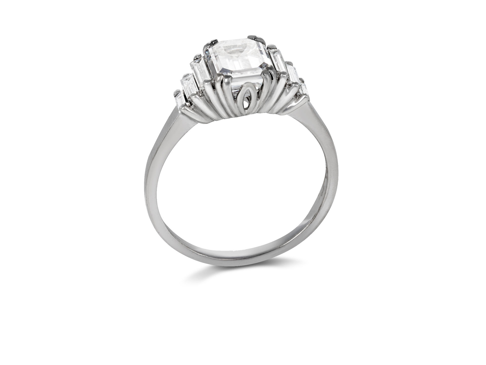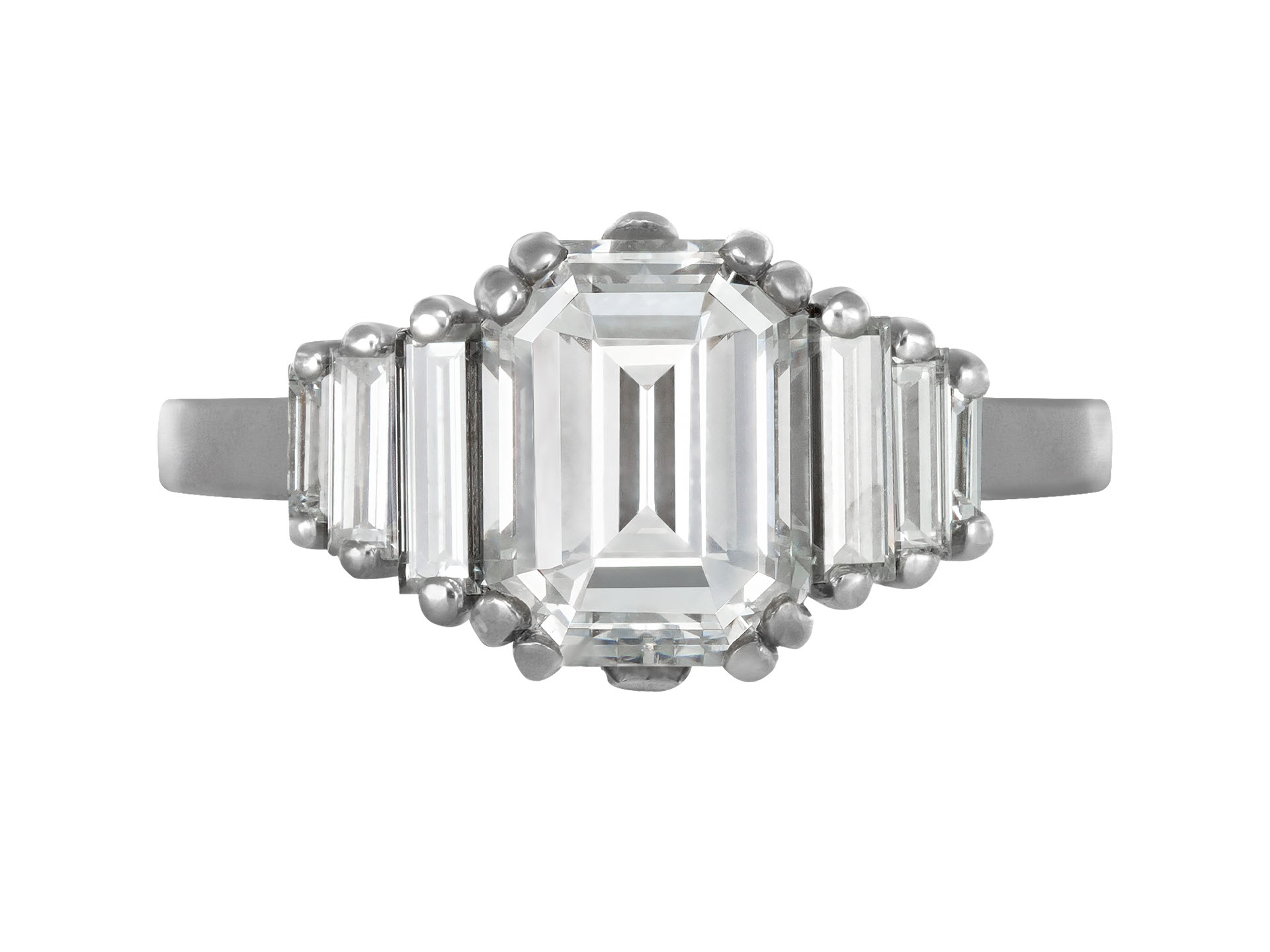 Vintage Diamond flanked solitaire ring. Set to centre with an octagonal step-cut diamond, E colour, VVS2 clarity with a weight of 1.91 carats in an open back claw setting, flanked by six rectangular baguette cut diamonds in open back claw settings with a combined weight of 0.62 carats. The total approximate diamond weight is 2.52 carats, to a geometric graduating flanked solitaire design featuring split corner claws, a decorative pierced structural gallery and open backholing, leading to smooth shoulders and flowing through to a solid flat shank. Marked 18 carat white gold, circa 1970, accompanied by Gemological Institute of America (GIA) report #2235502235.