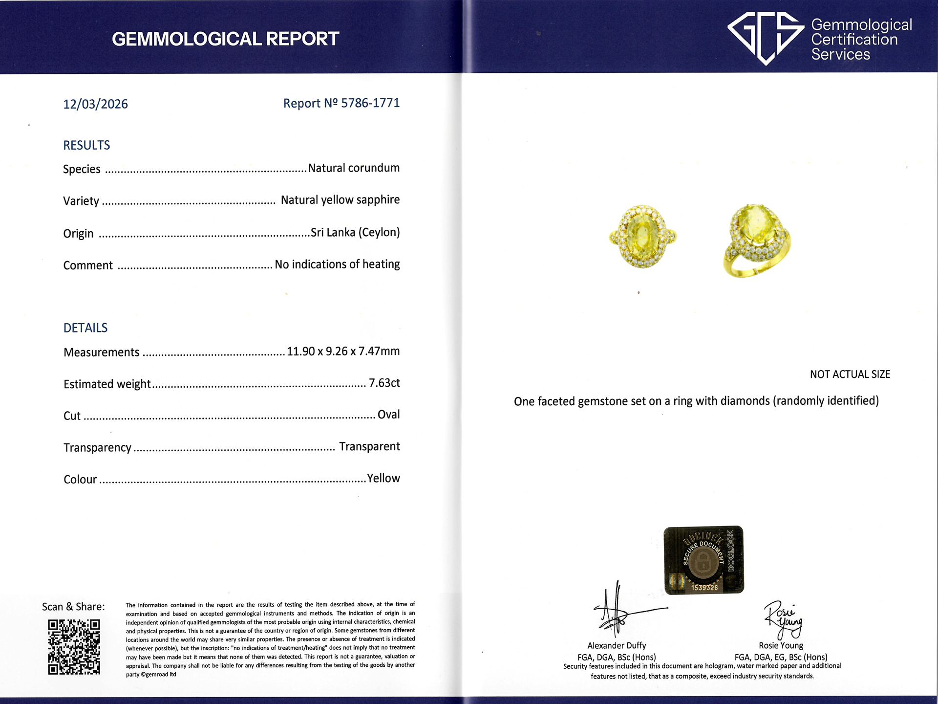 Gemstone Yellow Sapphire, Mixed Cut, 7.62ct 78 x Diamonds, Brilliant Cut, approximately 1.5ct total