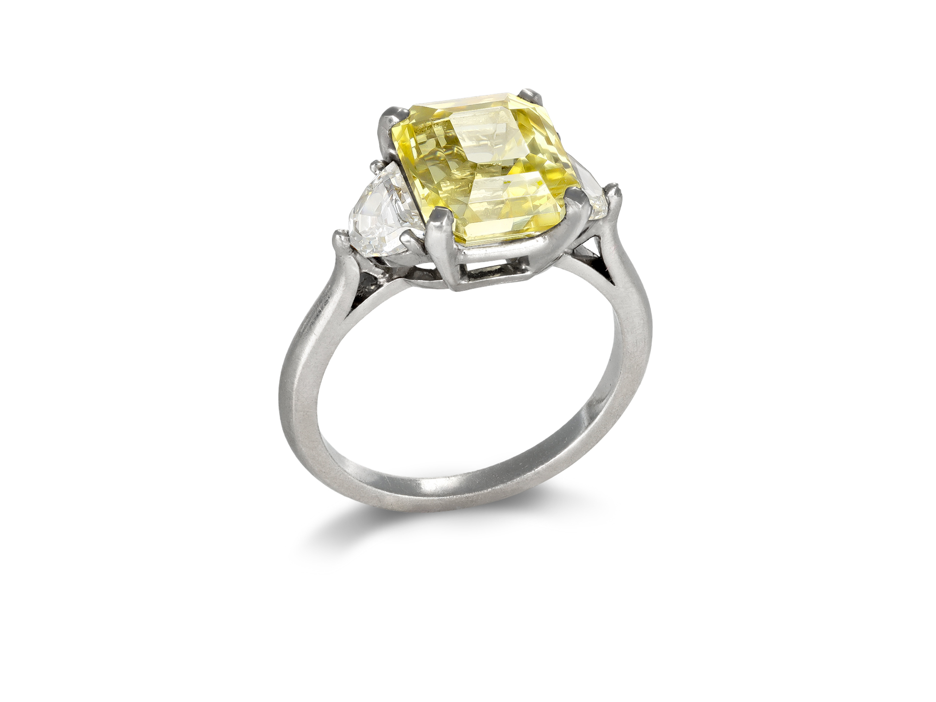 Yellow Ceylon sapphire and diamond flanked solitaire ring. Set to centre with an octagonal emerald-cut natural no heat yellow Ceylon sapphire in an open back claw setting with an approximate weight of 5.03 carats, flanked by two half moon shape mixed cut diamonds in open back claw settings with a combined approximate weight of 0.70 carats, to an impressive flanked solitaire design featuring curving claws and polished edges, a pierced gallery and geometric open backholing, leading to inwardly tapering raised shoulders which flow through to a solid D-shape shank. Tested platinum, accompanied by Gemmological Certification Services report #5786-1965.