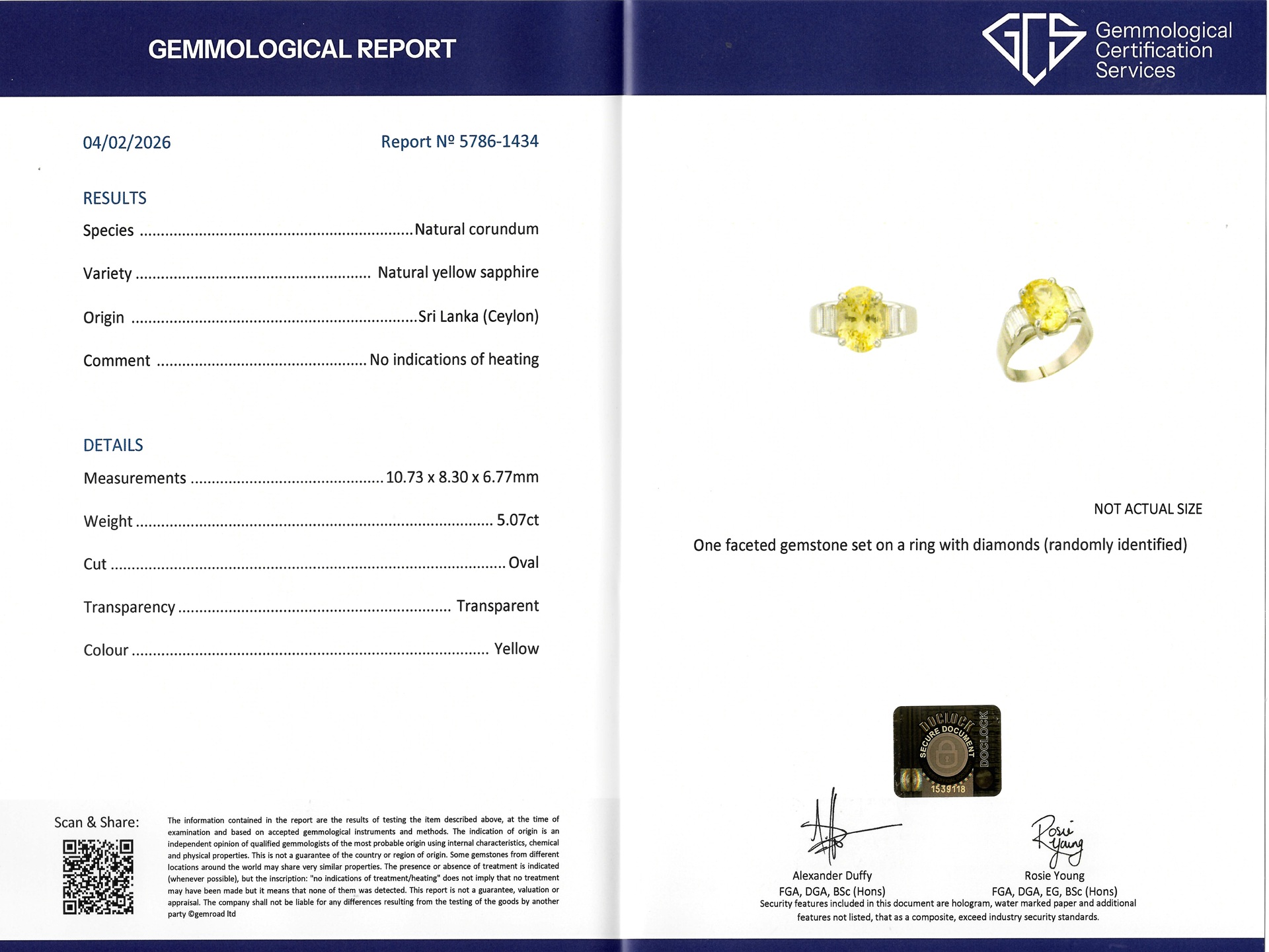 Gemstone Ceylon Yellow Sapphire, Brilliant Cut, 5.07ct 8 x Diamonds, Baguette Cut, approximately 0.9ct total