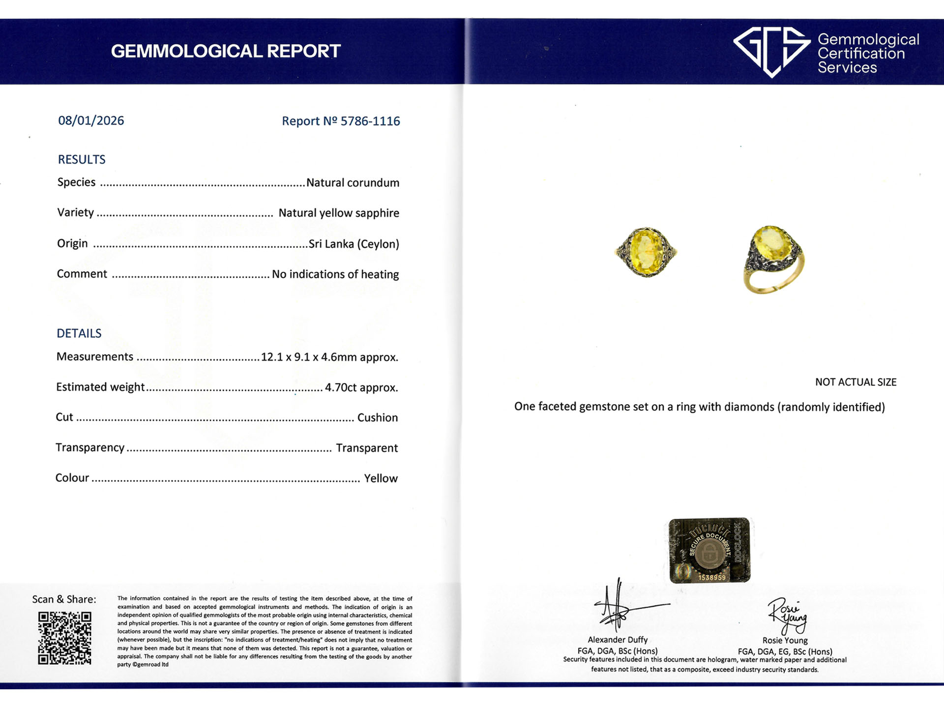 Yellow sapphire cluster ring. Centrally set with an oval shape old cut natural no heat yellow sapphire in an open back claw setting with an approximate weight of 4.70 carats, adorned forty-two round rose cut diamonds in closed back grain settings with an approximate weight of 0.42 carats to an impressive cluster design featuring millegrain edging, intricate openwork, and open and closed backholing, leading to integrated shoulders with ridged detailing which flow through to a solid D-shape shank. Tested rose gold and silver, Italian, circa 1900, accompanied by Gemmological Certification Services report #5786-1116.