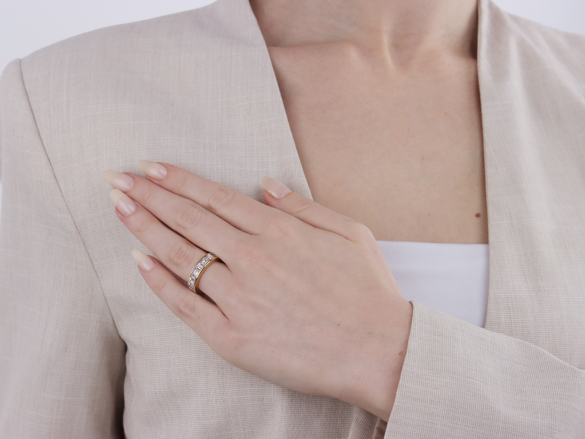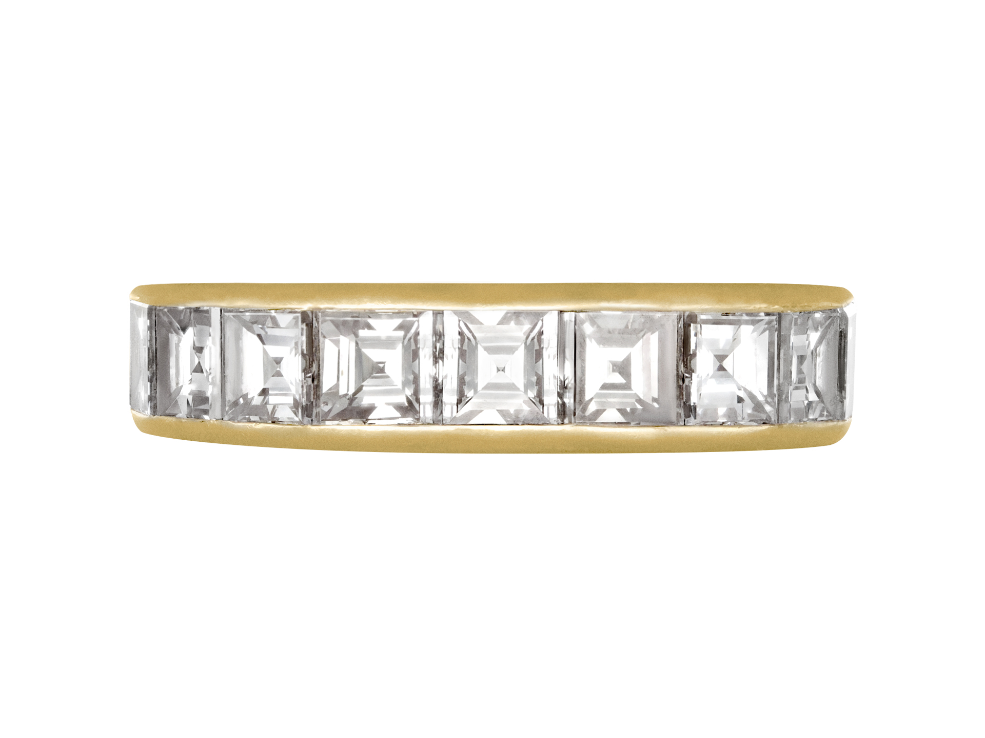 Cartier London diamond eternity ring. Set with eighteen square step-cut diamonds in open back channel settings with a combined approximate weight of 4.85 carats, to a smoothly conforming full eternity ring with polished edges and square open backholing, approximately 5mm in width. Marked 18 carat yellow gold, maker's mark 'JC', signed 'Cartier', numbered 'HLS02587', full hallmarks for London, English, 2002.