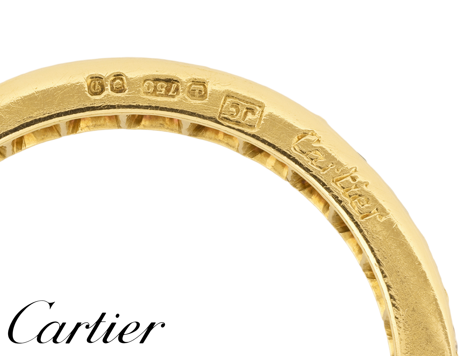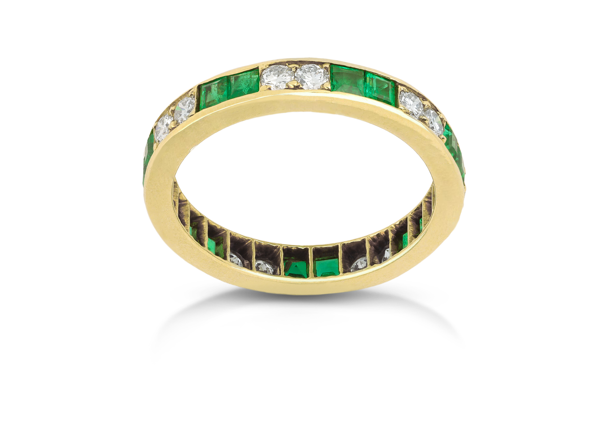 Cartier London emerald and diamond eternity band. Set with fourteen square step-cut natural emeralds in open back rubover settings with a combined approximate weight of 0.84 carats, alternated by fourteen round brilliant cut diamonds in open back grain settings with a combined approximate weight of 0.56 carats, to a striking full eternity ring featuring smooth polished edges, a smooth solid gallery and intricately pierced geometric backholing, approximately 3.0mm in width. Marked 18 carat yellow gold, maker's mark 'JC', signed Cartier, full hallmarks for London, English, 1978.