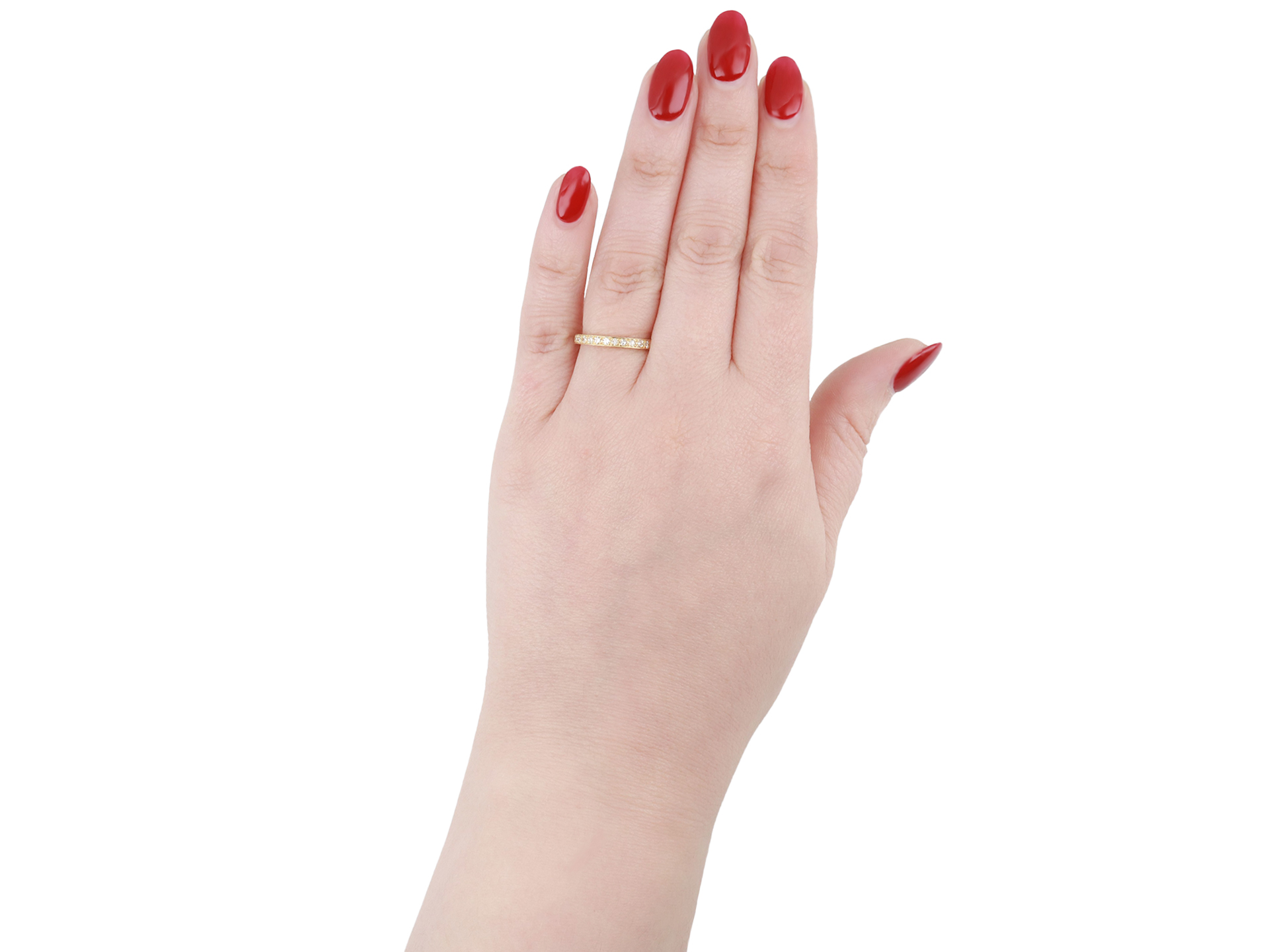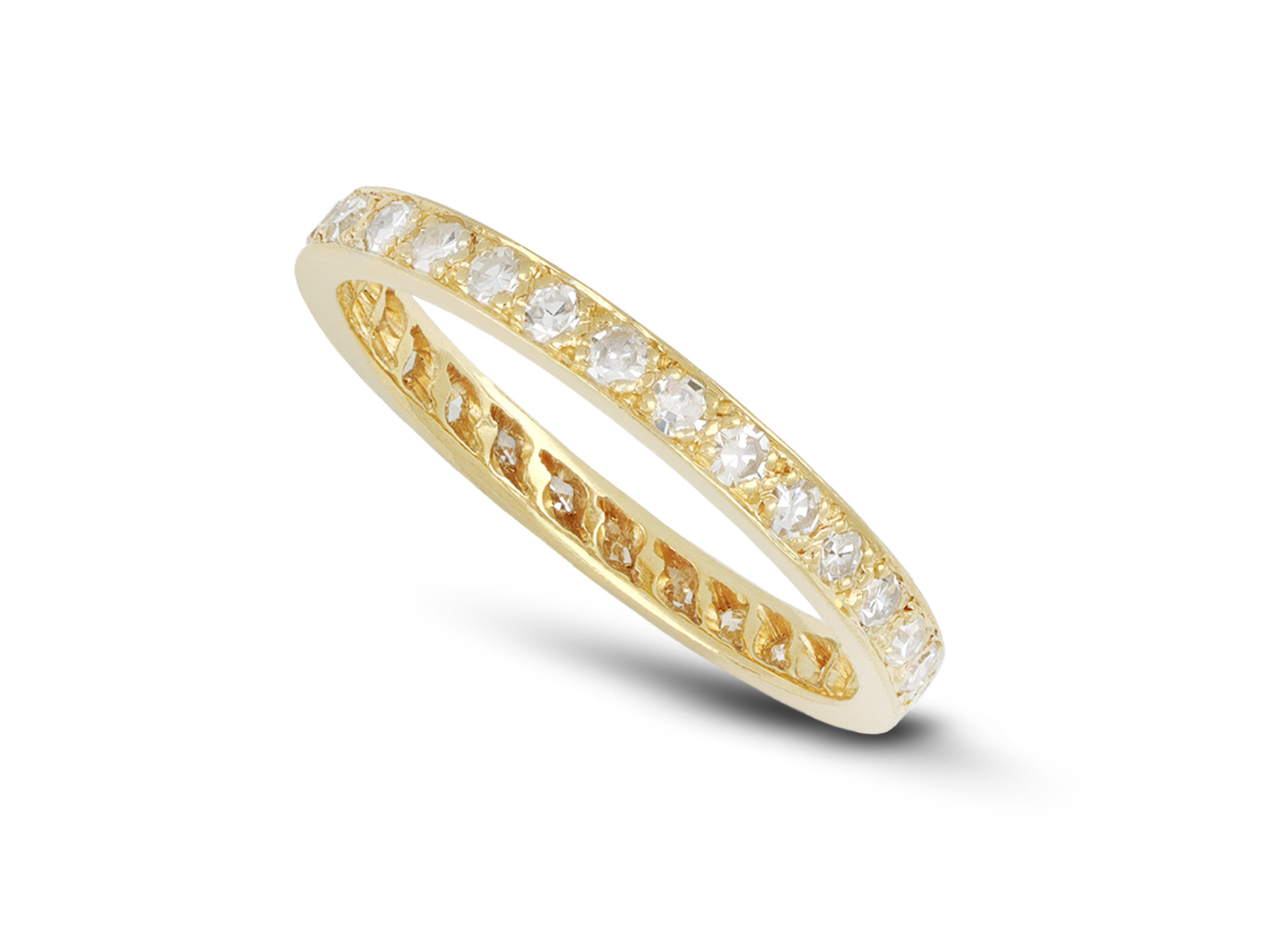 Diamond eternity ring. Full eternity band set with twenty nine round eight-cut diamonds in open back grain settings with an approximate combined weight of 0.58 carats, to a full eternity band featuring polished edges, a solid gallery and rope open backholing, approximately 2.2mm in width. Tested 18 carat yellow gold, circa 1950.